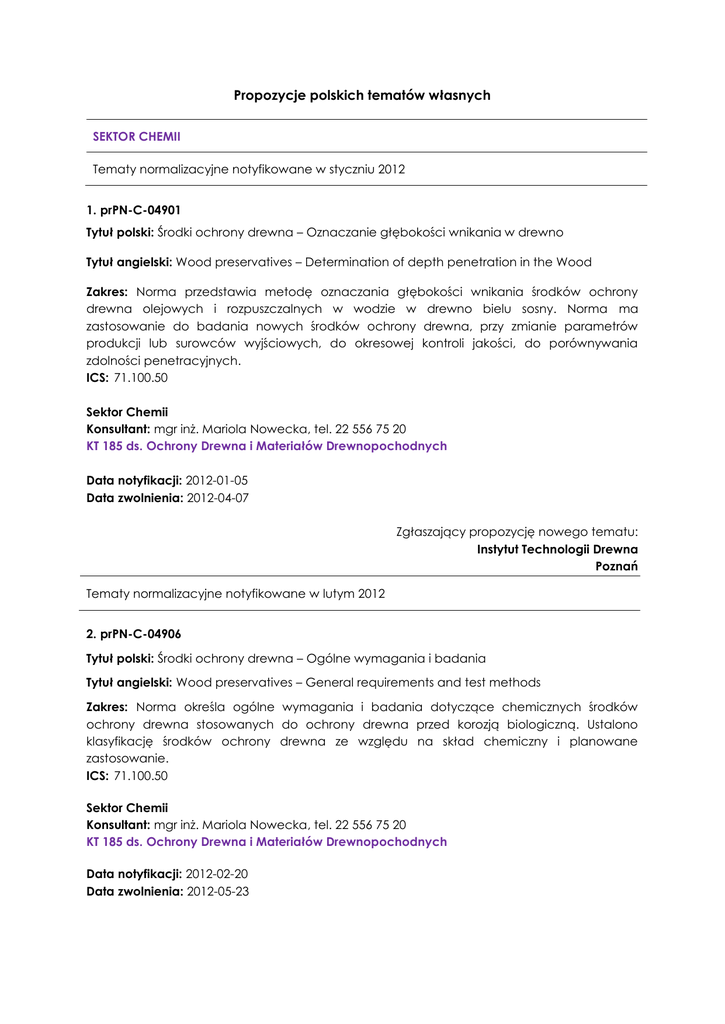 Propozycje polskich tematów własnych SEKTOR CHEMII Tematy normalizacyjne notyfikowane w styczniu 2012 1. prPN-C-04901 Tytuł polski: Środki ochrony drewna – Oznaczanie głębokości wnikania w drewno Tytuł angielski: Wood preservatives – Determination of depth penetration in the Wood Zakres: Norma przedstawia metodę oznaczania głębokości wnikania środków ochrony drewna olejowych i rozpuszczalnych w wodzie w drewno bielu sosny. Norma ma zastosowanie do badania nowych środków ochrony drewna, przy zmianie parametrów produkcji lub surowców wyjściowych, do okresowej kontroli jakości, do porównywania zdolności penetracyjnych. ICS: 71.100.50 Sektor Chemii Konsultant: mgr inż. Mariola Nowecka, tel. 22 556 75 20 KT 185 ds. Ochrony Drewna i Materiałów Drewnopochodnych Data notyfikacji: 2012-01-05 Data zwolnienia: 2012-04-07 Zgłaszający propozycję nowego tematu: Instytut Technologii Drewna Poznań Tematy normalizacyjne notyfikowane w lutym 2012 2. prPN-C-04906 Tytuł polski: Środki ochrony drewna – Ogólne wymagania i badania Tytuł angielski: Wood preservatives – General requirements and test methods Zakres: Norma określa ogólne wymagania i badania dotyczące chemicznych środków ochrony drewna stosowanych do ochrony drewna przed korozją biologiczną. Ustalono klasyfikację środków ochrony drewna ze względu na skład chemiczny i planowane zastosowanie. ICS: 71.100.50 Sektor Chemii Konsultant: mgr inż. Mariola Nowecka, tel. 22 556 75 20 KT 185 ds. Ochrony Drewna i Materiałów Drewnopochodnych Data notyfikacji: 2012-02-20 Data zwolnienia: 2012-05-23 Zgłaszający propozycję nowego tematu: Instytut Technologii Drewna Poznań 3. prPN-C-04375-1 Tytuł polski: Badanie stałych i ciekłych paliw – Oznaczanie ciepła spalania w bombie kalorymetrycznej i obliczanie wartości opałowej – Część 1: Postanowienia ogólne, aparatura, metody Tytuł angielski: Testing of solid and liquid fuels – Determining the gross calorific value using the bomb calorimeter, and calculation of net calorific value – Part 1: General information, apparatus, methods Zakres: W niniejszej normie określono metodę oznaczania ciepła spalania paliw stałych i ciekłych w bombie kalorymetrycznej oraz sposób obliczania wartości opałowej tych paliw. Jej ustalenia mogą odnosić się również do innych materiałów stałych i ciekłych. Wyznaczone przy pomocy niniejszej normy wartości ciepła spalania i wartości opałowej służą np. do obliczenia bilansów energetycznych. Są również podstawą przy ustalaniu cen. W przypadku paliw wartości liczbowe odnoszą się do ciepła spalania Ho,v, ustalonego przy stałej objętości, ewentualnie do wartości opałowej obliczonej dla stałego ciśnienia Hu,p. ICS: 75.080 Sektor Chemii Konsultant: mgr inż. Magdalena Wienczatek, tel. 22 556 75 19 KT 222 ds. Przetworów Naftowych i Cieczy Eksploatacyjnych Data notyfikacji: 2012-02-09 Data zwolnienia: 2012-05-12 Zgłaszający propozycję nowego tematu: Instytut Nafty i Gazu Kraków 4. prPN-C-04375-2 Tytuł polski: Badanie stałych i ciekłych paliw – Oznaczanie ciepła spalania w bombie kalorymetrycznej i obliczanie wartości opałowej – Część 2: Metoda z zastosowaniem kalorymetru izoperibolicznego lub kalorymetru z płaszczem statycznym Tytuł angielski: Testing of solid and liquid fuels – Determining the gross calorific value by the bomb calorimeter and calculation of net calorific value – Part 2: Method using the isoperibol or static-jacket calorimeter Zakres: W niniejszej normie określono metodę oznaczania ciepła spalania paliw stałych i ciekłych w bombie kalorymetrycznej z zastosowaniem kalorymetru izoperibolicznego lub kalorymetru z płaszczem statycznym oraz obliczania wartości opałowej tych paliw. Metodę można również stosować do innych materiałów stałych i ciekłych. ICS: 75.080 Sektor Chemii Konsultant: mgr inż. Magdalena Wienczatek, tel. 22 556 75 19 KT 222 ds. Przetworów Naftowych i Cieczy Eksploatacyjnych Data notyfikacji: 2012-02-09 Data zwolnienia: 2012-05-12 Zgłaszający propozycję nowego tematu: Instytut Nafty i Gazu Kraków 5. prPN-C-04375-3 Tytuł polski: Badanie paliw stałych i ciekłych – Oznaczanie ciepła spalania w bombie kalorymetrycznej i obliczanie wartości opałowej – Część 3: Metoda z zastosowaniem kalorymetru z płaszczem adiabatycznym Tytuł angielski: Testing of solid and liquid fuels – Determination of gross calorific value by the bomb calorimeter and calculation of net calorific value – Part 3: Method using adiabatic jacket Zakres: W niniejszej normie opisano metodę oznaczania ciepła spalania w bombie kalorymetrycznej z regulowanym lub statycznym płaszczem adiabatycznym oraz obliczania wartości opałowej paliw stałych i ciekłych. Może być stosowana również do innych, stałych lub ciekłych, materiałów. ICS: 75.080 Sektor Chemii Konsultant: mgr inż. Magdalena Wienczatek, tel. 22 556 75 19 KT 222 ds. Przetworów Naftowych i Cieczy Eksploatacyjnych Data notyfikacji: 2012-02-09 Data zwolnienia: 2012-05-12 Zgłaszający propozycję nowego tematu: Instytut Nafty i Gazu Kraków SEKTOR GÓRNICTWA Tematy normalizacyjne notyfikowane w styczniu 2012 1. prPN-G-15020 Tytuł polski: Obudowa górniczych wyrobisk z kształtowników korytkowych – Terminologia Tytuł angielski: korytarzowych – Odrzwia podatne Roadway support in mines – Yielding channel section frames – Terminology Zakres: W niniejszej normie zawarto terminy dotyczące obudowy górniczych wyrobisk korytarzowych odrzwiami podatnymi z kształtowników korytkowych, w tym związane z podstawowymi elementami obudowy takimi jak odrzwia łukowe i stosowane do ich wytwarzania kształtowniki oraz terminy dotyczące elementów pomocniczych takich jak stopy podporowe, rozpory stalowe i inne. Podano ponad 40 definicji w przedmiotowym zakresie. ICS: 73.100.01 Sektor Górnictwa Konsultant: mgr inż. Tomasz Henryk Mazur, tel. 32 359 79 63 KT 275 ds. Techniki 