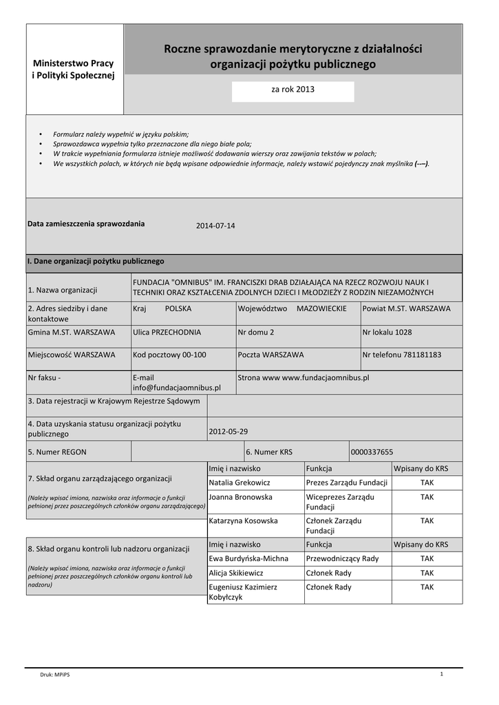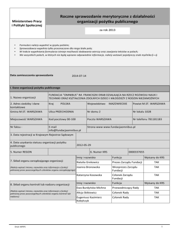 ZŽĐnjŶĞƐƉƌĂǁŽnjĚĂŶŝĞŵĞƌLJƚŽƌLJĐnjŶĞnjĚnjŝĂųĂůŶŽƑĐŝ ŽƌŐĂŶŝnjĂĐũŝƉŽǏLJƚŬƵƉƵďůŝĐnjŶĞŐŽ Ministerstwo Pracy ŝWŽůŝƚLJŬŝ^ƉŽųĞĐnjŶĞũ za rok 2013 • • • • &ŽƌŵƵůĂƌnjŶĂůĞǏLJǁLJƉĞųŶŝđǁũħnjLJŬƵƉŽůƐŬŝŵ͖ ^ƉƌĂǁŽnjĚĂǁĐĂǁLJƉĞųŶŝĂƚLJůŬŽƉƌnjĞnjŶĂĐnjŽŶĞĚůĂŶŝĞŐŽďŝĂųĞƉŽůĂ͖ tƚƌĂŬĐŝĞǁLJƉĞųŶŝĂŶŝĂĨŽƌŵƵůĂƌnjĂŝƐƚŶŝĞũĞŵŽǏůŝǁŽƑđĚŽĚĂǁĂŶŝĂǁŝĞƌƐnjLJŽƌĂnjnjĂǁŝũĂŶŝĂƚĞŬƐƚſǁǁƉŽůĂĐŚ͖ tĞǁƐnjLJƐƚŬŝĐŚƉŽůĂĐŚ͕ǁŬƚſƌLJĐŚŶŝĞďħĚČǁƉŝƐĂŶĞŽĚƉŽǁŝĞĚŶŝĞŝŶĨŽƌŵĂĐũĞ͕ŶĂůĞǏLJǁƐƚĂǁŝđƉŽũĞĚLJŶĐnjLJnjŶĂŬŵLJƑůŶŝŬĂ (--–). Data zamieszczenia sprawozdania 2014-07-14 /͘ĂŶĞŽƌŐĂŶŝnjĂĐũŝƉŽǏLJƚŬƵƉƵďůŝĐnjŶĞŐŽ 1. Nazwa organizacji &hE:ΗKDE/h^Η/D͘&ZE/^</Z/B:EZZKtK:hEh</ d,E/</KZ<^dBE/K>Ez,///DBK/zZK/EE/DKEz, 2. Adres siedziby i dane kontaktowe Kraj POLSKA Województwo MAZOWIECKIE Powiat M.ST. WARSZAWA Gmina M.ST. WARSZAWA Ulica PRZECHODNIA Nr domu 2 Nr lokalu 1028 DŝĞũƐĐŽǁŽƑđtZ^t Kod pocztowy 00-100 Poczta WARSZAWA Nr telefonu 781181183 Nr faksu - E-mail [email protected] Strona www www.fundacjaomnibus.pl ϯ͘ĂƚĂƌĞũĞƐƚƌĂĐũŝǁ<ƌĂũŽǁLJŵZĞũĞƐƚƌnjĞ^ČĚŽǁLJŵ ϰ͘ĂƚĂƵnjLJƐŬĂŶŝĂƐƚĂƚƵƐƵŽƌŐĂŶŝnjĂĐũŝƉŽǏLJƚŬƵ publicznego 5. Numer REGON ϳ͘^ŬųĂĚŽƌŐĂŶƵnjĂƌnjČĚnjĂũČĐĞŐŽŽƌŐĂŶŝnjĂĐũŝ ;EĂůĞǏLJǁƉŝƐĂđŝŵŝŽŶĂ͕ŶĂnjǁŝƐŬĂŽƌĂnjŝŶĨŽƌŵĂĐũĞŽĨƵŶŬĐũŝ ƉĞųŶŝŽŶĞũƉƌnjĞnjƉŽƐnjĐnjĞŐſůŶLJĐŚĐnjųŽŶŬſǁŽƌŐĂŶƵnjĂƌnjČĚnjĂũČĐĞŐŽͿ ϴ͘^ŬųĂĚŽƌŐĂŶƵŬŽŶƚƌŽůŝůƵďŶĂĚnjŽƌƵŽƌŐĂŶŝnjĂĐũŝ ;EĂůĞǏLJǁƉŝƐĂđŝŵŝŽŶĂ͕ŶĂnjǁŝƐŬĂŽƌĂnjŝŶĨŽƌŵĂĐũĞŽĨƵŶŬĐũŝ ƉĞųŶŝŽŶĞũƉƌnjĞnjƉŽƐnjĐnjĞŐſůŶLJĐŚĐnjųŽŶŬſǁŽƌŐĂŶƵŬŽŶƚƌŽůŝůƵď nadzoru) Druk: MPiPS 2012-05-29 6. Numer KRS 0000337655 /ŵŝħŝŶĂnjǁŝƐŬŽ Funkcja Wpisany do KRS Natalia Grekowicz WƌĞnjĞƐĂƌnjČĚƵ&ƵŶĚĂĐũŝ TAK Joanna Bronowska tŝĐĞƉƌĞnjĞƐĂƌnjČĚƵ Fundacji TAK Katarzyna Kosowska njųŽŶĞŬĂƌnjČĚƵ Fundacji TAK /ŵŝħŝŶĂnjǁŝƐŬŽ Funkcja ǁĂƵƌĚLJŷƐŬĂͲDŝĐŚŶĂ WƌnjĞǁŽĚŶŝĐnjČĐLJZĂĚLJ TAK Alicja Skikiewicz njųŽŶĞŬZĂĚLJ TAK Eugeniusz Kazimierz <ŽďLJųĐnjLJŬ njųŽŶĞŬZĂĚLJ TAK Wpisany do KRS 1 9. Cele statutowe organizacji ;EĂůĞǏLJŽƉŝƐĂđĐĞůĞŶĂƉŽĚƐƚĂǁŝĞƐƚĂƚƵƚƵŽƌŐĂŶŝnjĂĐũŝͿ 1͘ĚnjŝĂųĂŶŝĞŶĂƌnjĞĐnjnjĂƐƉŽŬĂũĂŶŝĂƉŽƚƌnjĞďŶĂƵŬŽǁLJĐŚ͕ŽƑǁŝĂƚŽǁŽͲ wychowawczych, kulturalnych, edukacyjnych i rozwojowych zdolnych ĚnjŝĞĐŝŝŵųŽĚnjŝĞǏLJnjƌŽĚnjŝŶƵďŽŐŝĐŚŝŶŝĞnjĂŵŽǏŶLJĐŚŽƌĂnjŶĂƌnjĞĐnjƌŽnjǁŽũƵ ŶĂƵŬŝ͕ĞĚƵŬĂĐũŝ͕ŽƑǁŝĂƚLJŝǁLJĐŚŽǁĂŶŝĂ͕ĂǁƐnjĐnjĞŐſůŶŽƑĐŝ͗ ͲƵĚnjŝĞůĂŶŝĞƐƚLJƉĞŶĚŝſǁĚůĂĚnjŝĞĐŝŝŵųŽĚnjŝĞǏLJƵnjĚŽůŶŝŽŶĞũnjƌŽĚnjŝŶ ŶŝĞnjĂŵŽǏŶLJĐŚ͕ ͲĨƵŶĚŽǁĂŶŝĞŶĂŐƌſĚĚůĂĚnjŝĞĐŝŝŵųŽĚnjŝĞǏLJ͕ ͲƉƌŽǁĂĚnjĞŶŝĞŝŽƉųĂĐĂŶŝĞƐnjŬŽůĞŷ͕ŬƵƌƐſǁŝŬŽŶĨĞƌĞŶĐũŝ͕͘ ͲƉƌnjĞŬĂnjLJǁĂŶŝĞĚĂƌſǁǁƉŽƐƚĂĐŝĂƉĂƌĂƚƵƌLJŶĂƵŬŽǁĞũ͕ŬƐŝČǏĞŬ͕ czasopism i innych pomocy naukowych, ͲƉƌŽŵŽǁĂŶŝĞǁŬƌĂũƵŝnjĂŐƌĂŶŝĐČŽƐŝČŐŶŝħđĚnjŝĞĐŝŝŵųŽĚnjŝĞǏLJƉŽůƐŬŝĞũ͕ ͲǁƐƉŽŵĂŐĂŶŝĞƌŽnjǁŽũƵŽƌŐĂŶŝnjĂĐũŝůŽŬĂůŶLJĐŚ͕ƉŽnjĂƌnjČĚŽǁLJĐŚŝŝŶŶLJĐŚ ŝŶƐƚLJƚƵĐũŝĚnjŝĂųĂũČĐLJĐŚŶĂƌnjĞĐnj ĚŽďƌĂƉƵďůŝĐnjŶĞŐŽǁƌſǏŶLJĐŚĚnjŝĞĚnjŝŶĂĐŚǏLJĐŝĂƐƉŽųĞĐnjŶĞŐŽ;ŵ͘ŝŶ͗͘ edukacja, nauka, kultura, informacja, ƌŽnjǁſũŝŬƐnjƚĂųĐĞŶŝĞĚnjŝĞĐŝŝŵųŽĚnjŝĞǏLJ͕ŝŶƚĞŐƌĂĐũĂĞƵƌŽƉĞũƐŬĂ͕ŽĐŚƌŽŶĂ ƑƌŽĚŽǁŝƐŬĂ͕ŽĐŚƌŽŶĂnjĚƌŽǁŝĂ͕ ƉƌnjĞĚƐŝħďŝŽƌĐnjŽƑđ͕ƉŽŵŽĐƐƉŽųĞĐnjŶĂĐŚĂƌLJƚĂƚLJǁŶĂŝŚƵŵĂŶŝƚĂƌŶĂͿ͕ ͲƉŽƉƵůĂƌLJnjĂĐũĂƚǁſƌĐnjŽƑĐŝŝŬƌĞĂƚLJǁŶĞŐŽŵLJƑůĞŶŝĂǁƌĞĂůŝnjĂĐũŝ ƉƌŽũĞŬƚſǁ͕njǁŝČnjĂŶLJĐŚnjŶĂƵŬČŝ ƚĞĐŚŶŝŬČǁƑƌſĚĚnjŝĞĐŝŝŵųŽĚnjŝĞǏLJŽƌĂnjƵĚnjŝĞůĂŶŝĞƉŽŵŽĐLJĨŝŶĂŶƐŽǁĞũ ŶĂŬŽŶŬƌĞƚŶĞƉƌnjĞĚƐŝħǁnjŝħĐŝĂ͕ ͲǁƐƉŝĞƌĂŶŝĞĚnjŝĂųĂůŶŽƑĐŝƉŽƉƵůĂƌLJnjĂƚŽƌƐŬŝĞũŝĞĚƵŬĂĐLJũŶĞũǁ dziedzinach: sztuki, kultury, nauki i medycyny, 2͘ĚnjŝĂųĂůŶŽƑđĐŚĂƌLJƚĂƚLJǁŶĂŶĂƌnjĞĐnjŽƐſďĐŚŽƌLJĐŚ͕ŶŝĞƉĞųŶŽƐƉƌĂǁŶLJĐŚ͕ ƐŝĞƌŽƚŽƌĂnjǁƐƉŝĞƌĂŶŝĞŽƌŐĂŶŝnjĂĐũŝ͕ŶŝŽƐČĐLJĐŚƉŽŵŽĐŝŶŶLJŵ ƉŽƚƌnjĞďƵũČĐLJŵ͘ 3͘ǁƐƉŝĞƌĂŶŝĞǁƐƉſųƉƌĂĐLJŬƵůƚƵƌĂůŶĞũ͕ŶĂƵŬŽǁĞũŝĞĚƵŬĂĐLJũŶĞũnjŬƌĂũĂŵŝ tƐĐŚŽĚŶŝĞũŝ_ƌŽĚŬŽǁĞũƵƌŽƉLJǁĚnjŝĞĚnjŝŶĂĐŚŶĂƵŬŝ͕ƚĞĐŚŶŝŬŝ͕ŬƵůƚƵƌLJŝ ĚŽďƌŽĐnjLJŶŶŽƑĐŝ͘ Fundacja realizuje swoje cele poprzez: 1͘ƌnjĞƚĞůŶĞƵǏLJƚŬŽǁĂŶŝĞĨƵŶĚƵƐnjƵnjĂųŽǏLJĐŝĞůƐŬŝĞŐŽ͕ƵĨƵŶĚŽǁĂŶĞŐŽ przez Fundatora, 2͘ǁƐƉſųƉƌĂĐħnjŝŶƐƚLJƚƵĐũĂŵŝƉĂŷƐƚǁŽǁLJŵŝ͕ƐnjŬŽųĂŵŝ͕ŐŝŵŶĂnjũƵŵ͕ 10. Sposób realizacji celów statutowych organizacji ůŝĐĞƵŵ͕ƐnjŬŽųĂŵŝǁLJǏƐnjLJŵŝ͕ ;EĂůĞǏLJŽƉŝƐĂđƐƉŽƐſďƌĞĂůŝnjĂĐũŝĐĞůſǁƐƚĂƚƵƚŽǁLJĐŚŽƌŐĂŶŝnjĂĐũŝŶĂ ƐĂŵŽƌnjČĚĂŵŝƐƚƵĚĞŶĐŬŝŵŝŝŝŶŶLJŵŝŝŶƐƚLJƚƵĐũĂŵŝŽƌĂnjŽƌŐĂŶŝnjĂĐũĂŵŝ Ěnj