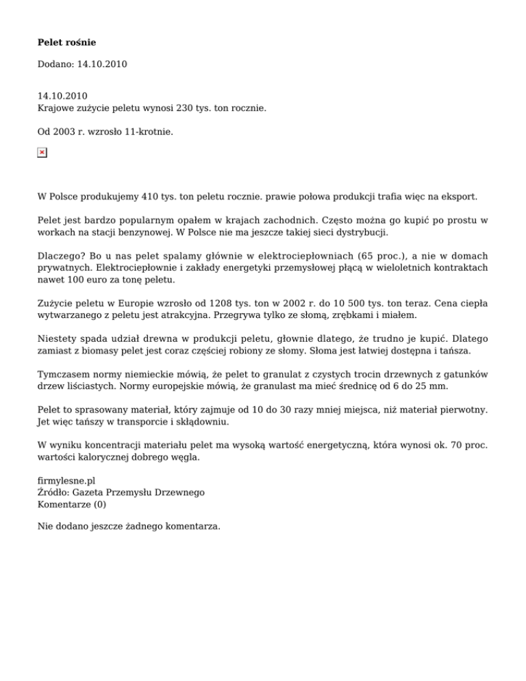Pelet rośnie Dodano: 14.10.2010 14.10.2010 Krajowe zużycie peletu wynosi 230 tys. ton rocznie. Od 2003 r. wzrosło 11-krotnie. W Polsce produkujemy 410 tys. ton peletu rocznie. prawie połowa produkcji trafia więc na eksport. Pelet jest bardzo popularnym opałem w krajach zachodnich. Często można go kupić po prostu w workach na stacji benzynowej. W Polsce nie ma jeszcze takiej sieci dystrybucji. Dlaczego? Bo u nas pelet spalamy głównie w elektrociepłowniach (65 proc.), a nie w domach prywatnych. Elektrociepłownie i zakłady energetyki przemysłowej płącą w wieloletnich kontraktach nawet 100 euro za tonę peletu. Zużycie peletu w Europie wzrosło od 1208 tys. ton w 2002 r. do 10 500 tys. ton teraz. Cena ciepła wytwarzanego z peletu jest atrakcyjna. Przegrywa tylko ze słomą, zrębkami i miałem. Niestety spada udział drewna w produkcji peletu, głownie dlatego, że trudno je kupić. Dlatego zamiast z biomasy pelet jest coraz częściej robiony ze słomy. Słoma jest łatwiej dostępna i tańsza. Tymczasem normy niemieckie mówią, że pelet to granulat z czystych trocin drzewnych z gatunków drzew liściastych. Normy europejskie mówią, że granulast ma mieć średnicę od 6 do 25 mm. Pelet to sprasowany materiał, który zajmuje od 10 do 30 razy mniej miejsca, niż materiał pierwotny. Jet więc tańszy w transporcie i skłądowniu. W wyniku koncentracji materiału pelet ma wysoką wartość energetyczną, która wynosi ok. 70 proc. wartości kalorycznej dobrego węgla. firmylesne.pl Źródło: Gazeta Przemysłu Drzewnego Komentarze (0) Nie dodano jeszcze żadnego komentarza.