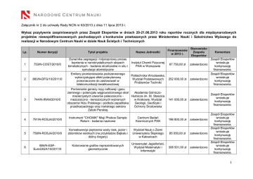 Załącznik nr 2 do uchwały Rady NCN nr 63/2013 z dnia 11 lipca 2013 r. Wykaz pozytywnie zaopiniowanych przez Zespół Ekspertów w dniach 20-21.06.2013 roku raportów rocznych dla międzynarodowych projektów niewspółfinansowanych pochodzących z konkursów przekazanych przez Ministerstwo Nauki i Szkolnictwa Wyższego do realizacji w Narodowym Centrum Nauki w dziale Nauk Ścisłych i Technicznych Lp. Numer decyzji 1 753/N-COST/2010/0 2 883/N-DFG/10/2011/0 3 744/N-IRAN/2010/0 Tytuł projektu Dynamika segregacji i trójstopniowy proces topnienia w nanokrystalicznych stopach bimetalicznych - badania strukturalne in situ i symulacje atomistyczne Emitery promieniowania podczerwonego wykorzystujące efekt polarytonowy przeznaczone do zastosowań w telekomunikacji światłowodowej Nazwa Jednostki Finansowanie w 2013 r. Stanowisko Zespołu Ekspertów Instytut Chemii Fizycznej PAN w Warszawie 87 750,00 zł zatwierdzono Politechnika Wrocławska, Wydział Podstawowych Problemów Techniki 252 000,00 zł zatwierdzono Porównanie genezy ropy naftowej i gazu ziemnego i potencjału węglowodorowego skał Akademia Górniczomacierzystych utworów paleozoiczno Hutnicza im. St. Staszica mezozoiczno - kenozoicznych wybranych w Krakowie, Wydział obszarów Niżu Polskiego i podłoża zapadliska Geologii, Geofizyki i przedkarpackiego oraz irańskiego sektora Ochrony Środowiska Zatoki Perskiej 141 000,00 zł zatwierdzono Centrum Badań Kosmicznych PAN 196 800,00 zł zatwierdzono 4 791/N-ROSJA/2010/0 Instrument "CHOMIK" Misji Phobos Sample Return - badania naukowe 5 758/N-ROSJA/2010/0 Konsekwencje piętrzenia wody rzek, jezior i zbiorników wodnych (na przykładzie Bajkału i doliny Angary) Wydział Nauk o Ziemi Uniwersytetu Śląskiego w Katowicach 85 050,00 zł zatwierdzono 6 884/N-ESFEuroGIGA/10/2011/0 Kolorowanie grafów reprezentowanych geometrycznie Uniwersytet Jagielloński, Wydział Matematyki i Informatyki 308 501,00 zł zatwierdzono Komentarz Zespół Ekspertów wnioskuje kontynuację finansowania. Zespół Ekspertów wnioskuje kontynuację finansowania. Zespół Ekspertów wnioskuje kontynuację finansowania. Zespół Ekspertów wnioskuje kontynuację finansowania. Zespół Ekspertów wnioskuje kontynuację finansowania. Zespół Ekspertów wnioskuje kontynuację finansowania. 1 7 882/N-W7X/2010/0 Budowa elementów injektora wiązki neutralnej do stellaratora W7-X 8 842/N-ESFEuroSolarFuels/10/2011/0 Synteza analogów bakteriochlorofilu c ulegających procesowi samoorganizacji z wytworzeniem sztucznych chlorosomów Wydział Chemiczny Politechniki Warszawskiej 9 871/N-SILMI-RNP/2010/0 Badania makroskopowych efektów oddziaływań intensywnych impulsów laserowych z materią oraz przygotowanie propozycji praktycznych zastosowań wyników tych badań Instytut Fizyki Plazmy i Laserowej Mikrosyntezy w Warszawie 10 885/N-ESFEuroGIGA/10/2011/0 Grafy sąsiedztwa w zbiorach o wielkich rozmiarach Wydział Matematyki, Informatyki i Mechaniki Uniwersytetu Warszawskiego 117 600,00 zł zatwierdzono 11 745/N-HESSMAGIC/2010/0 Obserwacje wysokoenergetycznych źródeł astrofizycznych w ramach międzynarodowych projektów H.E.S.S. i MAGIC Centrum Astronomiczne im M. Kopernika PAN Warszawa 720 594,00 zł zatwierdzono 12 792/N-ASTRO-PF/2010/0 Europejskie Labolatorium Stowarzyszone Astrofizyka Polska-Francja (ASTRO-PF) Centrum Astronomiczne im. M. Kopernika PAN nie dotyczy zatwierdzono 801/N-COPIN/2010/0 Badania w ramach fizyki cząstek i fizyki jądrowej we współpracy z jednostkami IN2P3 we Francji Instytut Fizyki Jądrowej im. H. Niewodniczańskiego PAN 395 000,00 zł zatwierdzono 14 755/N-7XW/2010/0 Realizacja przez IFJ PAN zadań badawczych i inżynieryjnych związanych z budową stelleratora Wendelstein 7X. Faza 2 Instytut Fizyki Jądrowej im. H. Niewodniczańskiego PAN nie dotyczy zatwierdzono 15 812/N-COST/2010/0 Jedno i wielofazowe ferroiki i multiferroiki Instytut Fizyki Molekularnej PAN 122 600,00 zł zatwierdzono 13 Narodowe Centrum Badań Jądrowych 5 751 800,00 zł zatwierdzono 307 346,00 zł 77 339,00 zł zatwierdzono zatwierdzono Zespół Ekspertów wnioskuje kontynuację finansowania. Zespół Ekspertów wnioskuje kontynuację finansowania. Zespół Ekspertów wnioskuje kontynuację finansowania. Zespół Ekspertów wnioskuje kontynuację finansowania. Zespół Ekspertów wnioskuje kontynuację finansowania. Zespół Ekspertów wnioskuje kontynuację finansowania. Zespół Ekspertów wnioskuje kontynuację finansowania. Zespół Ekspertów wnioskuje kontynuację finansowania. Zespół Ekspertów wnioskuje kontynuację finansowania. 2 16 17 18 815/N-COST/2010/0 Nanoukłady węglowe dla elektroniki molekularnej i spintroniki Instytut Fizyki Molekularnej PAN 780/N-JAPONIA/2010/0 Geneza, migracja i mieszanie niewęglowodorowych (gazy szlachetne, azot, i Akademia Górniczodwutlenek węgla) i węglowodorowych Hutnicza im. St. Staszica składników gazu ziemnego akumulowanego w w Krakowie, Wydział utworach kambru, karbonu, czerwonego Geologii, Geofizyki i spągowca i wapienia cechsztyńskiego na Niżu Ochrony Środowiska Polskim: aspekt izotopowy i geologiczny 589/N-G-POOL/2009/0 Uniwersytet Warszawski; Środowiskowe Symetrie jądrowe i ich spontaniczne łamanieLaboratorium Ciężkich eksperymenty na wiązce cyklotronu ŚLCJ UW Jonów Uniwersytetu Warszawskiego zatwierdzono Zespół Ekspertów wnioskuje kontynuację finansowania. zatwierdzono Zespół Ekspertów wnioskuje kontynuację finansowania. zatwierdzono Zespół Ekspertów wnioskuje kontynuację finansowania. zatwierdzono Zespół Ekspertów wnioskuje kontynuację finansowania. 1 750 000,00 zł zatwierdzono Zespół Ekspertów wnioskuje kontynuację finansowania. 26 000,00 zł 157 475,00 zł nie dotyczy 181/N-HSO/2008/0 Misja Herschel/HIFI-badania wody w atmosferach planet i komet Centrum Badań Kosmicznych PAN 458/1/N-ILL/09/2010/0 Badanie własności materii z wykorzystaniem wiązki neutronów wysokostrumieniowego reaktora jądrowego w Instytucie