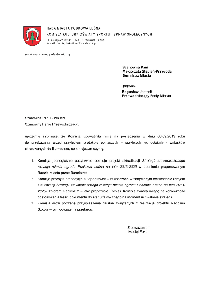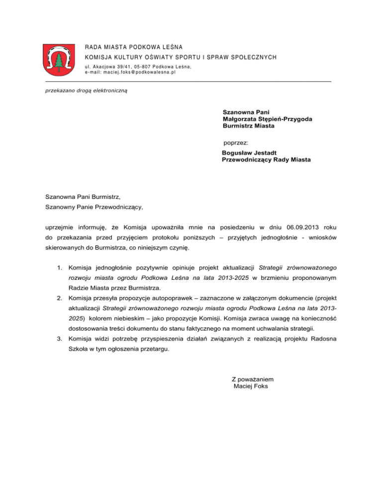 RADA MIAST A PODKOWA LEŚNA KOM ISJA KULT URY OŚWIAT Y SPORT U I SPRAW SPOŁECZ NYCH u l . A ka cj o w a 3 9 / 4 1 , 0 5 - 8 0 7 P o d k o w a L e ś n a , e - m a i l : m a c i e j . f o k s@ p o d ko w a l e sn a . p l _________________________________________________________________________________ przekazano drogą elektroniczną Szanowna Pani Małgorzata Stępień-Przygoda Burmistrz Miasta poprzez: Bogusław Jestadt Przewodniczący Rady Miasta Szanowna Pani Burmistrz, Szanowny Panie Przewodniczący, uprzejmie informuję, że Komisja upoważniła mnie na posiedzeniu w dniu 06.09.2013 roku do przekazania przed przyjęciem protokołu poniższych – przyjętych jednogłośnie - wniosków skierowanych do Burmistrza, co niniejszym czynię. 1. Komisja jednogłośnie pozytywnie opiniuje projekt aktualizacji Strategii zrównoważonego rozwoju miasta ogrodu Podkowa Leśna na lata 2013-2025 w brzmieniu proponowanym Radzie Miasta przez Burmistrza. 2. Komisja przesyła propozycje autopoprawek – zaznaczone w załączonym dokumencie (projekt aktualizacji Strategii zrównoważonego rozwoju miasta ogrodu Podkowa Leśna na lata 20132025) kolorem niebieskim – jako propozycje Komisji. Komisja zwraca uwagę na konieczność dostosowania treści dokumentu do stanu faktycznego na moment uchwalania strategii. 3. Komisja widzi potrzebę przyspieszenia działań związanych z realizacją projektu Radosna Szkoła w tym ogłoszenia przetargu. Z poważaniem Maciej Foks