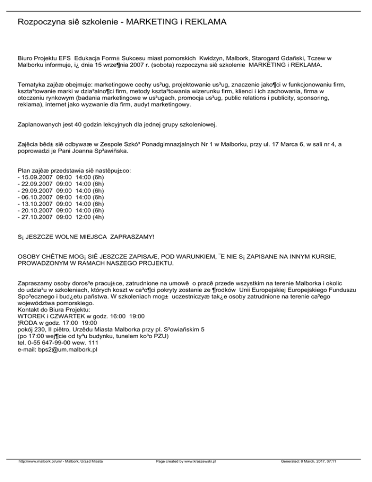 Rozpoczyna siê szkolenie - MARKETING i REKLAMA Biuro Projektu EFS Edukacja Form± Sukcesu miast pomorskich Kwidzyn, Malbork, Starogard Gdañski, Tczew w Malborku informuje, i¿ dnia 15 wrze¶nia 2007 r. (sobota) rozpoczyna siê szkolenie MARKETING i REKLAMA. Tematyka zajêæ obejmuje: marketingowe cechy us³ug, projektowanie us³ug, znaczenie jako¶ci w funkcjonowaniu firm, kszta³towanie marki w dzia³alno¶ci firm, metody kszta³towania wizerunku firm, klienci i ich zachowania, firma w otoczeniu rynkowym (badania marketingowe w us³ugach, promocja us³ug, public relations i publicity, sponsoring, reklama), internet jako wyzwanie dla firm, audyt marketingowy. Zaplanowanych jest 40 godzin lekcyjnych dla jednej grupy szkoleniowej. Zajêcia bêd± siê odbywaæ w Zespole Szkó³ Ponadgimnazjalnych Nr 1 w Malborku, przy ul. 17 Marca 6, w sali nr 4, a poprowadzi je Pani Joanna Sp³awiñska. Plan zajêæ przedstawia siê nastêpuj±co: - 15.09.2007 09:00 14:00 (6h) - 22.09.2007 09:00 14:00 (6h) - 29.09.2007 09:00 14:00 (6h) - 06.10.2007 09:00 14:00 (6h) - 13.10.2007 09:00 14:00 (6h) - 20.10.2007 09:00 14:00 (6h) - 27.10.2007 09:00 12:00 (4h) S¡ JESZCZE WOLNE MIEJSCA ZAPRASZAMY! OSOBY CHÊTNE MOG¡ SIÊ JESZCZE ZAPISAÆ, POD WARUNKIEM, ¯E NIE S¡ ZAPISANE NA INNYM KURSIE, PROWADZONYM W RAMACH NASZEGO PROJEKTU. Zapraszamy osoby doros³e pracuj±ce, zatrudnione na umowê o pracê przede wszystkim na terenie Malborka i okolic do udzia³u w szkoleniach, których koszt w ca³o¶ci pokryty zostanie ze ¶rodków Unii Europejskiej Europejskiego Funduszu Spo³ecznego i bud¿etu pañstwa. W szkoleniach mog± uczestniczyæ tak¿e osoby zatrudnione na terenie ca³ego województwa pomorskiego. Kontakt do Biura Projektu: WTOREK i CZWARTEK w godz. 16:00 19:00 ¦RODA w godz. 17:00 19:00 pokój 230, II piêtro, Urzêdu Miasta Malborka przy pl. S³owiañskim 5 (po 17:00 wej¶cie od ty³u budynku, tunelem ko³o PZU) tel. 0-55 647-99-00 wew. 111 e-mail: [email protected] http://www.malbork.pl/um/ - Malbork, Urz±d Miasta Page created by www.kraszewski.pl Generated: 8 March, 2017, 07:11