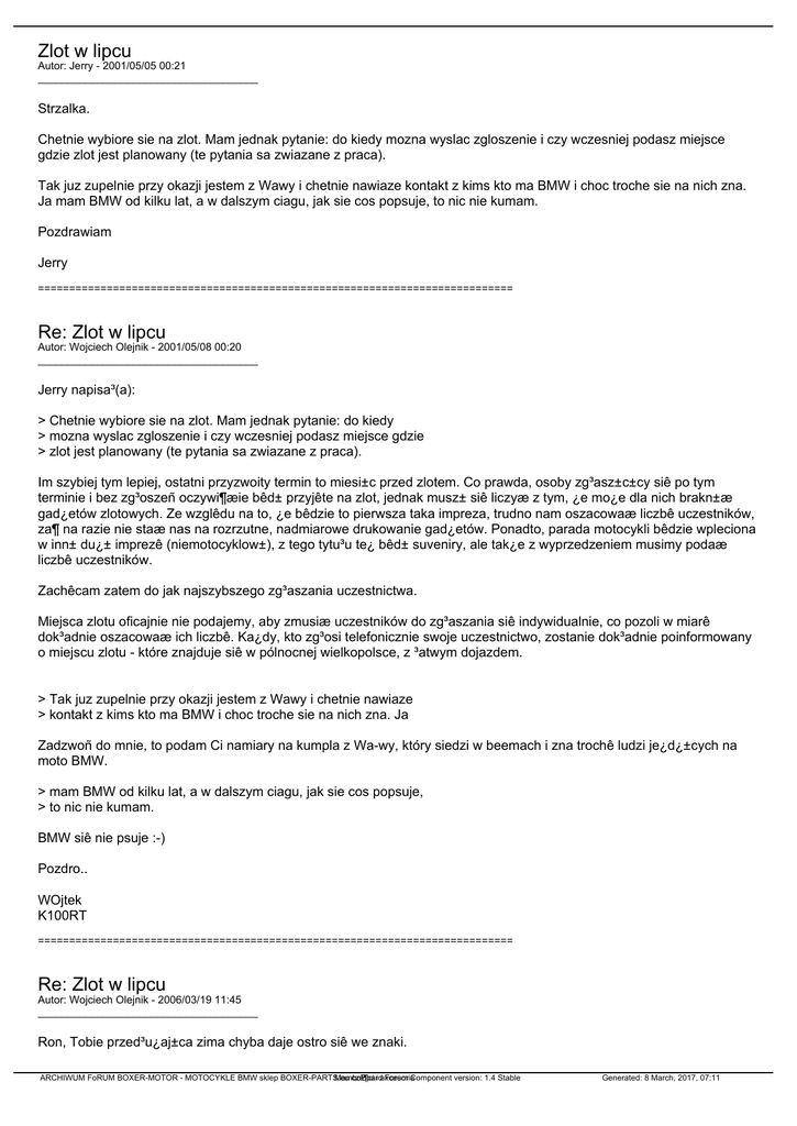 Zlot w lipcu Autor: Jerry - 2001/05/05 00:21 _____________________________________ Strzalka. Chetnie wybiore sie na zlot. Mam jednak pytanie: do kiedy mozna wyslac zgloszenie i czy wczesniej podasz miejsce gdzie zlot jest planowany (te pytania sa zwiazane z praca). Tak juz zupelnie przy okazji jestem z Wawy i chetnie nawiaze kontakt z kims kto ma BMW i choc troche sie na nich zna. Ja mam BMW od kilku lat, a w dalszym ciagu, jak sie cos popsuje, to nic nie kumam. Pozdrawiam Jerry ============================================================================ Re: Zlot w lipcu Autor: Wojciech Olejnik - 2001/05/08 00:20 _____________________________________ Jerry napisa³(a): > Chetnie wybiore sie na zlot. Mam jednak pytanie: do kiedy > mozna wyslac zgloszenie i czy wczesniej podasz miejsce gdzie > zlot jest planowany (te pytania sa zwiazane z praca). Im szybiej tym lepiej, ostatni przyzwoity termin to miesi±c przed zlotem. Co prawda, osoby zg³asz±c±cy siê po tym terminie i bez zg³oszeñ oczywi¶æie bêd± przyjête na zlot, jednak musz± siê liczyæ z tym, ¿e mo¿e dla nich brakn±æ gad¿etów zlotowych. Ze wzglêdu na to, ¿e bêdzie to pierwsza taka impreza, trudno nam oszacowaæ liczbê uczestników, za¶ na razie nie staæ nas na rozrzutne, nadmiarowe drukowanie gad¿etów. Ponadto, parada motocykli bêdzie wpleciona w inn± du¿± imprezê (niemotocyklow±), z tego tytu³u te¿ bêd± suveniry, ale tak¿e z wyprzedzeniem musimy podaæ liczbê uczestników. Zachêcam zatem do jak najszybszego zg³aszania uczestnictwa. Miejsca zlotu oficajnie nie podajemy, aby zmusiæ uczestników do zg³aszania siê indywidualnie, co pozoli w miarê dok³adnie oszacowaæ ich liczbê. Ka¿dy, kto zg³osi telefonicznie swoje uczestnictwo, zostanie dok³adnie poinformowany o miejscu zlotu - które znajduje siê w pólnocnej wielkopolsce, z ³atwym dojazdem. > Tak juz zupelnie przy okazji jestem z Wawy i chetnie nawiaze > kontakt z kims kto ma BMW i choc troche sie na nich zna. Ja Zadzwoñ do mnie, to podam Ci namiary na kumpla z Wa-wy, który siedzi w beemach i zna trochê ludzi je¿d¿±cych na moto BMW. > mam BMW od kilku lat, a w dalszym ciagu, jak sie cos popsuje, > to nic nie kumam. BMW siê nie psuje :-) Pozdro.. WOjtek K100RT ============================================================================ Re: Zlot w lipcu Autor: Wojciech Olejnik - 2006/03/19 11:45 _____________________________________ Ron, Tobie przed³u¿aj±ca zima chyba daje ostro siê we znaki. ARCHIWUM FoRUM BOXER-MOTOR - MOTOCYKLE BMW sklep BOXER-PARTS.eu MamboBoard czê¶ci i akcesoria Forum Component version: 1.4 Stable Generated: 8 March, 2017, 07:11 Ten post jest sprzed 5 lat i dotyczy³ zlotu Tarnówka 2001. Patrz na daty, please, bo odgrzewanie tego naprawdê nie ma chyba sensu. Pozdr.WO ============================================================================ Re: Zlot w lipcu Autor: Szwajcar - 2006/03/19 14:37 _____________________________________ WOjtek.... Spójrz troche w góre.................. to jaki¶ wirus odgrzebuje stare posty!!!! ============================================================================ Re: Zlot w lipcu Autor: Korba - 2006/03/19 20:54 _____________________________________ No dobra, ten temat jest stary, ale by³ tez temat m³odszy (nie mam czasu kopac w postach) gdzie by³o cos napomkniête o zlocie tegorocznym. Jakie¶ rozmowy szyfrem miêdzy starymi wyjadaczami: ''Zlot bedzie wiesz kiedy i wiesz gdzie ;-)))'' A ''trochê m³odsi wyjadacze'' g**no wiedz± w tym temacie, a tez by siê na zlot wybrali mo¿e, o ile byliby tam mile widziani... ============================================================================ ARCHIWUM FoRUM BOXER-MOTOR - MOTOCYKLE BMW sklep BOXER-PARTS.eu MamboBoard czê¶ci i akcesoria Forum Component version: 1.4 Stable Generated: 8 March, 2017, 07:11