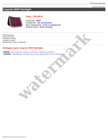 Informacje o produkcie Utworzono 08-03-2017 Czaprak HKM Starlight Cena : 151,00 zł Miękko podszyty. Grubo wyścielany. Anatomiczny kształt. Lamówka w kratkę. Szybkoschnący, łatwy w pielęgnacji. er m ar k Producent : HKM Dostępność : Na zamówienie Stan magazynowy : brak w magazynie Średnia ocena : brak recenzji Dostępne opcje Czaprak HKM Starlight w at kolory: biały, brązowy, bordowy, turkusowy, chabrowy, granatowy. rozmiar: ujeżdżeniowy, wszechstronny, pony ujeżdzeniowy, pony wszechstronny. Wygenerowano w programie www.oscGold.com