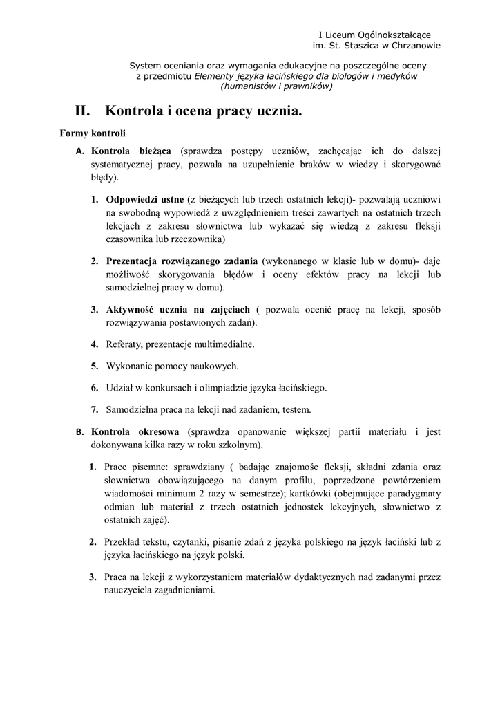 I Liceum Ogólnokształcące im. St. Staszica w Chrzanowie System oceniania oraz wymagania edukacyjne na poszczególne oceny z przedmiotu Elementy języka łacińskiego dla biologów i medyków (humanistów i prawników) II. Kontrola i ocena pracy ucznia. Formy kontroli A. Kontrola bieżąca (sprawdza postępy uczniów, zachęcając ich do dalszej systematycznej pracy, pozwala na uzupełnienie braków w wiedzy i skorygować błędy). 1. Odpowiedzi ustne (z bieżących lub trzech ostatnich lekcji)- pozwalają uczniowi na swobodną wypowiedź z uwzględnieniem treści zawartych na ostatnich trzech lekcjach z zakresu słownictwa lub wykazać się wiedzą z zakresu fleksji czasownika lub rzeczownika) 2. Prezentacja rozwiązanego zadania (wykonanego w klasie lub w domu)- daje możliwość skorygowania błędów i oceny efektów pracy na lekcji lub samodzielnej pracy w domu). 3. Aktywność ucznia na zajęciach ( pozwala ocenić pracę na lekcji, sposób rozwiązywania postawionych zadań). 4. Referaty, prezentacje multimedialne. 5. Wykonanie pomocy naukowych. 6. Udział w konkursach i olimpiadzie języka łacińskiego. 7. Samodzielna praca na lekcji nad zadaniem, testem. B. Kontrola okresowa (sprawdza opanowanie większej partii materiału i jest dokonywana kilka razy w roku szkolnym). 1. Prace pisemne: sprawdziany ( badając znajomośc fleksji, składni zdania oraz słownictwa obowiązującego na danym profilu, poprzedzone powtórzeniem wiadomości minimum 2 razy w semestrze); kartkówki (obejmujące paradygmaty odmian lub materiał z trzech ostatnich jednostek lekcyjnych, słownictwo z ostatnich zajęć). 2. Przekład tekstu, czytanki, pisanie zdań z języka polskiego na język łaciński lub z języka łacińskiego na język polski. 3. Praca na lekcji z wykorzystaniem materiałów dydaktycznych nad zadanymi przez nauczyciela zagadnieniami. I Liceum Ogólnokształcące im. St. Staszica w Chrzanowie System oceniania oraz wymagania edukacyjne na poszczególne oceny z przedmiotu Elementy języka łacińskiego dla biologów i medyków (humanistów i prawników) Sposób oceniania: 1. Wszystkie sprawdziany, testy, kartkówki, mają przyporządkowaną liczbę punktów do zadań. Ustalając odpowiednią ilość punktów do oceny, zgodnie z wymogami Statutu określono procentowe progi poszczególnych stopni: 1) Celujący - jak na bdb i wiadomości wykraczające poza program nauczania, 2) Bardzo dobry - 90 – 100% 3) Dobry - 75 – 89% 4) Dostateczny - 50 – 74% 5) Dopuszczający - 30 – 49% 6) Niedostateczny - 0 – 29% 2. Uczeń ma obowiązek przystąpienia do pracy pisemnej w najbliższym terminie po nieobecności na pracy pisemnej. W szczególnych przypadkach nauczyciel może wyznaczyć inny termin na uzupełnienie brakującej oceny. 3. Uczeń może poprawić każdą uzyskaną ocenę w terminie do dwóch tygodni od uzyskania niesatysfakcjonującej oceny. W szczególnych przypadkach uczeń ma obowiązek ustalić z nauczycielem formę i termin poprawy. 4. Ocena poprawiona jest pisana obok oceny uzyskanej w pierwszym terminie. Obie oceny brane są pod uwagę przy klasyfikacji. 5. Odpowiedź ustna: Przy ocenie odpowiedzi ustnej bierze się pod uwagę merytoryczne przygotowanie ucznia do lekcji, sposób prezentowanej odpowiedzi oraz umiejętność formułowania treści i uzasadniania poglądów. 6. Aktywność ucznia: Aktywność na lekcjach nagradzana jest plusem. Za każde 3 plusy można otrzymać ocenę bardzo dobrą. Każdy uczeń może zdobyć na jednej lekcji dowolną liczbę plusów. Gromadzenie plusów może odbywać się przez kilka kolejnych lekcji; nie wyklucza to zdobycia ocen. Przez aktywność ucznia rozumie się również dobrowolne przygotowanie referatu na ustalony z nauczycielem temat. Każdy uczeń ma prawo zgłosić raz w semestrze nieprzygotowanie do lekcji, co odnotowuje się w dzienniku lekcyjnym. 7. Zadanie domowe: Przy ocenianiu samodzielnej pracy domowej ucznia bierze się pod uwagę: zawartość rzeczową prawidłowość formy wykonania wkład własnej pracy wykorzystanie różnych źródeł informacji Uczeń ma prawo 2 razy w semestrze zgłosić brak zadania domowego. I Liceum Ogólnokształcące im. St. Staszica w Chrzanowie System oceniania oraz wymagania edukacyjne na poszczególne oceny z przedmiotu Elementy języka łacińskiego dla biologów i medyków (humanistów i prawników) 8. Nieprzygotowanie do lekcji z materiału obowiązującego uczeń zgłasza zawsze na początku lekcji. W przypadku jednej i dwóch godzin w tygodniu uczeń ma prawo zgłosić raz w ciągu semestru fakt nieprzygotowania, jednak nie zwalnia to ucznia z pracy na lekcji i zadań na ocenę wykonywanych przy wykorzystaniu pomocy naukowych. W przypadku większej liczby godzin ilość dopuszczalnych (NP.). wzrasta proporcjonalnie. Kryteria oceniania - ogólne Przy ustalaniu oceny z przedmiotu brane będą pod uwagę: 1. Poprawność w czytaniu tekstów w języku łacińskim. 2. Znajomość słownictwa wprowadzonego podczas zajęć. 3. Znajomość form gramatycznych i składniowych w zakresie poznanego materiału na zajęciach. 4. Umiejętność analizy formalnej zdania z uwzględnieniem form fleksyjnych i struktur gramatycznych. 5. Poprawność tłumaczenia sformułowań medycznych i tekstów preparowanych na język polski oraz czytanek poznanych na zajęciach. 6. Umiejętność korzystania ze słownika oraz innych pomocy dydaktycznych podczas pracy na lekcji i przy wykonywaniu pracy samodzielnej 7. Poprawność przekładu tekstu, zdań na język łaciński z uwzględnieniem poznanych form i konstrukcji gramatyczno-składniowych. Kryteria oceniania – szczegółowe 1. Ocenę niedostateczną otrzymuje uczeń, który: Nie opanował podstawowego materiału gramatycznego, pozwalającego na kontynuowanie pracy w klasie programowo wyższej. Nie potrafi poprawnie przeczytać tekstu i omówić zasad wymowy i akcentowania. Nie rozróżnia paradygmatów odmian poszczególnych części mowy. Nie potrafi ko