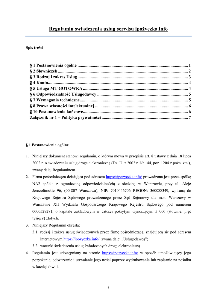 Regulamin świadczenia usług serwisu ipożyczka.info Spis treści § 1 Postanowienia ogólne ..................................................................................................... 1 § 2 Słowniczek ....................................................................................................................... 2 § 3 Rodzaj i zakres Usług ..................................................................................................... 3 § 4 Konto................................................................................................................................ 4 § 5 Usługa MT GOTOWKA ................................................................................................ 4 § 6 Odpowiedzialność Usługodawcy ................................................................................... 5 § 7 Wymagania techniczne................................................................................................... 5 § 8 Prawa własności intelektualnej ..................................................................................... 6 § 10 Postanowienia końcowe ................................................................................................ 6 Załącznik nr 1 – Polityka prywatności ............................................................................... 7 § 1 Postanowienia ogólne 1. Niniejszy dokument stanowi regulamin, o którym mowa w przepisie art. 8 ustawy z dnia 18 lipca 2002 r. o świadczeniu usług drogą elektroniczną (Dz. U. z 2002 r. Nr 144, poz. 1204 z późn. zm.), zwany dalej Regulaminem. 2. Firma pośrednicząca działająca pod adresem https://ipozyczka.info/ prowadzona jest przez spółkę NA2 spółka z ograniczoną odpowiedzialnością z siedzibą w Warszawie, przy ul. Aleje Jerozolimskie 96, (00-807 Warszawa), NIP: 7010446706 REGON: 360088349, wpisaną do Krajowego Rejestru Sądowego prowadzonego przez Sąd Rejonowy dla m.st. Warszawy w Warszawie XII Wydziału Gospodarczego Krajowego Rejestru Sądowego pod numerem 0000529281, o kapitale zakładowym w całości pokrytym wynoszącym 5 000 (słownie: pięć tysięcy) złotych. 3. Niniejszy Regulamin określa: 3.1. rodzaj i zakres usług świadczonych przez firmę pośredniczącą, znajdującą się pod adresem internetowym https://ipozyczka.info/, zwaną dalej „Usługodawcą”; 3.2. warunki świadczenia usług świadczonych drogą elektroniczną. 4. Regulamin jest udostępniany na stronie https://ipozyczka.info/ w sposób umożliwiający jego pozyskanie, odtwarzanie i utrwalanie jego treści poprzez wydrukowanie lub zapisanie na nośniku w każdej chwili. 1 5. Regulamin jest udostępniany nieodpłatnie. Użytkownik nie jest związany postanowieniami Regulaminu, które nie zostały mu udostępnione w sposób, o którym mowa w niniejszym punkcie oraz ustępie 4 powyżej. 6. Usługodawca świadczy usługi drogą elektroniczną zgodnie z Regulaminem. § 2 Słowniczek Wskazane poniżej pojęcia będą miały następujące znaczenie: 1. Dni robocze – dni od poniedziałku do piątku, z wyłączeniem dni ustawowo wolnych od pracy przypadających w te dni; 2. Klient, Użytkownik - osoba fizyczna posiadająca pełną zdolność do czynności prawnych, a w wypadkach przewidzianych przez przepisy powszechnie obowiązujące także osoba fizyczna posiadająca ograniczoną zdolność do czynności prawnych, korzystająca z Usług świadczonych przez Usługodawcę na podstawie niniejszego Regulaminu; 3. Konto – zindywidualizowany zbiór zasobów w systemie teleinformatycznym Usługodawcy, w którym gromadzone są dane Użytkownika, w tym w szczególności informacje dotyczące składanych przez Klienta wniosków oraz dane osobowe wprowadzone przez Klienta; 4. Podmiot zewnętrzny – podmiot, któremu Usługodawca przekazuje wnioski o pożyczkę złożone przez Użytkowników Serwisu, dostarczający Usługodawcy oferty związane z zawarciem umowy pożyczki; 5. 6. Regulamin – niniejszy dokument, dostępny na stronie https://ipozyczka.info/; 7. Serwis - serwis internetowy należący do Usługodawcy, w ramach którego Usługodawca świadczy Usługi, umożliwiający złożenie wniosku o rozpoczęcie świadczenia usługi MT GOTOWKA oraz umożliwiający wprowadzenie danych mających na celu uzyskanie informacji ofertowych od podmiotów zewnętrznych dotyczących zawarcia umowy pożyczki; 8. SMS MT - (Short Message Service Mobile Terminated) odpłatna wiadomość SMS, która zostaje wysłana do Użytkownika w terminach określonych w Regulaminie, w wykonaniu złożonego zamówienia, zawierającego zamówioną przez Użytkownika treść; 9. Usługa – wszelkie usługi świadczone drogą elektroniczną przez Usługodawcę na rzecz Użytkownika w oparciu o niniejszy Regulamin; 10. Usługa MT GOTOWKA - usługa subskrypcji informacji, pozwalająca cyklicznie dostarczać zarejestrowanym Użytkownikom płatne treści, zgodnie z ustalonym harmonogramem, o ofertach dotyczących warunków zawarcia umowy pożyczki z Podmiotami zewnętrznymi, otrzymywana na numer telefonu komórkowego wprowadzony do Serwisu przez Użytkownika; 11. Usługodawca - NA2 spółka z ograniczoną odpowiedzialnością z siedzibą w Warszawie, przy ul. Aleje Jerozolimskie 96, (00-807 Warszawa), NIP: 7010446706 REGON: 360088349, wpisana do 2 Krajowego Rejestru Sądowego prowadzonego przez Sąd Rejonowy dla m.st. Warszawy w Warszawie XII Wydziału Gospodarczego Krajowego Rejestru Sądowego pod numerem 0000529281, o kapitale zakładowym wynoszącym 5 000 (słownie: pięć tysięcy) złotych. § 3 Rodzaj i zakres Usług 1. Usługodawca świadczy usługi drogą elektroniczną, w rozumieniu przepisów ustawy z dnia 18 lipca 2002 r. o świadczeniu usług drogą elektroniczną (Dz. U. Nr 144, poz. 1204 z późn. zm.). 2. Korzystanie z Serwisu oznacza akceptację Regulaminu. W razie braku akceptacji Regulaminu dalsze korzystanie z Serwisu nie jest dopuszczalne. Przed rozpoczęciem korzystania z