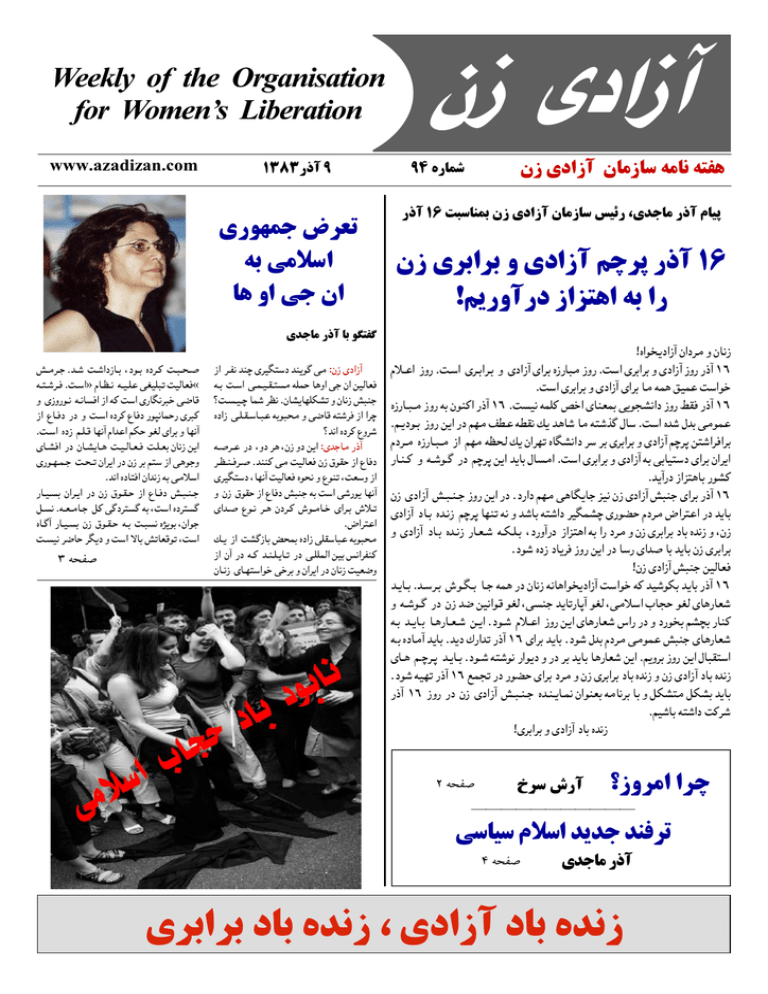 Weekly of the Organisation for Women’s Liberation www.azadizan.com ÎÐÕÐŹŷō Ö įŹƺƸưū ƉźƘţ ƶŝ İƯLjſř ŚƷ ƹř İū Ʊř ƽŶūŚƯ Źŷō Śŝ ƺĮŤƠĭ ƂººƯźººū .Ŷººƃ ŢººƃřŵŻŚººŝ ŵƺººŝ Ƶŵźººĩ ŢººŞººŰººƇ ƶºŤºƃźºƟ .Ţºſř» ƭŚºƔºƳ ƶºǀºƬƗ ƾƜǀƬŞţ ŢǀƫŚƘƟ« ƹ ƽŻƹŹƺºƳ ƶºƳŚƀƟř Żř ƶĩ Ţſř ƽŹŚĮƳźŞų ƾƋŚƣ Żř ƕŚºƟŵ Źŵ ƹ Ţºſř Ƶŵźĩ ƕŚƟŵ ŹƺĜƳŚưůŹ ƽźŞĩ .Ţºſř ƵŵŻ ƮºƬºƣ ŚƸƳō ƭřŶƗř ƮĪů ƺƜƫ ƽřźŝ ƹ ŚƸƳō ƽŚºƄƟř Źŵ ƱŚºƄƿŚºƷ ŢºǀºƫŚºƘºƟ ŢºƬºƘŝ ƱŚƳŻ Ʋƿř ƽŹƺºƸºưºū ŢºŰºţ Ʊřźƿř Źŵ ƱŻ źŝ ƮŤſ Żř ƾƷƺūƹ .ŶƳř ƵŵŚŤƟř ƱřŶƳŻ ƶŝ ƾƯLjſř ŹŚººǀººƀŝ Ʊřźººƿř Źŵ ƱŻ ơƺººƤººů Żř ƕŚººƟŵ ƂººŞººƴººū ƪºƀƳ .ƶºƘºƯŚºū ƪĩ ƾĭŵźŤƀĭ ƶŝ Ţſř ƵŵźŤƀĭ ƵŚºĭō ŹŚºǀºƀŝ ƱŻ ơƺºƤºů ƶºŝ ŢºŞƀƳ ƵĦƿƺŝ Ʊřƺū ŢºƀǀƳ źƋŚů źĮƿŵ ƹ Ţſř LJŚŝ ƂţŚƘƣƺţ Ţſř 3 Äv¨ Żř źºƠƳ Ŷƴģ ƽźǀĮŤſŵ Ŷƴƿƺĭ ƾƯ :ƱŻ ƽŵřŻō ƶºŝ Ţºſř ƾºưºǀºƤºŤƀƯ ƶƬưů ŚƷƹř ƾū Ʊř ƲǀƫŚƘƟ Ţºƀºǀºģ Śưƃ źƔƳ .ƱŚƄƿŚƸƬĪƄţ ƹ ƱŚƳŻ ƂŞƴū ƵŵřŻ ƾºƬºƤºſŚºŞƗ ƶŝƺŞŰƯ ƹ ƾƋŚƣ ƶŤƃźƟ Żř řźģ ŶƳř Ƶŵźĩ ƕƹźƃ ƶºƇźºƗ Źŵ ƹŵ źƷ ƱŻ ƹŵ Ʋƿř :ƽŶūŚƯ Źŷō źºƔºƴºƟźºƇ .Ŷƴƴĩ ƾƯ ŢǀƫŚƘƟ ƱŻ ơƺƤů Żř ƕŚƟŵ ƽźǀĮŤſŵ ŚƸƳō ŢǀƫŚƘƟ ƵƺŰƳ ƹ ƕƺƴţ ŢƘſƹ Żř ƹ ƱŻ ơƺƤů Żř ƕŚƟŵ ƂŞƴū ƶŝ Ţſř ƾƃŹƺƿ ŚƸƳō ƽřŶººƇ ƕƺººƳ źººƷ Ʊŵźººĩ ƁƺººƯŚººų ƽřźººŝ ƁLjººţ .ƉřźŤƗř Ĩºƿ Żř ŢƄĭŻŚŝ ƊŰưŝ ƵŵřŻ ƾƬƤſŚŞƗ ƶŝƺŞŰƯ Żř Ʊō Źŵ ƶºĩ ŶºƴºƬºƿŚºţ Źŵ ƾºƬƬưƫř Ʋǀŝ žƳřźƠƴĩ ƱŚºƳŻ ƽŚºƸŤſřƺų ƾųźŝ ƹ Ʊřźƿř Źŵ ƱŚƳŻ ŢǀƘƋƹ Ģì ĬæÊì¾ ƱŻ įŵřŻō ƱŚƯŻŚſ ƶƯŚƳ ƶŤƠƷ ÖÑ ƵŹŚưƃ Źŷō ÎÓ ŢŞſŚƴưŝ ƱŻ ƽŵřŻō ƱŚƯŻŚſ žǀŗŹ ƽŶūŚƯ Źŷō ƭŚǀě ƱŻ ƽźŝřźŝ ƹ ƽŵřŻō Ʈģźě Źŷō ÎÓ !ƮƿŹƹōŹŵ ŻřżŤƷř ƶŝ řŹ !ƵřƺŴƿŵřŻō ƱřŵźƯ ƹ ƱŚƳŻ ƭLjºƗř ŻƹŹ .Ţºſř ƽźºŝřźºŝ ƹ ƽŵřŻō ƽřźŝ ƵŻŹŚŞƯ ŻƹŹ .Ţſř ƽźŝřźŝ ƹ ƽŵřŻō ŻƹŹ Źŷō ÎÓ .Ţſř ƽźŝřźŝ ƹ ƽŵřŻō ƽřźŝ ŚƯ ƶưƷ ƢǀưƗ Ţſřƺų ƵŻŹŚºŞºƯ ŻƹŹ ƶŝ Ʊƺƴĩř Źŷō ÎÓ .ŢƀǀƳ ƶưƬĩ Ɔųř ƽŚƴƘưŝ ƾƿƺŬƄƳřŵ ŻƹŹ ƎƤƟ Źŷō ÎÓ .Ʈºƿŵƺºŝ ŻƹŹ Ʋƿř Źŵ ƮƸƯ ƞƐƗ ƶƐƤƳ Ĩƿ ŶƷŚƃ ŚƯ ƶŤƃŸĭ ƩŚſ .Ţſř ƵŶƃ ƩŶŝ ƾƯƺưƗ ƭŵźºƯ ƵŻŹŚºŞºƯ Żř ƮƸƯ ƶƔŰƫ Ĩƿ ƱřźƸţ ƵŚĮƄƳřŵ źſ źŝ ƽźŝřźŝ ƹ ƽŵřŻō Ʈģźě ƲŤƃřźƟřźŝ ŹŚºƴºĩ ƹ ƶºƃƺºĭ Źŵ Ʈģźě Ʋƿř ŶƿŚŝ ƩŚƀƯř .Ţſř ƽźŝřźŝ ƹ ƽŵřŻō ƶŝ ƾŝŚǀŤſŵ ƽřźŝ Ʊřźƿř .ŶƿōŹŵ ŻřżŤƷŚŝ ŹƺƄĩ ƱŻ ƽŵřŻō ƂºŞºƴºū ŻƹŹ Ʋƿř Źŵ .ŵŹřŵ ƮƸƯ ƾƷŚĮƿŚū żǀƳ ƱŻ ƽŵřŻō ƂŞƴū ƽřźŝ Źŷō ÎÓ ƽŵřŻō ŵŚºŝ ƵŶºƳŻ Ʈģźě ŚƸƴţ ƶƳ ƹ ŶƃŚŝ ƶŤƃřŵ źǀĮưƄģ ƽŹƺƌů ƭŵźƯ ƉřźŤƗř Źŵ ŶƿŚŝ ƹ ƽŵřŻō ŵŚºŝ ƵŶºƳŻ ŹŚºƘºƃ ƶºĪºƬºŝ ŵŹƹōŹŵ ŻřżŤƷř ƶŝ řŹ ŵźƯ ƹ ƱŻ ƽźŝřźŝ ŵŚŝ ƵŶƳŻ ƹ ƱŻ .ŵƺƃ ƵŵŻ ŵŚƿźƟ ŻƹŹ Ʋƿř Źŵ ŚſŹ ƽřŶƇ Śŝ ŶƿŚŝ ƱŻ ƽźŝřźŝ !ƱŻ ƽŵřŻō ƂŞƴū ƲǀƫŚƘƟ ŶºƿŚºŝ .Ŷºſźºŝ ƁƺºĮºŝ Śºū ƶưƷ Źŵ ƱŚƳŻ ƶƳŚƷřƺŴƿŵřŻō Ţſřƺų ƶĩ ŶǀƃƺĪŝ ŶƿŚŝ Źŷō ÎÓ ƹ ƶºƃƺºĭ Źŵ ƱŻ ŶƋ ƲǀƳřƺƣ ƺƜƫ ƾƀƴū ŶƿŚţŹŚěō ƺƜƫ ƾƯLjſř śŚŬů ƺƜƫ ƽŚƷŹŚƘƃ ƶºŝ ŶºƿŚºŝ ŚºƷŹŚºƘºƃ Ʋºƿř .ŵƺºƃ ƭLjºƗř ŻƹŹ Ʋƿř ƽŚƷŹŚƘƃ ŽřŹ Źŵ ƹ ŵŹƺŴŝ ƮƄĤŝ ŹŚƴĩ ƶºŝ ƵŵŚƯō ŶƿŚŝ .Ŷƿŵ ħŹřŶţ Źŷō ÎÓ ƽřźŝ ŶƿŚŝ .ŵƺƃ ƩŶŝ ƭŵźƯ ƾƯƺưƗ ƂŞƴū ƽŚƷŹŚƘƃ ƽŚºƷ Ʈºģźºě ŶºƿŚºŝ .ŵƺºƃ ƶŤƃƺƳ Źřƺƿŵ ƹ Źŵ źŝ ŶƿŚŝ ŚƷŹŚƘƃ Ʋƿř .Ʈƿƹźŝ ŻƹŹ Ʋƿř ƩŚŞƤŤſř .ŵƺƃ ƶǀƸţ Źŷō ÎÓ ƖưŬţ Źŵ Źƺƌů ƽřźŝ ŵźƯ ƹ ƱŻ ƽźŝřźŝ ŵŚŝ ƵŶƳŻ ƹ ƱŻ ƽŵřŻō ŵŚŝ ƵŶƳŻ Źŷō ÎÓ ŻƹŹ Źŵ ƱŻ ƽŵřŻō ƂºŞºƴºū ƵŶºƴºƿŚºưƳ ƱřƺƴƘŝ ƶƯŚƳźŝ Śŝ ƹ ƪĪƄŤƯ ƪĪƄŝ ŶƿŚŝ .ƮǀƃŚŝ ƶŤƃřŵ Ţĩźƃ !ƽźŝřźŝ ƹ ƽŵřŻō ŵŚŝ ƵŶƳŻ 2 Äv¨ űźſ ƁŹō ŻƹźƯř řźģ ——————————— ƾſŚǀſ ƭLjſř ŶƿŶū ŶƴƟźţ 4 Äv¨ įŶūŚƯ Źŷō įźŝřźŝ ŵŚŝ ƵŶƳŻ įŵřŻō ŵŚŝ ƵŶƳŻ Ï ƶŰƠƇ ÖÑ ƵŹŚưƃ Ģì »æÊì¾ ŻƹźƯř řźģ www.redarash.com ϱΎѧϫ ϕΎѧϤѧ̩ ήϳί ϭ ΪϧϮηϲϣ ϩΩήΑ ϱϪηϮ̳ ϪΑ !ΪϧϮηϲϣ Ϫϟ ϮϠϴΧϭήΗ ϥίΎΑήγ ήѧϫΎѧχ ϭ ΩϮѧη ϲѧϣ Ϊϴ̡ ΪόΑ ϲΗΪϣ Ύϫϥ ΪδΟ !Ζδϴϧ ϡϮϠόϣ ̱ήϣ ΖϠϋ ϭ ˬϩΪη Ϫ̰Η Ϫ̰Η ϲ̯ΎϨΘθΣϭ ίήσ ϪΑ ϥΎηϥΪΑ !Ζγ ϲϳΎγΎϨη ϞΑΎϗ ϲΘΨγ ϪΑ ϦѧΘѧθ̯ ϭ ϢϴϘΘδϣ ϡΪϋ ΖήΟ ϲΘΣ ˬϮϠϴΧϭήΗ ϭ ϡΩήѧϣ !ΩέΪѧϧ Ϣѧϫ έ "Ύѧϫ Ϫѧϧϭήѧ̡" ϲѧϤγέ έΩ ϱ ϩέΫ ϭ ΪϨΘδϴϧ ϖϤΣ ΎϣˬϲϣϮϤϋ έΎ̰ϓ ΎѧΗ ΪѧϧΩήѧ̰ѧϧ ϲ̰η ΎϫϪϧϭή̡ ϲόϗϭ ϞΗΎϗ ΩέϮϣ ήΑήΑ Ϊλ ΪϨ̩ έϮΗΎΘ̰ϳΩ ί ϥΎηΕήϔϧ ϭ ϢθΧ !ΩϮη ϥήѧѧϫϮѧΧ" Ϫѧ̯ Ζѧѧγ ϱίϭέ ˬήѧΒѧϣϮѧϧ 25 25 !ΪϧΪη ϪΘθ̯ ϪϧΎϴϔΨϣ ϭ ϪϧΎϣϮϠψϣ "ϝΎΑήϴϣ ζϳΎ̡ ˬΖηί ϱϻϮϴϫ Ϫ̯ Ζγ ϱίϭέ ήΒϣϮϧ !Ζηά̳ ϱΩί ϱΎϫϪϧϭή̡ ϱϭέ έ ϲ