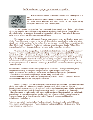 Pod Picadorem- czyli przyjaźń przede wszystkim... Kawiarnia literacka Pod Picadorem otwarta została 29 listopada 1918 roku. Jej założycielami byli poeci należący do redakcji pisma „Pro Arte”Jan Lechoń, Antoni Słonimski oraz Julian Tuwim, zaś lokal zorganizowany został przez Tadeusza Raabe, również poetę. Tuż po otwarciu, kawiarnia Pod Picadorem mieściła się przy ul. Nowy Świat 57, niecały rok później, na początku lutego 1919 roku, przeniesiona została do piwnic Hotelu Europejskiego, gdyż odwiedzający ją regularnie Skamandryci połączyli się z Klubem Futurystów. Było można wejść tu teraz tylko przez sklep gastronomiczny Kubina. Utworzenie kawiarni miało pomóc ówczesnym artystom w pracy nad dziełami nowej epokiMłodej Polski. Kawiarnia powstała w pierwszych dniach świeżo niepodległego kraju, więc ludzie wiązali z nią wielkie nadzieje. Artyści próbowali w ten nietypowy sposób zburzyć mur dzielący ich od zwykłych ludzi. Wnętrza Pod Picadorem, wykonane przez Romualda Kamila Witkowskiego oraz Aleksandra Świdwińskiego, dodawały kawiarni uroku i przytulnej atmosfery. W gmachu Hotelu Europejskiego można było spotkać również pozostałych Skamandrytów: Jarosława Iwaszkiewicza i Kazimierza Wierzyńskiego. Innymi częstymi gośćmi byli: Wacław Berent, Tadeusz Boy- Żeleński czy choćby Zofia Nałkowska, kobieta w męskim gronie- co rzadko się wtedy zdarzało. Deklamowali oni na specjalnym podium swoje najnowsze dzieła. Najczęściej były to uwielbiane przez wszystkich wiersze, ale też satyry polityczne i antymieszczańskie. Również na siedzeniach przeznaczonych dla publiczności, popijając szampana, zasiadali artyści. Można było spotkać tu m. in. Stefana Żeromskiego, Bolesława Leśmiana czy choćby wspaniałego Leopolda Staffa. Kawiarnia Pod Picadorem rozsławiona była już przed otwarciem. Zawdzięczała to specjalnej kampanii reklamowej, która była w tamtych czasach czymś nowym, szokującym, innym...przywodziła na myśl rosyjskie kawiarnie, tak dobrze prosperujące w tym okresie. Ludzie obawiali się traktowania poezji jak towaru, który należy sprzedać. Dodatkowo za samo wejście pobierana była opłata w wysokości 5 marek, a specjalnie ułożony cennik objaśniał odpowiednio relacje poeta- słuchacz. Do dnia 22 lutego 1919 roku (niedługo po przeniesieniu siedziby) Pod Picadorem było jedną z lepiej prosperujących i luksusowych kawiarni artystycznych międzywojennej Warszawy. Jednak tego dnia wszystko zaczęło się zmieniać- policja została zawiadomiona, jakoby w piwnicach Europejskiego miał znajdować się domniemany skład broni, a członkowie grupy Skamander i Klubu Futurystów organizowali w nich bolszewickie spotkania. Mimo że policja nie znalazła nic szczególnego, to z uwagi na panującą godziną policyjną, zebranych odwieziono na komisariat. Z czasem okazało się, iż donosicielem był niejaki Tadeusz Dymowski, polski działacz socjalistyczny i związkowy. Po tych wydarzeniach Kawiarnia Pod Picadorem istniała tylko to połowy kwietnia 1919 roku. Mimo zamknięcia, Skamandryci i Futuryści utrzymywali ze sobą bliskie relacje do roku 1921, kiedy to ich drogi rozeszły się... Poniżej kamienica przy ul. Nowy Świat 57 dziś. Poniżej, od lewej: Hotel Europejscki dawniej; Hotel Europejski, czasy współczesne.