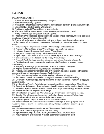 LALKA PLAN WYDARZEŃ: 1. Powrót Wokulskiego do Warszawy z Bułgarii. 2. Bankructwo rodziny Łęckich. 3. Wykupienie srebrnej zastawy stołowej należącej do Łęckich przez Wokulskiego. 4. Strach Izabeli Łęckiej przed Wokulskim. 5. Spotkanie Izabeli i Wokulskiego w jego sklepie. 6. Wyrzucenie Mraczewskiego a pracy, po uwagach na temat Izabeli. 7. Plany Wokulskiego dotyczące Izabeli Łęckiej. 8. Pragnienie Wokulskiego zaimponowania Izabeli swoją dobroczynnością podczas spotkania charytatywnego w kościele. 9. Pomoc Wokulskiego, spotkanej w kościele, dziewczynie lekkich obyczajów. 10. Rozmowa Wokulskiego z prezesową Zasławską o dawnej jej miłości do jego stryja. 11. Nieudana próba spotkania Izabeli i Wokulskiego w Łazienkach. 12. Poznanie Ochockiego przez Wokulskiego i początkowe obawy. 13. Nabycie klaczy Krzeszowskich przez Wokulskiego. 14. Wygrana zakupionej klaczy i wielka radość Izabeli. 15. Spór między baronem a Wokulskim i utrata zęba przez Krzeszowskiego. 16. Zmiana nastawienia Izabeli co do osoby Wokulskiego. 17. Rozterki Wokulskiego przed spotkaniem Izabeli na obiedzie u Łęckich. 18. Prośba Izabeli o przygotowanie powitania dla Rossiego w teatrze i zgoda Wokulskiego. 19. Niepokój Rzeckiego po zachowaniu Stacha w teatrze i nie tylko. 20. Kupno domu Łęckich na licytacji przez Wokulskiego. 21. Nieprzyjemna rozmowa Rzeckiego z Wokulskim na temat Izabeli i odrzuconej propozycji korzystnego wyjazdu przez Wokulskiego. 22. Oburzenie panny Izabeli na wieść kto jest nabywcą ich domu. 23. Rozmowa Izabeli ze Starskim po angielsku w obecności Wokulskiego. 24. Oburzenie Wokulskiego, który postanowił jednak wyjechać i nauczyć się języka angielskiego. 25. spotkanie w Paryżu Geista i rozmowa na temat jego wynalazku z Wokulskim. 26. Powrót Wokulskiego z Paryża i wyjazd do Zasławka, gdzie ma być także Izabela. 27. Wokulski wyraża swoje uczucia Izabeli, która daje mu nadzieję na bycie razem. 28. Wspaniałe chwile spędzone we dwoje. 29. Myśli Izabeli o wyjściu za Wokulskiego pod wpływem bankructwa jej ojca. 30. Zawód Wokulskiego zachowaniem Izabeli podczas koncertu Molinariego ( uwodziciela kobiet, którym Izabela była zachwycona ). 31. wspólna podróż Łęckich wraz a Wokulskim i Starskim. 32. Zdrada Izabeli ze Starskim na oczach Wokulskiego a także przykre słowa wypowiedziane o nim ( w języku angielskim, którego Wokulski zdążył się już nauczyć ). 33. Nieudana próba popełnienia samobójstwa przez Wokulskiego. 34. Rozpacz Wokulskiego po zdradzie ukochanej. 35. Sprzedaż swojego dorobku Szlangbaumowi przez Wokulskiego. 36. Niewyjaśnione okoliczności w jakich zaginął po Wokulskim ślad. bez-nauki.pl – ściągi, opracowania, testy 1