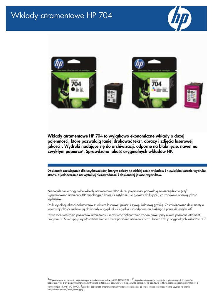 Wkłady atramentowe HP 704 Wkłady atramentowe HP 704 to wyjątkowo ekonomiczne wkłady o dużej pojemności, które pozwalają taniej drukować tekst, obrazy i zdjęcia laserowej jakości1. Wydruki nadające się do archiwizacji, odporne na blaknięcie, nawet na zwykłym papierze2. Sprawdzona jakość oryginalnych wkładów HP. Doskonałe rozwiązanie dla użytkowników, którym zależy na niskiej cenie wkładów i niewielkim koszcie wydruku strony, a jednocześnie na wysokiej niezawodności i doskonałej jakości wydruków. Niezwykle tanie oryginalne wkłady atramentowe HP o dużej pojemności pozwalają zaoszczędzić więcej1. Opatentowane atramenty HP zapobiegają korozji i zatykaniu się głowicy drukującej, co zapewnia wysoką jakość wydruków. Druk wysokiej jakości dokumentów z tekstem laserowej jakości i żywą, kolorową grafiką. Zarchiwizowane dokumenty o laserowej jakości zachowują doskonały wygląd tekstu i grafiki i są odporne na blaknięcie przez dziesiątki lat2. Łatwe monitorowanie poziomów atramentów i możliwość dokończenia zadań nawet przy niskim poziomie atramentu. Program HP SureSupply wysyła ostrzeżenia o niskim poziomie atramentu oraz ułatwia zakup oryginalnych wkładów HP3. 1W porównaniu z czarnymi i trójkolorowymi wkładami atramentowymi HP 122 i HP 301. 2Na podstawie prognoz przemysłu papierniczego dot. papierów bezkwasowych, z oryginalnymi atramentami HP; dane o stabilności barwników w temperaturze pokojowej na podstawie testów zgodności podobnych systemów z normami ISO 11798 i ISO 18909. 3Zasady i dostępność programu mogą być różne w zależności od kraju. Więcej informacji można uzyskać na stronie http://www.hp.com/learn/suresupply. Wkłady atramentowe HP 704 Dane techniczne produktu P/N Opis Numer wyboru Rozmiary opakowania produktu Waga Kod UPC CN692AE Czarny wkład atramentowy HP 704 704 113 x 37 x 115 mm 0,06 kg 885631712238 CN693AE Trójkolorowy wkład atramentowy HP 704 704 113 x 37 x 115 mm 0,06 kg 885631712245 Gwarancja HP gwarantuje, że każdy wkład atramentowy, głowica drukująca i powiązane materiały eksploatacyjne HP są wolne od wad materiałowych i produkcyjnych przez okres obowiązywania gwarancji. Do sprzedaży tylko w Polsce i Turcji © Copyright 2010 Hewlett-Packard Development Company, L.P. Informacje zawarte w tym dokumencie mogą bez uprzedzenia ulec zmianie. Jedyne gwarancje, jakich HP udziela na produkty i usługi, są określone w oświadczeniach gwarancyjnych dostarczanych wraz z takimi produktami i usługami. Żaden zapis niniejszego dokumentu nie może być uważany za dodatkową gwarancję. HP nie ponosi odpowiedzialności za błędy techniczne lub redakcyjne oraz braki występujące w niniejszym dokumencie. Aby uzyskać więcej informacji na temat materiałów konsumpcyjnych HP, odwiedź www.hp.com/go/pageyield Publikacja na region EMEA 4AA3-1040 PLE