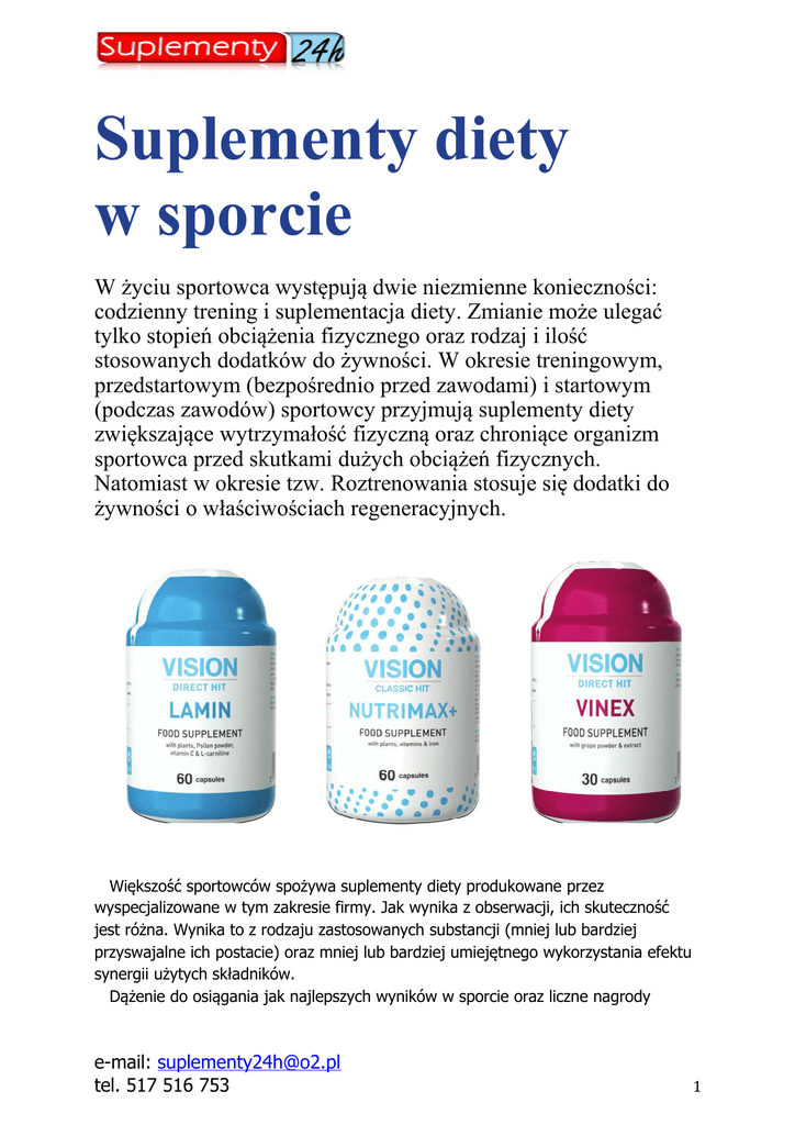 Suplementy diety w sporcie W życiu sportowca występują dwie niezmienne konieczności: codzienny trening i suplementacja diety. Zmianie może ulegać tylko stopień obciążenia fizycznego oraz rodzaj i ilość stosowanych dodatków do żywności. W okresie treningowym, przedstartowym (bezpośrednio przed zawodami) i startowym (podczas zawodów) sportowcy przyjmują suplementy diety zwiększające wytrzymałość fizyczną oraz chroniące organizm sportowca przed skutkami dużych obciążeń fizycznych. Natomiast w okresie tzw. Roztrenowania stosuje się dodatki do żywności o właściwościach regeneracyjnych. Większość sportowców spożywa suplementy diety produkowane przez wyspecjalizowane w tym zakresie firmy. Jak wynika z obserwacji, ich skuteczność jest różna. Wynika to z rodzaju zastosowanych substancji (mniej lub bardziej przyswajalne ich postacie) oraz mniej lub bardziej umiejętnego wykorzystania efektu synergii użytych składników. Dążenie do osiągania jak najlepszych wyników w sporcie oraz liczne nagrody e-mail: [email protected] tel. 517 516 753 1 i wyróżnienia suplementów diety fi rmy Vision International People Group na targach i wystawach skłoniły do podjęcia próby wykorzystania tych preparatów w specjalistycznym żywieniu sportowców. W tym celu wybrano dwie grupy preparatów o właściwościach najbardziej pożądanych w suplementacji sportowców. Pierwszą grupę tworzyły: Lamin, Nutrimax i Vinex. Zadaniem tych preparatów było odżywianie sportowców (boks amatorski) przygotowujących się do zawodów. Spośród wymienionych preparatów najwszechstronniejsze w tym zakresie działanie posiada preparat o nazwie Lamin. Zawarte w nim składniki: eleuterokok, pyłek kwiatowy, witamina C oraz L-karnityna podnoszą wytrzymałość organizmu na obciążenia fizyczne i psychiczne, a także zwiększają odporność organizmu na infekcje, które mogłyby stać się przyczyną spadku kondycji sportowców i opóźnienia procesu treningowego. Ponadto eleuterokok, pyłek kwiatowy i witamina C przyczyniają się do zwiększenia zawartości hemoglobiny i erytrocytów we krwi; eleuterokok i L-karnityna optymalizują przemianę cukrowo-tłuszczową (a tym samym i energetyczną), poprawiają wykorzystanie tlenu oraz stymulują syntezę ATP, zapewniając tym samym zaopatrzenie tkanki mięśniowej, i co szczególnie ważne, mięśnia sercowego w odpowiednią ilość energii. Jednocześnie L-karnityna zapobiega wykorzystywaniu aminokwasów w celu zaspokojenia potrzeb energetycznych, a tym samym posiada działanie osłaniające w stosunku do białek. To wszystko sprawia, że Lamin sprzyja zmniejszeniu ilości podskórnej tkanki tłuszczowej oraz zwiększeniu masy mięśniowej. Właściwości antyoksydacyjne preparatu oraz właściwości aktywujące oczyszczający układ enzymatyczny wątroby (witamina C) zapewniają ochronę komórek (m.in. mięśni i tkanki łącznej) przed niszczącym działaniem wolnych rodników i toksyn powstających w zwiększonych ilościach, w organizmie podczas wysiłku fizycznego. Zawartość witaminy C, która jest jednym z ważniejszych czynników dojrzewania kolagenu sprawia, że Lamin sprzyja regeneracji tkanki łącznej ścian naczyń krwionośnych oraz innych struktur organizmu szczególnie narażonych na mikrourazy podczas wysiłku fizycznego. Drugi preparat o nazwie Nutrimax został wybrany ze względu na zawartość substancji mineralnych (żelazo, wapń, magnez) i witamin (z grupy B) korzystnie wpływających na procesy krwiotwórcze oraz czynność układu nerwowego, a także ze względu na zawartość składników roślinnych poprawiających czynność układu krwionośnego, intensywnie eksploatowanego podczas wysiłku fizycznego. Ponadto, zawartość składników roślinnych o właściwościach przeciwzapalnych i przyspieszających gojenie się ran oraz wielopłaszczyznowe działanie żelaza (m.in. pozytywny wpływ na syntezę DNA, procesy metaboliczne, usuwanie toksyn z organizmu i funkcjonowanie układu odpornościowego) sprawia, że preparat ten oprócz podstawowych funkcji zapewnia dodatkową ochronę przed skutkami dużych obciążeń fizycznych organizmu i jego szybszą regenerację. e-mail: [email protected] tel. 517 516 753 2 Trzeci preparat o nazwie: Vinex zastosowano ze względu na zawartość rezweratrolu – substancji o silnych właściwościach antyoksydacyjnych przewyższających takowe zawartew witaminie C i E. Druga grupa preparatów została wybrana ze względu na funkcje regeneracyjne wymagane w okresie roztrenowania (siatkarki – studentki AWF) i składała się z tzw. Zestawu Regenerującego (Aktivy, Beesk, Cupers, Mega). Wstępne badania i obserwacje potwierdziły korzystny wpływ powyższych suplementów na kondycję psychofizyczną sportowców. W przypadku bokserów – jak wynika z subiektywnej oceny trenerów – nastąpił znaczny wzrost kondycji fizycznej sportowców i wyraźny spadek zachorowań. Również sami sportowcy podkreślali znacznie lepsze niż dotychczas samopoczucie. Przeprowadzone równolegle badania czynnościowe były zbieżne z powyższymi opiniami, jakkolwiek mała liczebność grupy i brak grupy kontrolnej nie pozwalają na zastosowanie pełnej oceny statystycznej. W grupie siatkarek po zastosowaniu suplementów diety z Zestawu Regenerującego przez okres jednego miesiąca wzrosły wskaźniki świadczące o poprawie stanu czynnościowego organizmu. W subiektywnej ocenie siatkarek ich stan się nie zmienił. Niektóre z nich podkreślały jednak, że nie doszło u nich – jak zazwyczaj w tym okresie – do infekcji lub była ona znacznie słabsza i krótsza niż zwykle. Również w tym przypadku dla obiektywizacji danych konieczne byłoby wykonanie powtórnych badań na większej grupie z zastosowaniem grupy kontrolnej. e-mail: [email protected] tel. 517 516 753 3