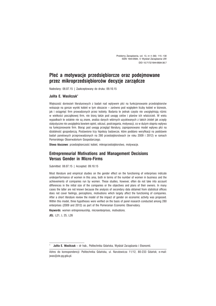 Problemy ZarzÈdzania, vol. 13, nr 4 (56): 115 – 130 ISSN 1644-9584, © Wydziaï ZarzÈdzania UW DOI 10.7172/1644-9584.56.7 PïeÊ ab motywacje przedsiÚbiorcze oraz podejmowane przez mikroprzedsiÚbiorców decyzje zarzÈdcze Nadesïany: 08.07.15 | Zaakceptowany do druku: 09.10.15 Julita E. Wasilczuk* WiÚkszoĂÊ doniesieñ literaturowych zb badañ nad wpïywem pïci na funkcjonowanie przedsiÚbiorstw wskazuje na gorsze wyniki kobiet wb tym obszarze – zarówno pod wzglÚdem liczby kobiet wb biznesie, jak ib osiÈgniÚÊ firm prowadzonych przez kobiety. Badania te jednak czÚsto nie uwzglÚdniajÈ róĝnic wb wielkoĂci poczÈtkowej firm, nie biorÈ takĝe pod uwagÚ celów ib planów ich wïaĂcicieli. W wielu wypadkach te ostatnie nie sÈ znane, analiza danych wtórnych uzyskiwanych zb takich ěródeï jak urzÚdy statystyczne nie uwzglÚdnia bowiem opinii, odczuÊ, postrzegania, motywacji, co wbduĝym stopniu wpïywa na funkcjonowanie firm. BiorÈc pod uwagÚ przeglÈd literatury, zaproponowano model wpïywu pïci na dziaïalnoĂÊ gospodarczÈ. Postawiono trzy hipotezy badawcze, które poddano weryfikacji na podstawie badañ panelowych przeprowadzonych na 280 przedsiÚbiorstwach (w roku 2009 ib 2012) wb ramach Pomorskiego Obserwatorium Gospodarczego. Sïowa kluczowe: przedsiÚbiorczoĂÊ kobiet, mikroprzedsiÚbiorstwo, motywacje. Entrepreneurial Motivations and Management Decisions Versusb Gender in Micro-Firms Submitted: 08.07.15 | Accepted: 09.10.15 Most literature and empirical studies on the gender effect on the functioning of enterprises indicate underperformance of women in this area, both in terms of the number of women in business and the achievements of companies run by women. These studies, however, often do not take into account differences in the initial size of the companies or the objectives and plans of their owners. In many cases the latter are not known because the analysis of secondary data obtained from statistical offices does not cover feelings, perceptions, motivations which largely affect the functioning of companies. After ab short literature review the model of the impact of gender on economic activity was proposed. Within this model, three hypotheses were verified on the basis of panel research conducted among 280 enterprises (2009 and 2012) as part of the Pomeranian Economic Observatory. Keywords: women entrepreneurship, microenterprises, motivations. JEL: L21, L 25, L26 * Julita E. Wasilczuk – dr hab., Politechnika Gdañska, Wydziaï ZarzÈdzania ib Ekonomii. Adres do korespondencji: Politechnika Gdañska, ul. Narutowicza 11/12, 80-233 Gdañsk; e-mail: [email protected]. Julita E. Wasilczuk 1. Wprowadzenie Wpisanie prostego hasïa women entrepreneurs lub women entrepreneurship wb jednej zb najwiÚkszych baz internetowych EBSCO wskazuje 483 artykuïy opublikowane wbczasopismach naukowych wblatach 2010–2015 (dane zbkwietnia 2015 r. dotyczÈ publikacji peïnotekstowych wbczasopismach naukowych), zb czego wb dwóch gïównych czasopismach dotyczÈcych przedsiÚbiorczoĂci (Etnrepreneurship Theory and Practice oraz Journal of Business Venturing) opublikowano 71 artykuïów na ten temat. Nie jest to duĝa liczba, zwaĝywszy na liczbÚ doniesieñ medialnych, specjalne sesje tematyczne na konferencjach czy programy pomocowe, które majÈ przyczyniÊ siÚ do zwiÚkszenia wykorzystania zasobu, jakim sÈ kobiety wb gospodarce. Naleĝy takĝe zaznaczyÊ, ĝe istniejÈce koncepcje teoretyczne dotyczÈce przedsiÚbiorczoĂci nie tïumaczÈ róĝnic, jakie wystÚpujÈ wbfirmach prowadzonych przez przedsiÚbiorców róĝnej pïci, co Ăwiadczy obkoniecznoĂci podejmowania tego typu badañ. Wiele ukazujÈcych siÚ artykuïów dotyczy krajów rozwijajÈcych siÚ (Indie, Peru, kraje Afryki, np. Nigeria, Tanzania) oraz takich, wbktórych przedsiÚbiorczoĂÊ kobiet jest raczej dziaïaniem marginalnym (kraje arabskie). Znaczna czÚĂÊ artykuïów opisuje finansowanie dziaïalnoĂci przedsiÚbiorczej oraz wsparcie, czÚsto wbpostaci coachingu lub grup samopomocowych. W polskiej literaturze temat przedsiÚbiorczoĂci kobiet teĝ nie jest czÚsto poruszany, chociaĝ moĝna zaobserwowaÊ duĝo portali obcharakterze wspierajÈcym kobiety prowadzÈce lub zamierzajÈce rozpoczÈÊ dziaïalnoĂÊ gospodarczÈ. PrzedsiÚbiorczoĂÊ, jak zresztÈ wiele innych obszarów funkcjonowania, jest jednak caïy czas postrzegana jako zjawisko mÚskie, zarówno na Ăwiecie, jak ib wb Polsce (np. Bullogh, 2013). Nie zmienia tego nawet fakt, ĝe wb Polsce udziaï kobiet przedsiÚbiorczyñ od wielu lat utrzymuje siÚ na jednym zbnajwyĝszych poziomów wbEuropie, powstajÈ artykuïy na ten temat, powoïywane sÈ gremia ibrealizowane projekty, które tÚ przedsiÚbiorczoĂÊ majÈ wspieraÊ. Z drugiej strony nie prowadzi siÚ badañ specjalnie poĂwiÚconych przedsiÚbiorczoĂci mÚĝczyzn jako odrÚbnej grupie, jeĝeli juĝ to wystÚpuje ona jako grupa porównawcza dla badanych kobiet (analiza artykuïów opublikowanych wbdwóch czoïowych periodykach wymienionych powyĝej nie wykazaïa prac poĂwiÚconych mÚĝczyznom przedsiÚbiorcom). Brak artykuïów na temat przedsiÚbiorczoĂci mÚĝczyzn nie jest jednak niczym dziwnym, bowiem jÚzyk opisujÈcy przedsiÚbiorczoĂÊ jest zwiÈzany zbtypowo mÚskim Ăwiatem. Stereotypowy przedsiÚbiorca to osoba odwaĝna, skïonna ponosiÊ ryzyko, twarda, czÚsto wyrachowana, bez reszty oddana swojej firmie, waleczna (Ahl, 2006). JednoczeĂnie, jak udowodniïa Ahl wb swojej przeïomowej pracy na temat przedsiÚbiorczoĂci kobiet, stereotyp kobiecoĂci jest ewidentnie sprzeczny zb dziaïaniami podejmowanymi przez przedsiÚbiorców. Niektóre wyniki badañ prowadzonych wĂród kobiet przedsiÚbiorczyñ pokrywajÈ siÚ zbtym stereotypowym postrzeganiem kobiet. I tak, kobieca przedsiÚbiorczoĂÊ jest opisywana jako mniej dynamiczna ibbardziej 116 DOI 10.7172/1644-9584.56.7 PïeÊ ab motywacje przedsiÚbiorcze oraz podejmowane przez mikroprzedsiÚbiorców dec