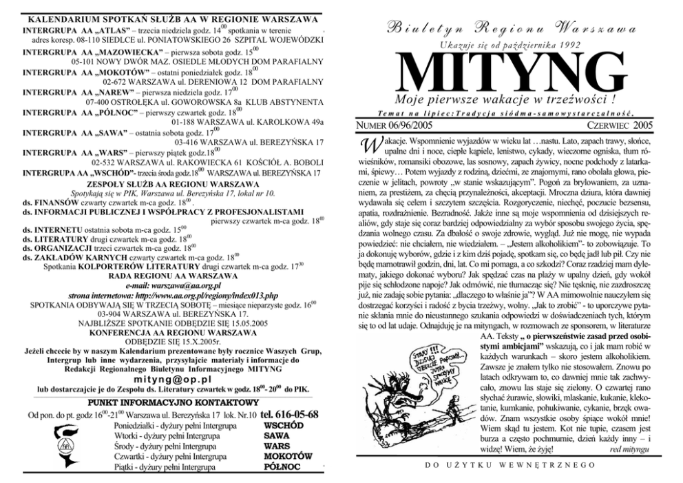 16 KALENDARIUM SPOTKAŃ SŁUśB AA W REGIONIE WARSZAWA Biuletyn Regionu Warszawa 00 INTERGRUPA AA „ATLAS” – trzecia niedziela godz. 14 spotkania w terenie adres koresp. 08-110 SIEDLCE ul. PONIATOWSKIEGO 26 SZPITAL WOJEWÓDZKI Ukazuje się od października 1992 00 INTERGRUPA AA „MAZOWIECKA” – pierwsza sobota godz. 15 05-101 NOWY DWÓR MAZ. OSIEDLE MŁODYCH DOM PARAFIALNY 00 INTERGRUPA AA „MOKOTÓW” – ostatni poniedziałek godz. 18 02-672 WARSZAWA ul. DERENIOWA 12 DOM PARAFIALNY 00 INTERGRUPA AA „NAREW” – pierwsza niedziela godz. 17 07-400 OSTROŁĘKA ul. GOWOROWSKA 8a KLUB ABSTYNENTA 00 INTERGRUPA AA „PÓŁNOC” – pierwszy czwartek godz. 18 01-188 WARSZAWA ul. KAROLKOWA 49a 00 INTERGRUPA AA „SAWA” – ostatnia sobota godz. 17 03-416 WARSZAWA ul. BEREZYŃSKA 17 00 INTERGRUPA AA „WARS” – pierwszy piątek godz.18 02-532 WARSZAWA ul. RAKOWIECKA 61 KOŚCIÓŁ A. BOBOLI 00 INTERGRUPA AA „WSCHÓD”- trzecia środa godz.18 WARSZAWA ul. BEREZYŃSKA 17 ZESPOŁY SŁUśB AA REGIONU WARSZAWA Spotykają się w PIK, Warszawa ul. Berezyńska 17, lokal nr 10. ds. FINANSÓW czwarty czwartek m-ca godz. 1800 . ds. INFORMACJI PUBLICZNEJ I WSPÓŁPRACY Z PROFESJONALISTAMI pierwszy czwartek m-ca godz. 1800 00 ds. INTERNETU ostatnia sobota m-ca godz. 15 ds. LITERATURY drugi czwartek m-ca godz. 1800 ds. ORGANIZACJI trzeci czwartek m-ca godz. 1800 ds. ZAKŁADÓW KARNYCH czwarty czwartek m-ca godz. 1800 Spotkania KOLPORTERÓW LITERATURY drugi czwartek m-ca godz. 1730 RADA REGIONU AA WARSZAWA e-mail: [email protected] strona internetowa: http://www.aa.org.pl/regiony/index013.php SPOTKANIA ODBYWAJĄ SIĘ W TRZECIĄ SOBOTĘ – miesiące nieparzyste godz. 1600 03-904 WARSZAWA ul. BEREZYŃSKA 17. NAJBLIśSZE SPOTKANIE ODBĘDZIE SIĘ 15.05.2005 KONFERENCJA AA REGIONU WARSZAWA ODBĘDZIE SIĘ 15.X.2005r. JeŜeli chcecie by w naszym Kalendarium prezentowane były rocznice Waszych Grup, Intergrup lub inne wydarzenia, przysyłajcie materiały i informacje do Redakcji Regionalnego Biuletynu Informacyjnego MITYNG [email protected] lub dostarczajcie je do Zespołu ds. Literatury czwartek w godz. 1800- 2000 do PIK. ____________________________________________________________________________________________________________________________________________________________________________ PUNKT INFORMACYJNO KONTAKTOWY Od pon. do pt. godz 1600-2100 Warszawa ul. Berezyńska 17 lok. Nr.10 tel. 616-05-68 Poniedziałki - dyŜury pełni Intergrupa WSCHÓD Wtorki - dyŜury pełni Intergrupa SAWA Środy - dyŜury pełni Intergrupa WARS Czwartki - dyŜury pełni Intergrupa MOKOTÓW Piątki - dyŜury pełni Intergrupa PÓŁNOC MITYNG Moje pierwsze wakacje w trzeźwości ! Te m a t n a l i p i e c : T r a d y c j a s i ó d m a - s a m o w y s t a r c z a l n o ś ć . NUMER 06/96/2005 CZERWIEC 2005 W akacje. Wspomnienie wyjazdów w wieku lat …nastu. Lato, zapach trawy, słońce, upalne dni i noce, ciepłe kąpiele, lenistwo, cykady, wieczorne ogniska, tłum rówieśników, romansiki obozowe, las sosnowy, zapach Ŝywicy, nocne podchody z latarkami, śpiewy… Potem wyjazdy z rodziną, dziećmi, ze znajomymi, rano obolała głowa, pieczenie w jelitach, powroty „w stanie wskazującym”. Pogoń za brylowaniem, za uznaniem, za prestiŜem, za chęcią przynaleŜności, akceptacji. Mroczna dziura, która dawniej wydawała się celem i szczytem szczęścia. Rozgoryczenie, niechęć, poczucie bezsensu, apatia, rozdraŜnienie. Bezradność. JakŜe inne są moje wspomnienia od dzisiejszych realiów, gdy staje się coraz bardziej odpowiedzialny za wybór sposobu swojego Ŝycia, spędzania wolnego czasu. Za dbałość o swoje zdrowie, wygląd. JuŜ nie mogę, nie wypada powiedzieć: nie chciałem, nie wiedziałem. – „Jestem alkoholikiem”- to zobowiązuje. To ja dokonuję wyborów, gdzie i z kim dziś pojadę, spotkam się, co będę jadł lub pił. Czy nie będę marnotrawił godzin, dni, lat. Co mi pomaga, a co szkodzi? Coraz rzadziej mam dylematy, jakiego dokonać wyboru? Jak spędzać czas na plaŜy w upalny dzień, gdy wokół pije się schłodzone napoje? Jak odmówić, nie tłumacząc się? Nie tęsknię, nie zazdroszczę juŜ, nie zadaję sobie pytania: „dlaczego to właśnie ja”? W AA mimowolnie nauczyłem się dostrzegać korzyści i radość z bycia trzeźwy, wolny. „Jak to zrobić” - to uporczywe pytanie skłania mnie do nieustannego szukania odpowiedzi w doświadczeniach tych, którym się to od lat udaje. Odnajduję je na mityngach, w rozmowach ze sponsorem, w literaturze AA. Teksty „ o pierwszeństwie zasad przed osobistymi ambicjami” wskazują, co i jak mam robić w kaŜdych warunkach – skoro jestem alkoholikiem. Zawsze je znałem tylko nie stosowałem. Znowu po latach odkrywam to, co dawniej mnie tak zachwycało, znowu las staje się zielony. O czwartej rano słychać Ŝurawie, słowiki, mlaskanie, kukanie, klekotanie, kumkanie, pohukiwanie, cykanie, brzęk owadów. Znam wszystkie osoby śpiące wokół mnie! Wiem skąd tu jestem. Kot nie tupie, czasem jest burza a często pochmurnie, dzień kaŜdy inny – i widzę! Wiem, Ŝe Ŝyję! red mityngu D O UśYT KU WEWN ĘT RZN EGO 2 Oszukiwanie innych prawie zawsze ma swoje źródło w oszukiwaniu innych. M O J E P I E RW S ZE WA K A C J E … B E Z A L K O H O L U ? Z aledwie po 3 miesiącach abstynencji w terapii, zorganizowałem wyjazd miesięczny dla całej rodziny. Nic nie zapowiadało, Ŝe wymarzone wakacje Ŝycia będą takie trudne. Z Ŝoną i dziećmi, pojechaliśmy samochodem do Hiszpanii, przez Czechy, Włochy, Francję. Miał to być fajerwerk na odkupienie poczucia winy. Wiele razy w ten sposób je odrabiałem. Cały wyjazd rozplanowałem i miały to być najlepsze wakacje z rodziną. Prawdę mówiąc były, no moŜe nie „naj” piękniejsze, ale na pewno najdłuŜsze. Nigdy potem nie udało mi się tego dokonać, choć tęsknię nadal za podróŜami i mam coraz więcej czasu. KaŜdy postój lub posiłek był trud