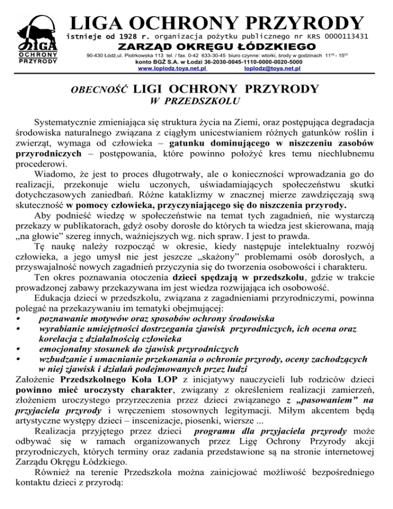 LIGA OCHRONY PRZYRODY istnieje od 1928 r. organizacja pożytku publicznego nr KRS 0000113431 ZARZĄD OKRĘGU ŁÓDZKIEGO 90-430 Łódź,ul. Piotrkowska 113 tel. / fax. 0-42 633-30-45 biuro czynne: wtorki, środy w godzinach 11 00 - 1500 konto BGŻ S.A. w Łodzi 36-2030-0045-1110-0000-0020-5000 www.loplodz.toya.net.pl [email protected] OBECNOŚĆ LIGI OCHRONY PRZYRODY W PRZEDSZKOLU Systematycznie zmieniająca się struktura życia na Ziemi, oraz postępująca degradacja środowiska naturalnego związana z ciągłym unicestwianiem różnych gatunków roślin i zwierząt, wymaga od człowieka – gatunku dominującego w niszczeniu zasobów przyrodniczych – postępowania, które powinno położyć kres temu niechlubnemu procederowi. Wiadomo, że jest to proces długotrwały, ale o konieczności wprowadzania go do realizacji, przekonuje wielu uczonych, uświadamiających społeczeństwu skutki dotychczasowych zaniedbań. Różne kataklizmy w znacznej mierze zawdzięczają swą skuteczność w pomocy człowieka, przyczyniającego się do niszczenia przyrody. Aby podnieść wiedzę w społeczeństwie na temat tych zagadnień, nie wystarczą przekazy w publikatorach, gdyż osoby dorosłe do których ta wiedza jest skierowana, mają „na głowie” szereg innych, ważniejszych wg. nich spraw. I jest to prawda. Tę naukę należy rozpocząć w okresie, kiedy następuje intelektualny rozwój człowieka, a jego umysł nie jest jeszcze „skażony” problemami osób dorosłych, a przyswajalność nowych zagadnień przyczynia się do tworzenia osobowości i charakteru. Ten okres poznawania otoczenia dzieci spędzają w przedszkolu, gdzie w trakcie prowadzonej zabawy przekazywana im jest wiedza rozwijająca ich osobowość. Edukacja dzieci w przedszkolu, związana z zagadnieniami przyrodniczymi, powinna polegać na przekazywaniu im tematyki obejmującej: • poznawanie motywów oraz sposobów ochrony środowiska • wyrabianie umiejętności dostrzegania zjawisk przyrodniczych, ich ocena oraz korelacja z działalnością człowieka • emocjonalny stosunek do zjawisk przyrodniczych • wzbudzanie i umacnianie przekonania o ochronie przyrody, oceny zachodzących w niej zjawisk i działań podejmowanych przez ludzi Założenie Przedszkolnego Koła LOP z inicjatywy nauczycieli lub rodziców dzieci powinno mieć uroczysty charakter, związany z określeniem realizacji zamierzeń, złożeniem uroczystego przyrzeczenia przez dzieci związanego z „pasowaniem” na przyjaciela przyrody i wręczeniem stosownych legitymacji. Miłym akcentem będą artystyczne występy dzieci – inscenizacje, piosenki, wiersze ... Realizacja przyjętego przez dzieci programu dla przyjaciela przyrody może odbywać się w ramach organizowanych przez Ligę Ochrony Przyrody akcji przyrodniczych, których terminy oraz zadania przedstawione są na stronie internetowej Zarządu Okręgu Łódzkiego. Również na terenie Przedszkola można zainicjować możliwość bezpośredniego kontaktu dzieci z przyrodą: - 2 środki wizualne – fotografie, rysunki, miesięcznik „Przyroda Polska” i inne • przekaz słuchowy – płyty CD z nagranymi głosami różnych zwierząt • bezpośrednie zaangażowanie w opiekę – akwaria, teraria, budki lęgowe i karmniki dla ptaków, ogródek przedszkolny w formie arboretum i tp. Wzbogaceniem tego mogą być wycieczki np. do parku, kształtujące odpowiednie postawy wobec przyrody, jej wartości i piękna, związane z umiejętnością jej poznawania, przeżywania i współżycia z nią, a także ochrony i pomnażania jej zasobów. Wszelkich form rozwijających osobowość proekologiczną u dzieci, która zaowocuje wzorową postawą wobec przyrody dorosłego człowieka, jest ilość nieograniczona. Ważne jest to, aby tę naukę rozpocząć już w wieku przedszkolnym, by nie okazało się, że dawno rozpoczęte unicestwianie przyrody przez ludzi, zaczyna swymi mackami sięgać po jej inicjatora – człowieka. Liga Ochrony Przyrody jest najstarszą w Polsce organizacją ekologiczną działającą od 1928 roku, a jej celem statutowym jest m.in.: * kształtowanie właściwych postaw człowieka a szczególnie młodzieży przez ukazywanie bogactwa, piękna i znaczenia przyrody, budzenie jej umiłowania i poszanowania, szerzenie zrozumienia celów ochrony przyrody i środowiska oraz problemów i zagrożeń * zabieganie o zachowanie, zrównoważone użytkowanie oraz odnawianie zasobów, tworów i składników przyrody będących dziedzictwem i bogactwem narodowym * zabieganie o ochronę i odnawianie zasobów środowiska przyrodniczego dla współczesnych i przyszłych pokoleń Te zagadnienia istotne dla każdego myślącego człowieka, Zarząd Okręgu Łódzkiego Ligi Ochrony Przyrody pragnie przekazać i ugruntować w postępowaniu naszemu społeczeństwu, a szczególnie młodzieży i również tej najmłodszej - w przedszkolach. • P R E Z E S ZARZĄDU OKRĘGU ŁÓDZKIEGO LIGI OCHRONY PRZYRODY arch. Mirosław Konwerski Informacje nt. założenia Koła Ligi Ochrony Przyrody można uzyskać w biurze Okręgu Łódzkiego we wtorki i środy w godzinach od 11,00 do 15,00.