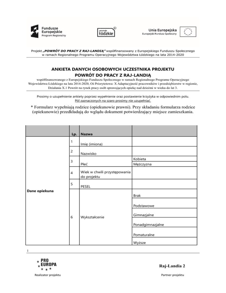Projekt „POWRÓT DO PRACY Z RAJ-LANDIĄ” współfinansowany z Europejskiego Funduszu Społecznego w ramach Regionalnego Programu Operacyjnego Województwa Łódzkiego na lata 2014-2020 ANKIETA DANYCH OSOBOWYCH UCZESTNIKA PROJEKTU POWRÓT DO PRACY Z RAJ-LANDIĄ współfinansowanego z Europejskiego Funduszu Społecznego w ramach Regionalnego Programu Operacyjnego Województwa Łódzkiego na lata 2014-2020, Oś Priorytetowa: X Adaptacyjność pracowników i przedsiębiorstw w regionie, Działania X.1 Powrót na rynek pracy osób sprawujących opiekę nad dziećmi w wieku do lat 3. Prosimy o uzupełnienie ankiety poprzez wypełnienie oraz postawienie krzyżyka w odpowiednim polu. Pól zaznaczonych na szaro prosimy nie uzupełniać. * Formularz wypełniają rodzice (opiekunowie prawni). Przy składaniu formularza rodzice (opiekunowie) przedkładają do wglądu dokument potwierdzający miejsce zamieszkania. Lp. Nazwa 1 2 3 4 5 Dane opiekuna Imię (imiona) Nazwisko Płeć Kobieta Mężczyzna Wiek w chwili przystępowania do projektu PESEL Brak Podstawowe 6 Wykształcenie Gimnazjalne Ponadgimnazjalne Pomaturalne Wyższe 1 Raj-Landia 2 Realizator projektu Partner projektu Projekt „POWRÓT DO PRACY Z RAJ-LANDIĄ” współfinansowany z Europejskiego Funduszu Społecznego w ramach Regionalnego Programu Operacyjnego Województwa Łódzkiego na lata 2014-2020 Tak 7 Opieka nad dziećmi do lat 3 Dane kontaktowe 8 Rodzaj uczestnika 9 Nazwa instytucji 10 Nr domu 11 Nr lokalu 12 Ulica 13 Miejscowość 14 Obszar wg stopnia urbanizacji (DEGURBA) 15 Kod pocztowy 16 Województwo 17 Powiat 18 Gmina 19 KRAJ 20 21 Dane dodatkowe 22 Nie Obszar miejski Obszar wiejski Telefon kontaktowy Adres poczty elektronicznej (e-mail) Status osoby na rynku pracy w chwili przystąpienia do projekt Osoba bierna zawodowa (niepracująca niezarejestrowana w PUP) Bezrobotny zarejestrowany w PUP Zatrudniony Na urlopie macierzyńskim 2 Raj-Landia 2 Realizator projektu Partner projektu Projekt „POWRÓT DO PRACY Z RAJ-LANDIĄ” współfinansowany z Europejskiego Funduszu Społecznego w ramach Regionalnego Programu Operacyjnego Województwa Łódzkiego na lata 2014-2020 Na urlopie wychowawczym 23 31 Wykonywany zawód Zatrudniony w (miejsce zatrudnienia) Osoba należąca do mniejszości narodowej lub etnicznej, migrant, osoba obcego pochodzenia Osoba bezdomna lub dotknięta wykluczeniem z dostępu do mieszkań Osoba z niepełnosprawnościami Osoba przebywająca w gospodarstwie domowym bez osób pracujących w tym: w gospodarstwie domowym z dziećmi pozostającymi na utrzymaniu Osoba żyjąca w gospodarstwie składającym się z jednej osoby dorosłej i dzieci pozostającymi na utrzymaniu Osoba w innej niekorzystnej sytuacji społecznej (innej niż wymienione powyżej) 32 Rodzaj przyznanego wsparcia 33 Data rozpoczęcia udziału w projekcie 34 Data zakończenia udziału w projekcie 24 25 26 27 28 29 30 3 Raj-Landia 2 Realizator projektu Partner projektu Projekt „POWRÓT DO PRACY Z RAJ-LANDIĄ” współfinansowany z Europejskiego Funduszu Społecznego w ramach Regionalnego Programu Operacyjnego Województwa Łódzkiego na lata 2014-2020 Rodzaj wsparcia 35 Powód wycofania się z proponowanej formy wsparcia 36 PKD założonej działalności gospodarczej 37 38 Sytuacja osoby w momencie zakończenia udziału w projekcie Przynależność do grupy docelowej zgodnie ze szczegółowym Opisem Osi Priorytetowych Regionalnego Programu Operacyjnego Województwa Łódzkiego na lata 20142020/zatwierdzonym do realizacji wnioskiem o dofinansowanie Projektu Uprzedzony/a o odpowiedzialności prawnej za poświadczenie nieprawdy, niniejszym oświadczam, że dane zawarte w Ankiecie danych osobowych uczestnika projektu są zgodne z prawdą. Wyrażam zgodę na przetwarzanie moich danych osobowych zawartych w Ankiecie danych osobowych uczestnika projektu, dla potrzeb procesu rekrutacji zgodnie z art. 23 ust. 1 pkt 2 ustawy z dnia 29.08.1997 r. „O ochronie danych osobowych (Dz. U. nr 133, poz. 883)". …………………………………………… DATA I MIEJSCOWOŚĆ …………………………………………… CZYTELNY PODPIS UCZESTNIKA PROJEKTU (IMIĘ I NAZWISKO) 4 Raj-Landia 2 Realizator projektu Partner projektu
