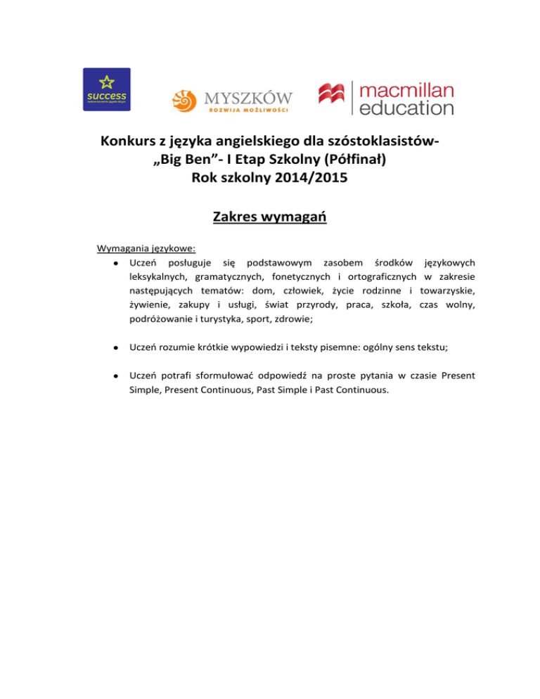 Konkurs z języka angielskiego dla szóstoklasistów„Big Ben”- I Etap Szkolny (Półfinał) Rok szkolny 2014/2015 Zakres wymagań Wymagania językowe: Uczeń posługuje się podstawowym zasobem środków językowych leksykalnych, gramatycznych, fonetycznych i ortograficznych w zakresie następujących tematów: dom, człowiek, życie rodzinne i towarzyskie, żywienie, zakupy i usługi, świat przyrody, praca, szkoła, czas wolny, podróżowanie i turystyka, sport, zdrowie; Uczeń rozumie krótkie wypowiedzi i teksty pisemne: ogólny sens tekstu; Uczeń potrafi sformułować odpowiedź na proste pytania w czasie Present Simple, Present Continuous, Past Simple i Past Continuous.