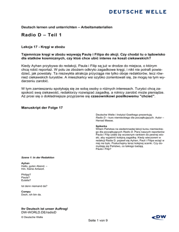Deutsch lernen und unterrichten – Arbeitsmaterialien Radio D – Teil 1 Lekcja 17 - Kręgi w zbożu Tajemnicze kręgi w zbożu wzywają Paulę i Filipa do akcji. Czy chodzi tu o lądowisko dla statków kosmicznych, czy ktoś chce ubić interes na koszt ciekawskich? Kiedy Ayhan przybywa do redakcji, Paula i Filip są już w drodze do miejsca, o którym chcą robić reportaż. W polu ze zbożem odkryto zagadkowe kręgi, i nikt nie potrafi powiedzieć, jak powstały. Ta niezwykła atrakcja przyciąga nie tylko oboje redaktorów, lecz również ciekawskich turystów. A mieszkańcy wsi szybko zorientowali się, że mogą na tym wydarzeniu zarobić. W tym zamieszaniu spotykają się ze sobą osoby o różnych interesach. Turyści chcą zaspokoić swą ciekawość, redaktorzy rozwiązać zagadkę, a rolnicy zarobić może pieniądze. Aż prosi się o dokładniejsze przyjrzenie się czasownikowi posiłkowemu "chcieć". Manuskript der Folge 17 Deutsche Welle i Instytut Goethego prezentują: Radio D – kurs niemieckiego dla początkujących. Autor – Herrad Meese. Spikerka Witam Państwa na siedemnastej lekcji kursu niemieckiego dla początkujących Radio D. Para naszych reporterów Paula i Filip udała się wczesnym rankiem do pewnej wioski, aby wyjaśnić kolejną zagadkę. Kiedy wieczorem w redakcji Radia D. pojawił się Ayhan, Pauli i Filipa wciąż w niej nie było. Posłuchajmy teraz kolejnej scenki. Czy domyślają się Państwo, co takiego badają Paula i Filip? Szene 1: In der Redaktion Ayhan Hallo, guten Abend. – Hm. Keine Antwort. Philipp? Paula? Eulalia? Ist denn niemand da? Compu Doch, ich bin da. Ihr Deutsch ist unser Auftrag! DW-WORLD.DE/radioD © Deutsche Welle Seite 1 von 9 Deutsch lernen und unterrichten – Arbeitsmaterialien Radio D – Teil 1 Ayhan Ah, guten Abend, Compu. Wo bleiben denn Paula und Philipp? Compu Mysteriöse Kreise. Ayhan Mysteriöse Kreise? Was heißt das? Compu Philipp und Paula recherchieren – mysteriöse Kreise. Spikerka Jak Państwo słyszeli, Paula i Filip badają coś bardzo dziwnego, jakieś „tajemnicze koła” – KREISE. Ale – od początku. Ayhan wpada w doskonałym nastroju do redakcji i rzuca od progu przyjazne: „Halo, dobry wieczór!”. Ayhan Hallo, guten Abend. Spikerka Nie otrzymuje jednak odpowiedzi – ANTWORT. Ayhan Hm. Keine Antwort. Spikerka Zaskoczony tym pyta: „Czy tu nikogo nie ma?“ Ayhan Ist denn niemand da? Spikerka Ktoś jednak jest w redakcji. Jest w niej komputer Compu, który odpowiada: „Ja tu jestem!” Compu Doch, ich bin da. Spikerka Ponieważ Compu na ogół wszystko wie, Ayhan pyta go: „A gdzie podziewają się Paula i Filip?” Ayhan Wo bleiben denn Paula und Philipp? Spikerka Ayhan jest zaniepokojony ich nieobecnością, w końcu jest już bardzo późno. Compu nie zna miejsca pobytu Pauli i Filipa i może jedynie powtórzyć Ayhanowi, że oboje badają jakieś tajemnicze koła. Ihr Deutsch ist unser Auftrag! DW-WORLD.DE/radioD © Deutsche Welle Seite 2 von 9 Deutsch lernen und unterrichten – Arbeitsmaterialien Radio D – Teil 1 Compu Philipp und Paula recherchieren – mysteriöse Kreise. Spikerka Na szczęście my wiemy coś więcej na ten temat. Proszę sobie wyobrazić ogromny łan zboża, liczący dziesiątki hektarów, na którym widać wielkie luki w kształcie kół. Nikt nie wie, jak coś podobnego mogło powstać i nic dziwnego, że w okolicy aż huczy od plotek. Może na tym polu wylądowali Marsjanie na swych latających spodkach? Compu Achtung, Achtung. Hier ist eine Reportage von Philipp und Paula. Spikerka Compu zapowiada, że właśnie odebrał reportaż Pauli i Filipa. Skoro tak, to dodam tylko szybko od siebie, że owe tajemnicze koła na wioskowym polu rychło stały się atrakcją turystyczną i ściągnęły do wioski wielu gości, pragnących je zobaczyć na własne oczy. Paula i Filip też już są na miejscu i polują na głosy turystów, wysiadających właśnie z autokaru: Paula Hallo, liebe Hörerinnen und Hörer. Philipp Willkommen... Paula ... bei Radio D. Philipp Radio D... Paula ... die Reportage Spikerka Właśnie nadjeżdża wielki turystyczny autokar: Szene 2: Im Dorf auf dem Parkplatz (1) Reiseleiterin So, wir sind da. Bitte alle aussteigen. 1. Frau Karl − komm, wir sind da. Aussteigen. Karl Ja, ja, ich komm ja schon. Ihr Deutsch ist unser Auftrag! DW-WORLD.DE/radioD © Deutsche Welle Seite 3 von 9 Deutsch lernen und unterrichten – Arbeitsmaterialien Radio D – Teil 1 2. Frau Ich möchte aussteigen. Schnell, ich will die Kreise sehen. Karl Wir auch – immer mit der Ruhe. Reiseleiterin Ruhe bitte. Alle wollen die Kreise sehen. 2. Frau Aber sofort! Karl Keine Angst, die haben keine Beine. Spikerka Autokar, pełen ciekawskich turystów, zatrzymuje się na parkingu w pobliżu pola. Przewodniczka ogłasza turystom przez mikrofon, że już przybyli na miejsce i prosi ich o wysiadanie z autokaru: Reiseleiterin So, wir sind da. Bitte alle aussteigen. Spikerka Turyści wysiadają z autokaru jeden przez drugiego i robi się tłok. Pewna pani najwyraźniej jako pierwsza chce zobaczyć owe tajemnicze koła na polu i głośno pogania swego towarzysza podróży, żeby pospieszył się z opuszczeniem autokaru. Mówi doń „szybko„ – SCHNELL . 2. Frau Ich möchte aussteigen. Schnell, ich will die Kreise sehen. Spikerka Ten jednak nie jest aż tak podekscytowany jak ona, albo jeszcze nie ocknął się na dobre z drzemki podczas jazdy, bo w odpowiedzi na jej ponaglenia mruczy pod nosem: „Tylko spokojnie!” Karl Immer mit der Ruhe. Spikerka No pewnie, po co ten pośpiech? Przecież koła na polu nie mają nóg i nikomu nie uciekną... Karl Keine Angst, die haben keine Beine. Ihr Deutsch ist unser Auftrag! DW-WORLD.DE/radioD © Deutsche Welle Seite 4 von 9 Deutsch lernen und unterrichten – Arbeitsmaterialien Radio D – Teil 1 Spikerka Ponieważ tajemnicze koła na polu stały się nie lada atrakcją i przyciągają do wioski rzesze turystów, jej mieszkańcy postanow