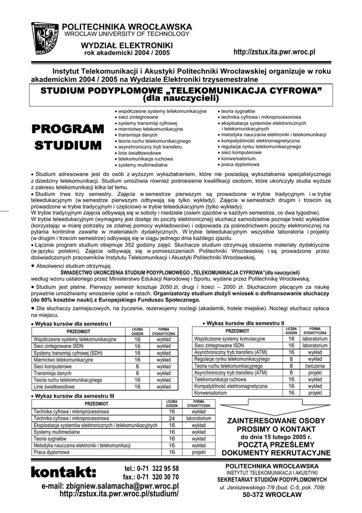 POLITECHNIKA WROCŁAWSKA WROCLAW UNIVERSITY OF TECHNOLOGY WYDZIAŁ ELEKTRONIKI http://zstux.ita.pwr.wroc.pl rok akademicki 2004 / 2005 Instytut Telekomunikacji i Akustyki Politechniki Wrocławskiej organizuje w roku akademickim 2004 / 2005 na Wydziale Elektroniki trzysemestralne STUDIUM PODYPLOMOWE „TELEKOMUNIKACJA CYFROWA” (dla nauczycieli) • współczesne systemy telekomunikacyjne • sieci zintegrowane • systemy transmisji cyfrowej • miernictwo telekomunikacyjne • transmisja danych • teoria ruchu telekomunikacyjnego • asynchroniczny tryb transferu • linie światłowodowe • telekomunikacja ruchowa • systemy multimedialne • teoria sygnałów • technika cyfrowa i mikroprocesorowa • eksploatacja systemów elektronicznych i telekomunikacyjnych • metodyka nauczania elektroniki i telekomunikacji • kompatybilność elektromagnetyczna • regulacje rynku telekomunikacyjnego • sieci komputerowe • konwersatorium. • praca dyplomowa • Studium adresowane jest do osób z wyższym wykształceniem, które nie posiadają wykształcenia specjalistycznego z dziedziny telekomunikacji. Studium umożliwia również podniesienie kwalifikacji osobom, które ukończyły studia wyższe z zakresu telekomunikacji kilka lat temu. • Studium trwa trzy semestry. Zajęcia w semestrze pierwszym są prowadzone w trybie tradycyjnym i w trybie teleedukacyjnym (w semestrze pierwszym odbywają się tylko wykłady). Zajęcia w semestrach drugim i trzecim są prowadzone w trybie tradycyjnym i częściowo w trybie teleedukacyjnym (tylko wykłady). W trybie tradycyjnym zajęcia odbywają się w soboty i niedziele (osiem zjazdów w każdym semestrze, co dwa tygodnie). W trybie teleedukacyjnym (wymagany jest dostęp do poczty elektronicznej) słuchacz samodzielnie poznaje treść wykładów (korzystając w miarę potrzeby ze zdalnej pomocy wykładowców) i odpowiada za pośrednictwem poczty elektronicznej na pytania kontrolne zawarte w materiałach dydaktycznych. W trybie teleedukacyjnym wszystkie laboratoria i projekty (w drugim i trzecim semestrze) odbywają się w ciągu jednego dnia każdego zjazdu. • Łącznie program studium obejmuje 352 godziny zajęć. Słuchacze studium otrzymują obszerne materiały dydaktyczne (w języku polskim). Zajęcia odbywają się w pomieszczeniach Politechniki Wrocławskiej i są prowadzone przez doświadczonych pracowników Instytutu Telekomunikacji i Akustyki Politechniki Wrocławskiej. • Absolwenci studium otrzymują: ŚWIADECTWO UKOŃCZENIA STUDIUM PODYPLOMOWEGO „TELEKOMUNIKACJA CYFROWA”(dla nauczycieli) według wzoru ustalonego przez Ministerstwo Edukacji Narodowej i Sportu, wydane przez Politechnikę Wrocławską. • Studium jest płatne. Pierwszy semestr kosztuje 2050 zł, drugi i trzeci – 2000 zł. Słuchaczom płacącym za naukę prywatnie umożliwiamy wnoszenie opłat w ratach. Organizatorzy studium złożyli wniosek o dofinansowanie słuchaczy (do 80% kosztów nauki) z Europejskiego Funduszu Społecznego. • Dla słuchaczy zamiejscowych, na życzenie, rezerwujemy noclegi (akademik, hotele miejskie). Noclegi słuchacz opłaca na miejscu. • Wykaz kursów dla semestru II • Wykaz kursów dla semestru I PRZEDMIOT Współczesne systemy telekomunikacyjne Sieci zintegrowane ISDN Systemy transmisji cyfrowej (SDH) Miernictwo telekomunikacyjne Sieci komputerowe Transmisja danych Teoria ruchu telekomunikacyjnego Linie światłowodowe LICZBA GODZIN FORMA DYDAKTYCZNA 16 16 16 16 8 8 16 16 wykład wykład wykład wykład wykład wykład wykład wykład • Wykaz kursów dla semestru III PRZEDMIOT Współczesne systemy komutacyjne Sieci zintegrowane ISDN Asynchroniczny tryb transferu (ATM) Regulacje rynku telekomunikacyjnego Teoria ruchu telekomunikacyjnego Asynchroniczny tryb transferu (ATM) Telekomunikacja ruchowa Kompatybilność elektromagnetyczna Konwersatorium PRZEDMIOT LICZBA GODZIN FORMA DYDAKTYCZNA Technika cyfrowa i mikroprocesorowa Technika cyfrowa i mikroprocesorowa Eksploatacja systemów elektronicznych i telekomunikacyjnych Systemy multimedialne Teoria sygnałów Metodyka nauczania elektroniki i telekomunikacji Praca dyplomowa 16 24 16 16 16 16 16 wykład laboratorium wykład wykład wykład wykład projekt tel.: 0-71 322 95 58 fax.: 0-71 320 30 70 e-mail: [email protected] http://zstux.ita.pwr.wroc.pl/studium/ LICZBA GODZIN FORMA DYDAKTYCZNA 16 16 16 8 8 8 16 16 16 laboratorium laboratorium wykład wykład ćwiczenia projekt wykład wykład projekt ZAINTERESOWANE OSOBY PROSIMY O KONTAKT do dnia 15 lutego 2005 r. POCZTĄ PRZEŚLEMY DOKUMENTY REKRUTACYJNE POLITECHNIKA WROCŁAWSKA INSTYTUT TELEKOMUNIKACJI I AKUSTYKI SEKRETARIAT STUDIÓW PODYPLOMOWYCH ul. Janiszewskiego 7/9 (bud. C-5, pok. 709) 50-372 WROCŁAW