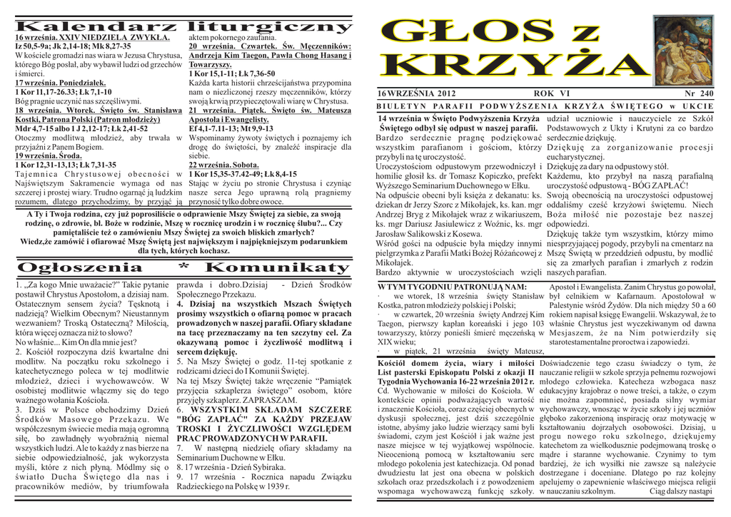 Kalendarz liturgiczny 16 wrzeœnia. XXIV NIEDZIELA ZWYK£A. Iz 50,5-9a; Jk 2,14-18; Mk 8,27-35 W koœciele gromadzi nas wiara w Jezusa Chrystusa, którego Bóg pos³a³, aby wybawi³ ludzi od grzechów i œmierci. 17 wrzeœnia. Poniedzia³ek. 1 Kor 11,17-26.33; £k 7,1-10 Bóg pragnie uczyniæ nas szczêœliwymi. 18 wrzeœnia. Wtorek. Œwiêto œw. Stanis³awa Kostki, Patrona Polski (Patron m³odzie¿y) Mdr 4,7-15 albo 1 J 2,12-17; £k 2,41-52 Otoczmy modlitw¹ m³odzie¿, aby trwa³a w przyjaŸni z Panem Bogiem. 19 wrzeœnia. Œroda. 1 Kor 12,31-13,13; £k 7,31-35 Ta j e m n i c a C h r y s t u s o w e j o b e c n o œ c i w Najœwiêtszym Sakramencie wymaga od nas szczerej i prostej wiary. Trudno ogarn¹æ j¹ ludzkim rozumem, dlatego przychodzimy, by przyj¹æ j¹ aktem pokornego zaufania. 20 wrzeœnia. Czwartek. Œw. Mêczenników: Andrzeja Kim Taegon, Paw³a Chong Hasang i Towarzyszy. 1 Kor 15,1-11; £k 7,36-50 Ka¿da karta historii chrzeœcijañstwa przypomina nam o niezliczonej rzeszy mêczenników, którzy swoj¹ krwi¹ przypieczêtowali wiarê w Chrystusa. 21 wrzeœnia. Pi¹tek. Œwiêto œw. Mateusza Aposto³a i Ewangelisty. Ef 4,1-7.11-13; Mt 9,9-13 Wspominamy ¿ywoty œwiêtych i poznajemy ich drogê do œwiêtoœci, by znaleŸæ inspiracje dla siebie. 22 wrzeœnia. Sobota. 1 Kor 15,35-37.42-49; £k 8,4-15 Staj¹c w ¿yciu po stronie Chrystusa i czyni¹c nasze serca Jego uprawn¹ rol¹ pragniemy przynosiæ tylko dobre owoce. A Ty i Twoja rodzina, czy ju¿ poprosiliœcie o odprawienie Mszy Œwiêtej za siebie, za swoj¹ rodzinê, o zdrowie, b³. Bo¿e w rodzinie, Mszê w rocznicê urodzin i w rocznicê œlubu?... Czy pamiêtaliœcie te¿ o zamówieniu Mszy Œwiêtej za swoich bliskich zmar³ych? Wiedz,¿e zamówiæ i ofiarowaæ Mszê Œwiêt¹ jest najwiêkszym i najpiêkniejszym podarunkiem dla tych, których kochasz. Og³oszenia * 1. „Za kogo Mnie uwa¿acie?” Takie pytanie postawi³ Chrystus Aposto³om, a dzisiaj nam. Ostatecznym sensem ¿ycia? Têsknot¹ i nadziej¹? Wielkim Obecnym? Nieustannym wezwaniem? Trosk¹ Ostateczn¹? Mi³oœci¹, która wiêcej oznacza ni¿ to s³owo? No w³aœnie... Kim On dla mnie jest? 2. Koœció³ rozpoczyna dziœ kwartalne dni modlitw. Na pocz¹tku roku szkolnego i katechetycznego poleca w tej modlitwie m³odzie¿, dzieci i wychowawców. W osobistej modlitwie w³¹czmy siê do tego wa¿nego wo³ania Koœcio³a. 3. Dziœ w Polsce obchodzimy Dzieñ Œrodków Masowego Przekazu. We wspó³czesnym œwiecie media maj¹ ogromn¹ si³ê, bo zaw³adnê³y wyobraŸni¹ niemal wszystkich ludzi. Ale to ka¿dy z nas bierze na siebie odpowiedzialnoœæ, jak wykorzysta myœli, które z nich p³yn¹. Módlmy siê o œwiat³o Ducha Œwiêtego dla nas i pracowników mediów, by triumfowa³a prawda i dobro.Dzisiaj - Dzieñ Œrodków Spo³ecznego Przekazu. 4. Dzisiaj na wszystkich Mszach Œwiêtych prosimy wszystkich o ofiarn¹ pomoc w pracach prowadzonych w naszej parafii. Ofiary sk³adane na tacê przeznaczamy na ten szczytny cel. Za okazywan¹ pomoc i ¿yczliwoœæ modlitw¹ i sercem dziêkujê. 5. Na Mszy Œwiêtej o godz. 11-tej spotkanie z rodzicami dzieci do I Komunii Œwiêtej. Na tej Mszy Œwiêtej tak¿e wrêczenie “Pami¹tek przyjêcia szkaplerza œwiêtego” osobom, które przyjê³y szkaplerz. ZAPRASZAM. 6. WSZYSTKIM SK£ADAM SZCZERE "BÓG ZAP£AÆ" ZA KA¯DY PRZEJAW TROSKI I ¯YCZLIWOŒCI WZGLÊDEM PRAC PROWADZONYCH W PARAFII. 7. W nastêpn¹ niedzielê ofiary sk³adamy na Seminarium Duchowne w E³ku. 8. 17 wrzeœnia - Dzieñ Sybiraka. 9. 17 wrzeœnia - Rocznica napadu Zwi¹zku Radzieckiego na Polskê w 1939 r. Bazylika zim¹ Komunikaty G£OS z KRZY¯A 16 WRZEŒNIA 2012 ROK VI Nr 240 B I U L E T Y N PA R A F I I P O D W Y ¯ S Z E N I A K R Z Y ¯ A Œ W I Ê T E G O w U K C I E 14 wrzeœnia w Œwiêto Podwy¿szenia Krzy¿a Œwiêtego odby³ siê odpust w naszej parafii. Bardzo serdecznie pragnê podziêkowaæ wszystkim parafianom i goœciom, którzy przybyli na tê uroczystoœæ. Uroczystoœciom odpustowym przewodniczy³ i homilie g³osi³ ks. dr Tomasz Kopiczko, prefekt Wy¿szego Seminarium Duchownego w E³ku. Na odpuœcie obecni byli ksiê¿a z dekanatu: ks. dziekan dr Jerzy Szorc z Miko³ajek, ks. kan. mgr Andrzej Bryg z Miko³ajek wraz z wikariuszem, ks. mgr Dariusz Jasiulewicz z WoŸnic, ks. mgr Jaros³aw Salikowski z Kosewa. Wœród goœci na odpuœcie by³a miêdzy innymi pielgrzymka z Parafii Matki Bo¿ej Ró¿añcowej z Miko³ajek. Bardzo aktywnie w uroczystoœciach wziêli udzia³ uczniowie i nauczyciele ze Szkó³ Podstawowych z Ukty i Krutyni za co bardzo serdecznie dziêkujê. Dziêkujê za zorganizowanie procesji eucharystycznej. Dziêkujê za dary na odpustowy stó³. Ka¿demu, kto przyby³ na nasz¹ parafialn¹ uroczystoœæ odpustow¹ - BÓG ZAP£AÆ! Swoj¹ obecnoœci¹ na uroczystoœci odpustowej oddaliœmy czeœæ krzy¿owi œwiêtemu. Niech Bo¿a mi³oœæ nie pozostaje bez naszej odpowiedzi. Dziêkujê tak¿e tym wszystkim, którzy mimo niesprzyjaj¹cej pogody, przybyli na cmentarz na Mszê Œwiêt¹ w przeddzieñ odpustu, by modliæ siê za zmar³ych parafian i zmar³ych z rodzin naszych parafian. W TYM TYGODNIU PATRONUJ¥ NAM: Aposto³ i Ewangelista. Zanim Chrystus go powo³a³, · we wtorek, 18 wrzeœnia œwiêty Stanis³aw by³ celnikiem w Kafarnaum. Aposto³owa³ w Kostka, patron m³odzie¿y polskiej i Polski; Palestynie wœród ¯ydów. Dla nich miêdzy 50 a 60 · w czwartek, 20 wrzeœnia œwiêty Andrzej Kim rokiem napisa³ ksiêgê Ewangelii. Wskazywa³, ¿e to Taegon, pierwszy kap³an koreañski i jego 103 w³aœnie Chrystus jest wyczekiwanym od dawna towarzyszy, którzy ponieœli œmieræ mêczeñsk¹ w Mesjaszem, ¿e na Nim potwierdzi³y siê XIX wieku; starotestamentalne proroctwa i zapowiedzi. · w pi¹tek, 21 wrzeœnia œwiêty Mateusz, Koœció³ domem ¿ycia, wiary i mi³oœci Doœwiadczenie tego czasu œwiadczy o tym, ¿e List pasterski Episkopatu Polski z okazji II nauczanie religii w szkole sprzyja 