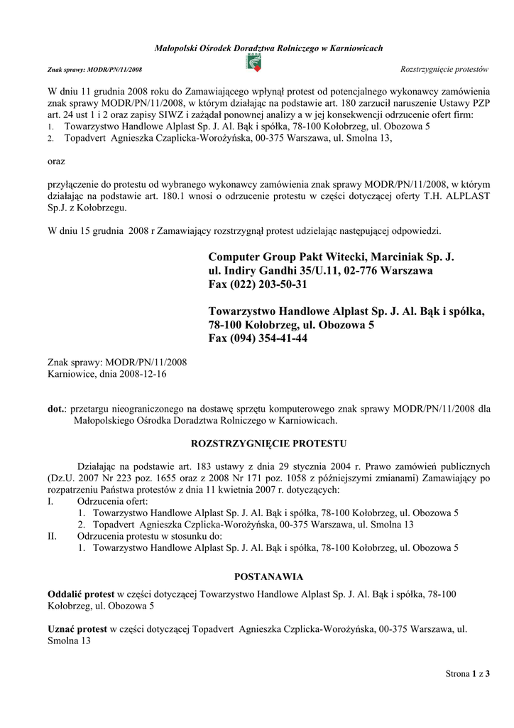 Małopolski Ośrodek Doradztwa Rolniczego w Karniowicach Rozstrzygnięcie protestów Znak sprawy: MODR/PN/11/2008 W dniu 11 grudnia 2008 roku do Zamawiającego wpłynął protest od potencjalnego wykonawcy zamówienia znak sprawy MODR/PN/11/2008, w którym działając na podstawie art. 180 zarzucił naruszenie Ustawy PZP art. 24 ust 1 i 2 oraz zapisy SIWZ i zażądał ponownej analizy a w jej konsekwencji odrzucenie ofert firm: 1. Towarzystwo Handlowe Alplast Sp. J. Al. Bąk i spółka, 78-100 Kołobrzeg, ul. Obozowa 5 2. Topadvert Agnieszka Czaplicka-Worożyńska, 00-375 Warszawa, ul. Smolna 13, oraz przyłączenie do protestu od wybranego wykonawcy zamówienia znak sprawy MODR/PN/11/2008, w którym działając na podstawie art. 180.1 wnosi o odrzucenie protestu w części dotyczącej oferty T.H. ALPLAST Sp.J. z Kołobrzegu. W dniu 15 grudnia 2008 r Zamawiający rozstrzygnął protest udzielając następującej odpowiedzi. Computer Group Pakt Witecki, Marciniak Sp. J. ul. Indiry Gandhi 35/U.11, 02-776 Warszawa Fax (022) 203-50-31 Towarzystwo Handlowe Alplast Sp. J. Al. Bąk i spółka, 78-100 Kołobrzeg, ul. Obozowa 5 Fax (094) 354-41-44 Znak sprawy: MODR/PN/11/2008 Karniowice, dnia 2008-12-16 dot.: przetargu nieograniczonego na dostawę sprzętu komputerowego znak sprawy MODR/PN/11/2008 dla Małopolskiego Ośrodka Doradztwa Rolniczego w Karniowicach. ROZSTRZYGNIĘCIE PROTESTU Działając na podstawie art. 183 ustawy z dnia 29 stycznia 2004 r. Prawo zamówień publicznych (Dz.U. 2007 Nr 223 poz. 1655 oraz z 2008 Nr 171 poz. 1058 z późniejszymi zmianami) Zamawiający po rozpatrzeniu Państwa protestów z dnia 11 kwietnia 2007 r. dotyczących: I. Odrzucenia ofert: 1. Towarzystwo Handlowe Alplast Sp. J. Al. Bąk i spółka, 78-100 Kołobrzeg, ul. Obozowa 5 2. Topadvert Agnieszka Czplicka-Worożyńska, 00-375 Warszawa, ul. Smolna 13 II. Odrzucenia protestu w stosunku do: 1. Towarzystwo Handlowe Alplast Sp. J. Al. Bąk i spółka, 78-100 Kołobrzeg, ul. Obozowa 5 POSTANAWIA Oddalić protest w części dotyczącej Towarzystwo Handlowe Alplast Sp. J. Al. Bąk i spółka, 78-100 Kołobrzeg, ul. Obozowa 5 Uznać protest w części dotyczącej Topadvert Agnieszka Czplicka-Worożyńska, 00-375 Warszawa, ul. Smolna 13 Strona 1 z 3 Małopolski Ośrodek Doradztwa Rolniczego w Karniowicach Rozstrzygnięcie protestów Znak sprawy: MODR/PN/11/2008 UZASADNIENIE Część I. W dniu 11 grudnia 2008 roku do Zamawiającego wpłynął protest od potencjalnego wykonawcy zamówienia znak sprawy MODR/PN/11/2008 Firmy Computer Group PAKT z Warszawy, w którym działając na podstawie art. 180 zarzucił naruszenie Ustawy PZP i zażądał ponownej analizy a w jej konsekwencji odrzucenie ofert firm: 1. Towarzystwo Handlowe Alplast Sp. J. Al. Bąk i spółka, 78-100 Kołobrzeg, ul. Obozowa 5 ze względu na: a. art. 24 ust 1 i 2 oraz zapisy SIWZ - nie spełnienie wymagań Zamawiającego zawartych w punkcie III SIWZ poprzez zaoferowanie płyty głównej firmy ASUS (modelM2N68-AM) w standardzie mocroATX według protestującego gorszym od pożądanego. Zamawiający po ponownej analizie oferty nie zgadza się ze stanowiskiem protestującego. W pkt. III SIWZ Zamawiający nie wymagał jednoznacznie i zdecydowanie danego rodzaju i typu płyty lecz określił minimalne wymagania jakie ma ona spełniać pod względem standardu, ilości i typów gniazd, portów etc. Zaproponowana płyta microATX jest rozwiązaniem nowszym, będącym technologicznym rozwinięciem standardu ATX, wprowadzonym 4 lata po publikacji założeń pierwotnego standardu ATX i w ocenie Zamawiającego spełnia wymagania postawione w SIWZ. W trakcie postępowania do Zamawiającego nie wpłynęło zapytanie czy rozwiązanie będące przedmiotem protestu jest dopuszczalne w związku z czym nie została udzielona żadna informacja na ten temat. Oferenci sami decydowali na podstawie SIWZ i własnego doświadczenia co i w jakiej cenie będą oferować. b. według protestującego Firma ALPLAST w ofercie nie określiła producenta i modelu proponowanej pamięci RAM. Zamawiający na podstawie posiadanych dokumentów stwierdza, iż Firma ALPLAST w swej ofercie określiła producenta i model pamięci RAM, jest ona zgodna z wymaganiami SIWZ i nie ma podstaw aby zgodzić się ze stanowiskiem protestującego. Firma ALPLAST Sp.J. w Kołobrzegu jednoznacznie potwierdziła fakt bycia producentem oferowanej pamięci, której parametry techniczne są zgodne z wymogami SIWZ a jako producent ma prawo do własnego nazewnictwa produktu. 2. Topadvert Agnieszka Czaplicka-Worożyńska, 00-375 Warszawa, ul. Smolna 13 ze względu na: a. art. 24 ust 1 i 2 oraz zapisy SIWZ - nie spełnienie wymagań Zamawiającego zawartych w punkcie III SIWZ poprzez zaoferowanie płyty głównej firmy ASUS (modelM2N68-AM) w standardzie mocroATX według protestującego gorszym od pożądanego. Zamawiający po ponownej analizie oferty nie zgadza się ze stanowiskiem protestującego podając uzasadnienie jak w pkt. 1.a. b. Do oferty nie załączono tłumaczenia certyfikatów wykonanych przez tłumacza przysięgłego Zamawiający przeprowadził ponownie szczegółową analizę przedmiotowych ofert i zgadza się z protestującym w części odrzucenia oferty. Strona 2 z 3 Małopolski Ośrodek Doradztwa Rolniczego w Karniowicach Znak sprawy: MODR/PN/11/2008 Rozstrzygnięcie protestów Część II W dniu 11 grudnia 2008 roku do Zamawiającego wpłynęło przyłączenie do protestu od wybranego wykonawcy zamówienia znak sprawy MODR/PN/11/2008 Firmy TH ALPLAST Sp. J. z Kołobrzegu, w którym działając na podstawie art. 180 wnosi o odrzucenie protestu w części dotyczącej oferty TH ALPLAST Sp. J. gdyż ewentualne jego przyjęcie spowoduje naruszenie interesu prawnego oferenta i przepisy Ustawy PZP art.. 89.1.2 oraz 89.1.3, a w konsekwencji także art. 91.1. Zamawiający po przeanalizowaniu posiadanych dokumentów ofertowych jak i dotyczących protestów zgadza się ze stanowiskiem protestującego w części