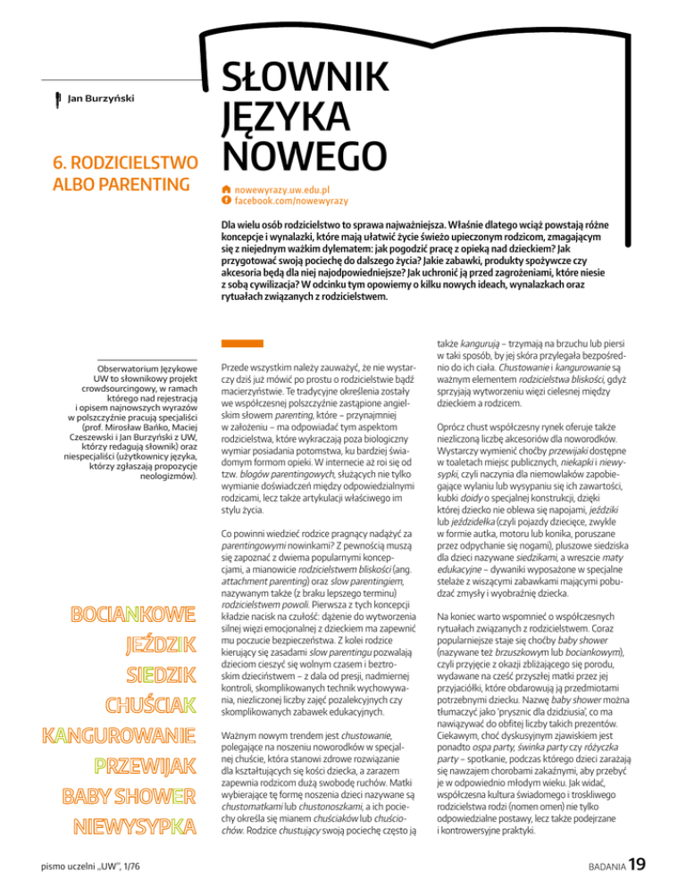 íí Jan Burzyński 6. RODZICIELSTWO ALBO PARENTING SŁOWNIK JĘZYKA NOWEGO Á Á nowewyrazy.uw.edu.pl facebook.com/nowewyrazy Dla wielu osób rodzicielstwo to sprawa najważniejsza. Właśnie dlatego wciąż powstają różne koncepcje i wynalazki, które mają ułatwić życie świeżo upieczonym rodzicom, zmagającym się z niejednym ważkim dylematem: jak pogodzić pracę z opieką nad dzieckiem? Jak przygotować swoją pociechę do dalszego życia? Jakie zabawki, produkty spożywcze czy akcesoria będą dla niej najodpowiedniejsze? Jak uchronić ją przed zagrożeniami, które niesie z sobą cywilizacja? W odcinku tym opowiemy o kilku nowych ideach, wynalazkach oraz rytuałach związanych z rodzicielstwem. Obserwatorium Językowe UW to słownikowy projekt crowdsourcingowy, w ramach którego nad rejestracją i opisem najnowszych wyrazów w polszczyźnie pracują specjaliści (prof. Mirosław Bańko, Maciej Czeszewski i Jan Burzyński z UW, którzy redagują słownik) oraz niespecjaliści (użytkownicy języka, którzy zgłaszają propozycje neologizmów). Przede wszystkim należy zauważyć, że nie wystarczy dziś już mówić po prostu o rodzicielstwie bądź macierzyństwie. Te tradycyjne określenia zostały we współczesnej polszczyźnie zastąpione angielskim słowem parenting, które – przynajmniej w założeniu – ma odpowiadać tym aspektom rodzicielstwa, które wykraczają poza biologiczny wymiar posiadania potomstwa, ku bardziej świadomym formom opieki. W internecie aż roi się od tzw. blogów parentingowych, służących nie tylko wymianie doświadczeń między odpowiedzialnymi rodzicami, lecz także artykulacji właściwego im stylu życia. Co powinni wiedzieć rodzice pragnący nadążyć za parentingowymi nowinkami? Z pewnością muszą się zapoznać z dwiema popularnymi koncepcjami, a mianowicie rodzicielstwem bliskości (ang. attachment parenting) oraz slow parentingiem, nazywanym także (z braku lepszego terminu) rodzicielstwem powoli. Pierwsza z tych koncepcji kładzie nacisk na czułość: dążenie do wytworzenia silnej więzi emocjonalnej z dzieckiem ma zapewnić mu poczucie bezpieczeństwa. Z kolei rodzice kierujący się zasadami slow parentingu pozwalają dzieciom cieszyć się wolnym czasem i beztroskim dzieciństwem – z dala od presji, nadmiernej kontroli, skomplikowanych technik wychowywania, niezliczonej liczby zajęć pozalekcyjnych czy skomplikowanych zabawek edukacyjnych. Ważnym nowym trendem jest chustowanie, polegające na noszeniu noworodków w specjalnej chuście, która stanowi zdrowe rozwiązanie dla kształtujących się kości dziecka, a zarazem zapewnia rodzicom dużą swobodę ruchów. Matki wybierające tę formę noszenia dzieci nazywane są chustomatkami lub chustonoszkami, a ich pociechy określa się mianem chuściaków lub chuściochów. Rodzice chustujący swoją pociechę często ją pismo uczelni „UW”, 1/76 także kangurują – trzymają na brzuchu lub piersi w taki sposób, by jej skóra przylegała bezpośrednio do ich ciała. Chustowanie i kangurowanie są ważnym elementem rodzicielstwa bliskości, gdyż sprzyjają wytworzeniu więzi cielesnej między dzieckiem a rodzicem. Oprócz chust współczesny rynek oferuje także niezliczoną liczbę akcesoriów dla noworodków. Wystarczy wymienić choćby przewijaki dostępne w toaletach miejsc publicznych, niekapki i niewysypki, czyli naczynia dla niemowlaków zapobiegające wylaniu lub wysypaniu się ich zawartości, kubki doidy o specjalnej konstrukcji, dzięki której dziecko nie oblewa się napojami, jeździki lub jeździdełka (czyli pojazdy dziecięce, zwykle w formie autka, motoru lub konika, poruszane przez odpychanie się nogami), pluszowe siedziska dla dzieci nazywane siedzikami, a wreszcie maty edukacyjne – dywaniki wyposażone w specjalne stelaże z wiszącymi zabawkami mającymi pobudzać zmysły i wyobraźnię dziecka. Na koniec warto wspomnieć o współczesnych rytuałach związanych z rodzicielstwem. Coraz popularniejsze staje się choćby baby shower (nazywane też brzuszkowym lub bociankowym), czyli przyjęcie z okazji zbliżającego się porodu, wydawane na cześć przyszłej matki przez jej przyjaciółki, które obdarowują ją przedmiotami potrzebnymi dziecku. Nazwę baby shower można tłumaczyć jako ‘prysznic dla dzidziusia’, co ma nawiązywać do obfitej liczby takich prezentów. Ciekawym, choć dyskusyjnym zjawiskiem jest ponadto ospa party, świnka party czy różyczka party – spotkanie, podczas którego dzieci zarażają się nawzajem chorobami zakaźnymi, aby przebyć je w odpowiednio młodym wieku. Jak widać, współczesna kultura świadomego i troskliwego rodzicielstwa rodzi (nomen omen) nie tylko odpowiedzialne postawy, lecz także podejrzane i kontrowersyjne praktyki. BADANIA 19