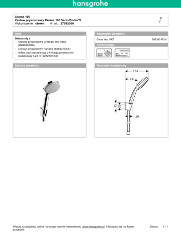Croma 100 Zestaw prysznicowy Croma 100 Vario/Porter'S Wykonczenie : chrom___Nr art. : 27592000 Opis Szczegóły produktu Składa się z · Główka prysznicowa Croma® 100 Vario (#28535XXX) Cena bez VAT 209,00-PLN Technologia · Uchwyt prysznicowy Porter'S (#28331XXX) · Isiflex wąż prysznicowy z imitacją powierzchni metalicznej 1,25 m (#28272XXX) Zdjecie produktu Rysunek wymiarowy Więcej szczegółów online na naszej stronie internetowej_www.hansgrohe.pl_Cieszymy się na Twoje przybycie Strona 1/1