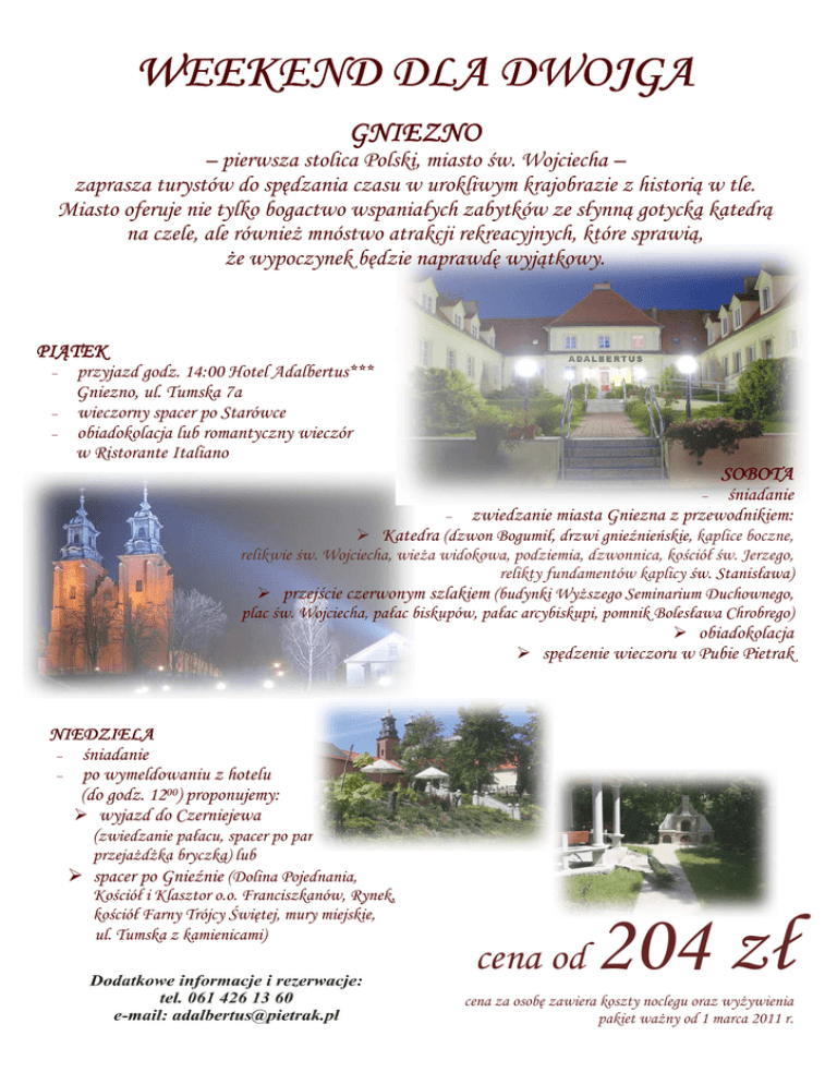WEEKEND DLA DWOJGA GNIEZNO – pierwsza stolica Polski, miasto św. Wojciecha – zaprasza turystów do spędzania czasu w urokliwym krajobrazie z historią w tle. Miasto oferuje nie tylko bogactwo wspaniałych zabytków ze słynną gotycką katedrą na czele, ale równieŜ mnóstwo atrakcji rekreacyjnych, które sprawią, Ŝe wypoczynek będzie naprawdę wyjątkowy. PIĄTEK − − − przyjazd godz. 14:00 Hotel Adalbertus*** Gniezno, ul. Tumska 7a wieczorny spacer po Starówce obiadokolacja lub romantyczny wieczór w Ristorante Italiano SOBOTA śniadanie zwiedzanie miasta Gniezna z przewodnikiem: − − Katedra (dzwon Bogumił, drzwi gnieźnieńskie, kaplice boczne, relikwie św. Wojciecha, wieŜa widokowa, podziemia, dzwonnica, kościół św. Jerzego, relikty fundamentów kaplicy św. Stanisława) przejście czerwonym szlakiem (budynki WyŜszego Seminarium Duchownego, plac św. Wojciecha, pałac biskupów, pałac arcybiskupi, pomnik Bolesława Chrobrego) obiadokolacja spędzenie wieczoru w Pubie Pietrak NIEDZIELA − śniadanie − po wymeldowaniu z hotelu (do godz. 1200) proponujemy: wyjazd do Czerniejewa (zwiedzanie pałacu, spacer po parku, przejaŜdŜka bryczką) lub spacer po Gnieźnie (Dolina Pojednania, Kościół i Klasztor o.o. Franciszkanów, Rynek, kościół Farny Trójcy Świętej, mury miejskie, ul. Tumska z kamienicami) cena od 204 zł cena za osobę zawiera koszty noclegu oraz wyŜywienia pakiet waŜny od 1 marca 2011 r.