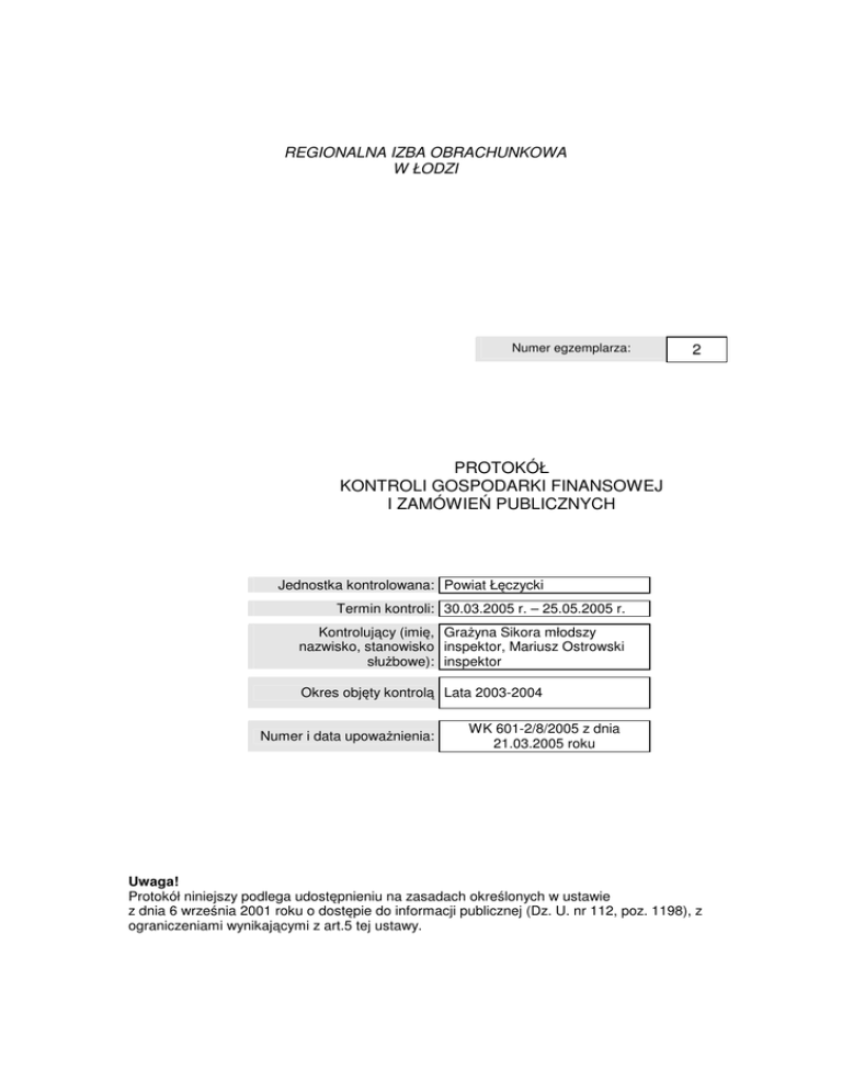 REGIONALNA IZBA OBRACHUNKOWA W ŁODZI Numer egzemplarza: 2 PROTOKÓŁ KONTROLI GOSPODARKI FINANSOWEJ I ZAMÓWIEŃ PUBLICZNYCH Jednostka kontrolowana: Powiat Łęczycki Termin kontroli: 30.03.2005 r. – 25.05.2005 r. Kontrolujący (imię, Grażyna Sikora młodszy nazwisko, stanowisko inspektor, Mariusz Ostrowski służbowe): inspektor Okres objęty kontrolą Lata 2003-2004 Numer i data upoważnienia: WK 601-2/8/2005 z dnia 21.03.2005 roku Uwaga! Protokół niniejszy podlega udostępnieniu na zasadach określonych w ustawie z dnia 6 września 2001 roku o dostępie do informacji publicznej (Dz. U. nr 112, poz. 1198), z ograniczeniami wynikającymi z art.5 tej ustawy. PROTOKÓŁ Z KONTROLI KOMPLEKSOWEJ PRZEPROWADZONEJ W POWIECIE ŁĘCZYCKIM Regionalna Izba Obrachunkowa w Łodzi, ul. Zamenhofa 10 90-431 Łódź, tel. 42-6366896, fax 6367424 I. INFORMACJE WSTĘPNE DANE O JEDNOSTCE Powiat Łęczycki utworzony został na obszarze o powierzchni 774 km 2. Liczba ludności według stanu na dzień 30.06.2004 roku wyniosła 54.285 osób. Według stanu na dzień 31 marca 2005 roku w Powiecie Łęczyckim 5.158 mieszkańców posiada status osoby bezrobotnej (w tym 2.451 kobiet). W skład powiatu wchodzi 8 jednostek administracyjnych: miasto Łęczyca oraz gminy: Daszyna, Góra Świętej Małgorzaty, Grabów, Łęczyca, Piątek, Świnice Warckie, Witonia. Stolica Powiatu – Łęczyca posiada bardzo korzystne położenie geograficzne, leży bowiem 35 km od Łodzi, przy trasie krajowej nr 1 Łódź - Gdańsk. Siedziba Starostwa mieści się w Łęczycy przy Pl. Tadeusza Kościuszki 1, kod pocztowy: 99-100. Starostwo Powiatowe posiada następujące numery: NIP 775-20-58-282 oraz REGON 611015610. Powiat Łęczycki posiada następujące numery: NIP 507-00-11-299 oraz REGON 611016123. Rodzaj kontroli: publicznych. II. kompleksowa kontrola gospodarki finansowej i zamówień USTALENIA OGÓLNE 1. KIEROWNICTWO JEDNOSTKI Przewodniczący rady powiatu Przewodniczącym Rady Powiatu Łęczyckiego jest pan Krzysztof Hopaluk wybrany na mocy uchwały nr 3/I/2002 Rady Powiatu Łęczyckiego z dnia 19 listopada 2002 roku. Wiceprzewodniczącymi Rady Powiatu Łęczyckiego są: pani Barbara Ulężałka i pan Mirosław Karkowski wybrani na podstawie uchwały nr 6/I/2002 Rady Powiatu Łęczyckiego z dnia 19 listopada 2002 roku. Starosta i pozostali członkowie zarządu powiatu Starostą Łęczyckim jest pan Zbigniew Wojtera wybrany na mocy uchwały Rady Powiatu Łęczyckiego nr 9/I/2002 z dnia 19 listopada 2002 roku. Wicestarostą Łęczyckim jest pan Janusz Mielczarek wybrany uchwałą Rady Powiatu Łęczyckiego nr 12/I/2002 z dnia 19 listopada 2002 roku. Ponadto członkami Zarządu Powiatu Łęczyckiego są: Michał Czekalski, Marek Kolisa, Marek Lepaczyk wybrani na mocy uchwały nr 15/I/2002 Rady Powiatu Łęczyckiego z dnia 19 listopada 2002 roku. _____________________________________________________ 2 PROTOKÓŁ Z KONTROLI KOMPLEKSOWEJ PRZEPROWADZONEJ W POWIECIE ŁĘCZYCKIM Regionalna Izba Obrachunkowa w Łodzi, ul. Zamenhofa 10 90-431 Łódź, tel. 42-6366896, fax 6367424 Skarbnik powiatu Skarbnikiem Powiatu Łęczyckiego do dnia 25 maja 2004 roku była pani Krystyna Wenerska powołana uchwałą Rady Powiatu Łęczyckiego nr 20/III/98 z dnia 12 grudnia 1998 roku, którą odwołano uchwałą Rady Powiatu Łęczyckiego nr XVI/128/2004 z dnia 26 maja 2004 roku. Obecnie Skarbnikiem Powiatu Łęczyckiego jest pani Renata Wilińska powołana na to stanowisko uchwałą nr XVI/129/2004 Rady Powiatu Łęczyckiego z dnia 26 maja 2004 roku. Sekretarz powiatu Sekretarzem Powiatu Łęczyckiego do dnia 10 lutego 2004 roku była pani Anna Kupisz powołana uchwałą Rady Powiatu Łęczyckiego nr 25/IV/98 z dnia 28 grudnia 1998 roku, którą odwołano uchwałą Rady Powiatu Łęczyckiego nr XIIII/96/2004 z dnia 10 lutego 2004 roku. Obecnie Sekretarzem Powiatu Łęczyckiego jest pan Wiesław Żurawicz powołany na to stanowisko uchwałą nr XIII/97/2004 Rady Powiatu Łęczyckiego z dnia 10 lutego 2004 roku. 2. POWIATOWE JEDNOSTKI ORGANIZACYJNE I PRAWNOORGANIZACYJNE FORMY ICH DZIAŁALNOŚCI Na terenie powiatu Łęczyckiego funkcjonuje 17 niżej wymienionych jednostek organizacyjnych: 1. Zespół Opieki Zdrowotnej w Łęczycy, 2. Liceum Ogólnokształcące im. Kazimierza Wielkiego w Łęczycy, 3. Wieczorowe Liceum Ogólnokształcące dla Dorosłych w Łęczycy, 4. Zespół Szkół Ponadgimnazjalnych nr 1 w Łęczycy, 5. Zespół Szkół Zawodowych nr 2 w Łęczycy, 6. Zespół Szkół Mechanizacji Rolnictwa w Piątku, 7. Centrum Kształcenia Praktycznego w Piątku, 8. Bursa Szkolna w Łęczycy, 9. Powiatowa Poradnia Psychologiczno-Pedagogiczna w Łęczycy, 10. Specjalny Ośrodek Szkolno-Wychowawczy w Łęczycy, 11. Specjalny Ośrodek Szkolno-Wychowawczy w Stemplewie, 12. Zespół Jednostek Budżetowych w Łęczycy, 13. Powiatowe Centrum Pomocy Rodzinie w Łęczycy, 14. Dom Pomocy Społecznej w Łęczycy, 15. Dom Pomocy Społecznej w Krasznicach, 16. Zarząd Dróg Powiatowych w Łęczycy, 17. Powiatowy Urząd Pracy w Łęczycy. _____________________________________________________ 3 PROTOKÓŁ Z KONTROLI KOMPLEKSOWEJ PRZEPROWADZONEJ W POWIECIE ŁĘCZYCKIM Regionalna Izba Obrachunkowa w Łodzi, ul. Zamenhofa 10 90-431 Łódź, tel. 42-6366896, fax 6367424 Wszystkie jednostki organizacyjne działają jako jednostki budżetowe. 3. UNORMOWANIA WEWNĘTRZNE Statut powiatu Uchwałą nr 22/IV/98 Rady Powiatu Łęczyckiego z dnia 28 grudnia 1998 roku uchwalono Statut Powiatu Łęczyckiego. Statut Powiatu Łęczyckiego był zmieniany niżej wymienionymi uchwałami Rady Powiatu: − nr 35/VI/99 z dnia 5 marca 1999 roku, − nr 137/XVIII/2000 z dnia 31 maja 2000 roku, − nr 180/XXVIII/01 z dnia 29 sierpnia 2001 roku, − nr 24/III/02 z dnia 30 grudnia 2002 roku, − nr XII/87/03 z dnia 30 grudnia 2003 roku, − nr XVI/117/04 z dnia 26 maja 2004 roku. Regulamin organizacyjny starostwa Strukturę organizacyjną i zakres działania Starostwa Powiatowego w 