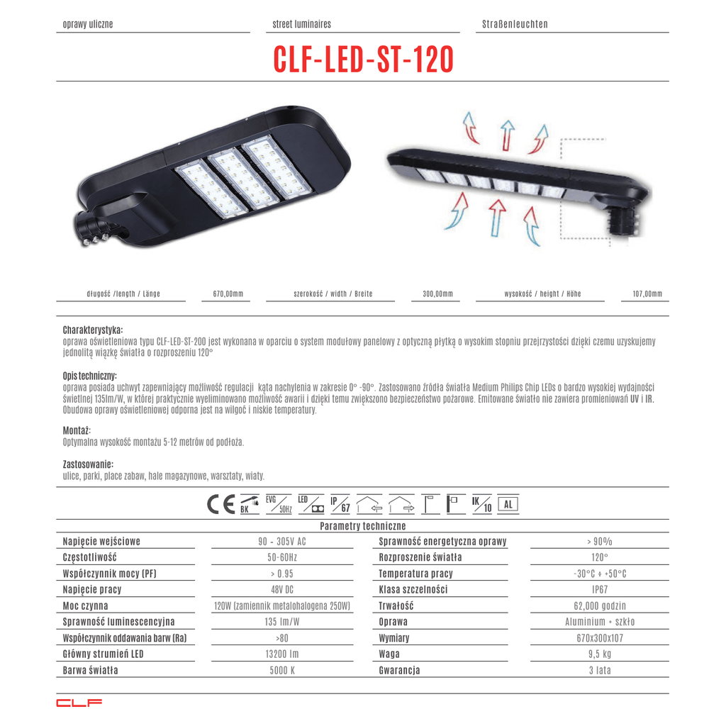 oprawy uliczne street luminaires Straßenleuchten CLF-LED-ST-120 długość /length / Länge 670,00mm szerokość / width / Breite 300,00mm wysokość / height / Höhe 107,00mm Charakterystyka: oprawa oświetleniowa typu CLF-LED-ST-200 jest wykonana w oparciu o system modułowy panelowy z optyczną płytką o wysokim stopniu przejrzystości dzięki czemu uzyskujemy jednolitą wiązkę światła o rozproszeniu 120° Opis techniczny: oprawa posiada uchwyt zapewniający możliwość regulacji kąta nachylenia w zakresie 0° -90°. Zastosowano źródła światła Medium Philips Chip LEDs o bardzo wysokiej wydajności świetlnej 135lm/W, w której praktycznie wyeliminowano możliwość awarii i dzięki temu zwiększono bezpieczeństwo pożarowe. Emitowane światło nie zawiera promieniowań UV i IR. Obudowa oprawy oświetleniowej odporna jest na wilgoć i niskie temperatury. Montaż: Optymalna wysokość montażu 5-12 metrów od podłoża. Zastosowanie: ulice, parki, place zabaw, hale magazynowe, warsztaty, wiaty. Parametry techniczne Napięcie wejściowe Częstotliwość Współczynnik mocy (PF) Napięcie pracy Moc czynna Sprawność luminescencyjna Współczynnik oddawania barw (Ra) Główny strumień LED Barwa światła Clf 90 – 305V AC 50-60Hz Sprawność energetyczna oprawy Rozproszenie światła > 0.95 Temperatura pracy 48V DC Klasa szczelności 120W (zamiennik metalohalogena 250W) Trwałość > 90% 120° -30°C ÷ +50°C IP67 62,000 godzin 135 lm/W Oprawa Aluminium + szkło >80 Wymiary 670x300x107 13200 lm 5000 K Waga 9,5 kg Gwarancja 3 lata oprawy przemysłowe industrial fittings industriebeleuchtung CLF-LED-ST-120 follow the light CLF