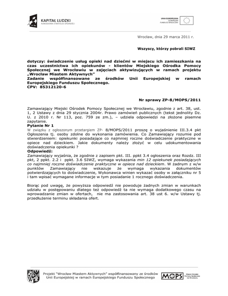 Wrocław, dnia 29 marca 2011 r. Wszyscy, którzy pobrali SIWZ dotyczy: świadczenie usług opieki nad dziećmi w miejscu ich zamieszkania na czas uczestnictwa ich opiekunów - klientów Miejskiego Ośrodka Pomocy Społecznej we Wrocławiu w zajęciach aktywizujących w ramach projektu „Wrocław Miastem Aktywnych” Zadanie współfinansowane ze środków Unii Europejskiej w ramach Europejskiego Funduszu Społecznego. CPV: 85312120-6 Nr sprawy ZP-8/MOPS/2011 Zamawiający Miejski Ośrodek Pomocy Społecznej we Wrocławiu, zgodnie z art. 38, ust. 1, 2 Ustawy z dnia 29 stycznia 2004r. Prawo zamówień publicznych (tekst jednolity Dz. U. z 2010 r. Nr 113, poz. 759 ze zm.), – udziela odpowiedzi na złoŜone pisemne zapytanie. Pytanie Nr 1 W związku z ogłoszonym przetargiem ZP- 8/MOPS/2011 proszę o wyjaśnienie III.3.4 pkt Ogłoszenia tj. osoby zdolne do wykonania zamówienia. Co Zamawiający rozumie pod stwierdzeniem: opiekunki posiadające co najmniej roczne doświadczenie praktyczne w opiece nad dzieckiem. Jakie dokumenty naleŜy złoŜyć w celu udokumentowania doświadczenia opiekunki ? Odpowiedź: Zamawiający wyjaśnia, Ŝe zgodnie z zapisem pkt. III. ppkt 3.4 ogłoszenia oraz Rozdz. III pkt, 2 ppkt. 2.2 i ppkt. 3.6 SIWZ, wymaga wykazania min 12 opiekunek posiadających co najmniej roczne doświadczenie praktyczne w opiece nad dzieckiem. W Ŝadnym z w/w punktów Zamawiający nie wskazuje Ŝe wymaga wykazania dokumentów potwierdzających to doświadczenie, Wykonawca winien wykazać osoby w załączniku nr 5 i tam wpisać wymagane informacje w tym posiadanie 1 rocznego doświadczenia. Biorąc pod uwagę, Ŝe powyŜsza odpowiedź nie powoduje Ŝadnych zmian w warunkach udziału w postępowaniu dlatego teŜ odpowiedź ta nie wymaga dodatkowego czasu na wprowadzanie zmian w ofertach, nie ma zastosowania art. 38 ust 6. w/w Ustawy tj. przedłuŜenie terminu składania ofert.