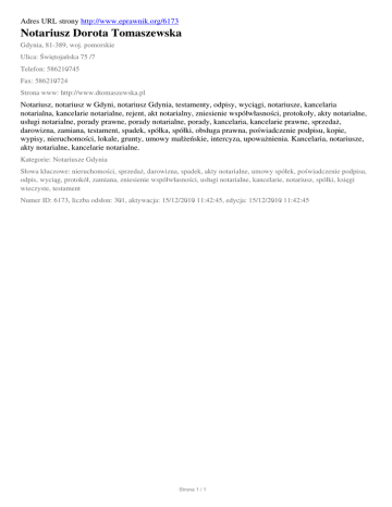 Adres URL strony http://www.eprawnik.org/6173 Notariusz Dorota Tomaszewska Gdynia, 81-389, woj. pomorskie Ulica: Świętojańska 75 /7 Telefon: 586210745 Fax: 586210724 Strona www: http://www.dtomaszewska.pl Notariusz, notariusz w Gdyni, notariusz Gdynia, testamenty, odpisy, wyciągi, notariusze, kancelaria notarialna, kancelarie notarialne, rejent, akt notarialny, zniesienie współwłasności, protokoły, akty notarialne, usługi notarialne, porady prawne, porady notarialne, porady, kancelaria, kancelarie prawne, sprzedaż, darowizna, zamiana, testament, spadek, spółka, spółki, obsługa prawna, poświadczenie podpisu, kopie, wypisy, nieruchomości, lokale, grunty, umowy małżeńskie, intercyza, upoważnienia. Kancelaria, notariusze, akty notarialne, kancelarie notarialne. Kategorie: Notariusze Gdynia Słowa kluczowe: nieruchomości, sprzedaż, darowizna, spadek, akty notarialne, umowy spółek, poświadczenie podpisu, odpis, wyciąg, protokół, zamiana, zniesienie współwłasności, usługi notarialne, kancelarie, notariusz, spółki, księgi wieczyste, testament Numer ID: 6173, liczba odsłon: 301, aktywacja: 15/12/2010 11:42:45, edycja: 15/12/2010 11:42:45 Strona 1 / 1
