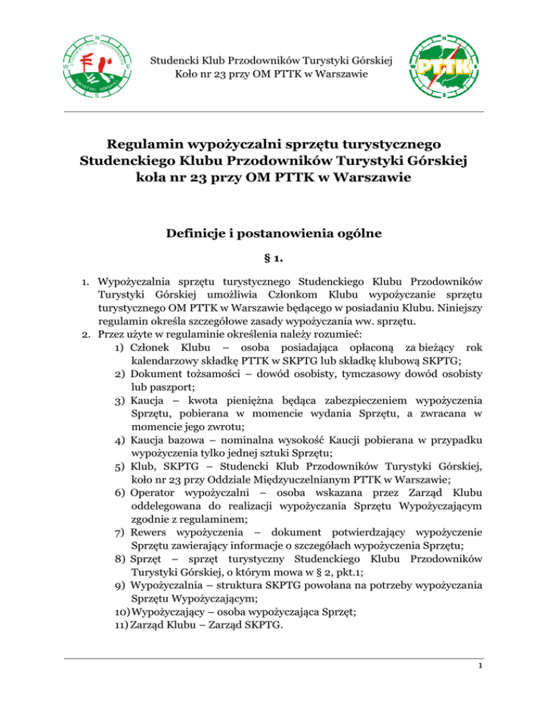 Studencki Klub Przodowników Turystyki Górskiej Koło nr 23 przy OM PTTK w Warszawie Regulamin wypożyczalni sprzętu turystycznego Studenckiego Klubu Przodowników Turystyki Górskiej koła nr 23 przy OM PTTK w Warszawie Definicje i postanowienia ogólne § 1. 1. Wypożyczalnia sprzętu turystycznego Studenckiego Klubu Przodowników Turystyki Górskiej umożliwia Członkom Klubu wypożyczanie sprzętu turystycznego OM PTTK w Warszawie będącego w posiadaniu Klubu. Niniejszy regulamin określa szczegółowe zasady wypożyczania ww. sprzętu. 2. Przez użyte w regulaminie określenia należy rozumieć: 1) Członek Klubu – osoba posiadająca opłaconą za bieżący rok kalendarzowy składkę PTTK w SKPTG lub składkę klubową SKPTG; 2) Dokument tożsamości – dowód osobisty, tymczasowy dowód osobisty lub paszport; 3) Kaucja – kwota pieniężna będąca zabezpieczeniem wypożyczenia Sprzętu, pobierana w momencie wydania Sprzętu, a zwracana w momencie jego zwrotu; 4) Kaucja bazowa – nominalna wysokość Kaucji pobierana w przypadku wypożyczenia tylko jednej sztuki Sprzętu; 5) Klub, SKPTG – Studencki Klub Przodowników Turystyki Górskiej, koło nr 23 przy Oddziale Międzyuczelnianym PTTK w Warszawie; 6) Operator wypożyczalni – osoba wskazana przez Zarząd Klubu oddelegowana do realizacji wypożyczania Sprzętu Wypożyczającym zgodnie z regulaminem; 7) Rewers wypożyczenia – dokument potwierdzający wypożyczenie Sprzętu zawierający informacje o szczegółach wypożyczenia Sprzętu; 8) Sprzęt – sprzęt turystyczny Studenckiego Klubu Przodowników Turystyki Górskiej, o którym mowa w § 2, pkt.1; 9) Wypożyczalnia – struktura SKPTG powołana na potrzeby wypożyczania Sprzętu Wypożyczającym; 10) Wypożyczający – osoba wypożyczająca Sprzęt; 11) Zarząd Klubu – Zarząd SKPTG. 1 Regulamin wypożyczalni sprzętu turystycznego SKPTG § 2. 1. Wypożyczenia sprzętu mogą dokonywać pełnoletni Członkowie Klubu. 2. Dla osób nie będących Członkami Klubu lub będących niepełnoletnimi Członkami Klubu dopuszcza się wypożyczenie sprzętu jedynie po uprzedniej zgodzie Zarządu Klubu, który może określać szczegółowo warunki wypożyczenia. § 3. 1. W wypożyczalni możliwe jest wypożyczenie sprzętu turystycznego według wykazu zawartego w Załączniku 1 do niniejszego regulaminu. 2. Wypożyczający może dokonać wypożyczenia Sprzętu na okres nie dłuższy niż 21 dni. Wypożyczenie sprzętu na okres dłuższy niż ww. wymaga każdorazowo akceptacji Zarządu Klubu. Zasady wypożyczania Sprzętu § 4. 1. Sprzęt jest wypożyczany nieodpłatnie niezależnie od czasu jego wypożyczenia. 2. Wypożyczający chcąc wypożyczyć Sprzęt zgłasza się do Operatora wypożyczalni, działającego w imieniu Zarządu Klubu. § 5. 1. Wypożyczający może dokonać rezerwacji Sprzętu. Rezerwacja może być dokonywana mailowo, telefonicznie lub osobiście u Operatora wypożyczalni. 2. Sprzęt jest rezerwowany do wypożyczenia wg kolejności zgłoszeń, przy czym pierwszeństwo w wypożyczeniu Sprzętu mają Członkowie Klubu. 3. Przy rezerwowaniu Sprzętu Wypożyczający jest zobowiązany zadeklarować datę wypożyczenia i zwrotu Sprzętu. 4. Rezerwacja sprzętu w jakiejkolwiek formie jest jednoznaczna z akceptacją niniejszego regulaminu. § 6. 1. Warunkiem koniecznym wypożyczenia Sprzętu przez Wypożyczającego jest wpłacenie kaucji za całość wypożyczanego Sprzętu. 2. Dla poszczególnych elementów wypożyczanego Sprzętu zostały określone w Załączniku 1 do niniejszego regulaminu Kaucje bazowe. 3. W zależności od liczby sztuk wypożyczanego sprzętu pobierana jest całość lub fragment Kaucji bazowej dla tego Sprzętu. Pobierana kaucja wynosi: 1) 100% Kaucji bazowej – dla najdroższej sztuki Sprzętu spośród podlegających wypożyczeniu lub już wypożyczonych Wypożyczającemu; 2) 50% Kaucji bazowej – dla każdej kolejnej sztuki Sprzętu; 2 Regulamin wypożyczalni sprzętu turystycznego SKPTG 4. Pobierający kaucję Operator wypożyczalni jest zobowiązany do wystawienia Wypożyczającemu dokumentu KP informującego o kwocie pobranej kaucji. 5. Kaucja jest zwracana Wypożyczającemu niezwłocznie po zwróceniu przez niego wypożyczanego sprzętu z zastrzeżeniem § 8, pkt.3. W przypadku częściowego zwrotu wypożyczanego Sprzętu, zwracana jest kwota Kaucji jedynie do wysokości kwoty należnej za Sprzęt pozostający na wypożyczeniu. 6. W momencie dokonania zwrotu kaucji Operator wypożyczalni wystawia dokument KW informujący o kwocie zwracanej kaucji, który Wypożyczający jest zobowiązany podpisać. § 7. 1. Przy wypożyczeniu Sprzętu Wypożyczający jest zobowiązany: 1) okazać Operatorowi wypożyczalni Dokument tożsamości i umożliwić mu spisanie zawartych w nim danych; 2) zadeklarować datę zwrotu sprzętu; 3) wpłacić kaucję za sprzęt; 4) podpisać Rewers wypożyczenia. 2. Przed pobraniem Sprzętu Wypożyczający zobowiązany jest do sprawdzenia stanu technicznego wypożyczanego sprzętu oraz przekazania ewentualnych uwag Operatorowi wypożyczalni. 3. Z momentem podpisania Rewersu wypożyczenia i wydania Sprzętu przez Operatora wypożyczalni Wypożyczający ponosi pełną odpowiedzialność cywilną i materialną za wypożyczony Sprzęt. § 8. 1. Zwrot sprzętu odbywa się w miejscu ustalonym wcześniej przez Wypożyczającego i Operatora wypożyczalni. 2. Sprzęt należy zwrócić w takim stanie, w jakim był w momencie wypożyczenia z uwzględnieniem naturalnego zużycia w okresie wypożyczenia. Sprzęt zwracany do Wypożyczalni powinien być w stanie umożliwiającym natychmiastowe ponowne jego wypożyczenie, a więc czysty i sprawny technicznie. 3. W przypadku zagubienia lub uszkodzenia sprzętu nie wynikającego z normalnej eksploatacji Wypożyczający zobowiązany jest zwrócić jego równowartość w wysokości 100% rynkowej ceny w chwili zgłoszenia bez względu na stopień jego zamortyzowania. Wpłacona pr