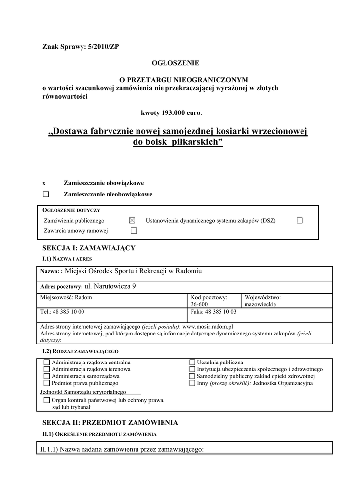 Znak Sprawy: 5/2010/ZP OGŁOSZENIE O PRZETARGU NIEOGRANICZONYM o wartości szacunkowej zamówienia nie przekraczającej wyrażonej w złotych równowartości kwoty 193.000 euro. ,,Dostawa fabrycznie nowej samojezdnej kosiarki wrzecionowej do boisk piłkarskich” Zamieszczanie obowiązkowe x Zamieszczanie nieobowiązkowe OGŁOSZENIE DOTYCZY Zamówienia publicznego Ustanowienia dynamicznego systemu zakupów (DSZ) Zawarcia umowy ramowej SEKCJA I: ZAMAWIAJĄCY I.1) NAZWA I ADRES Nazwa: : Miejski Ośrodek Sportu i Rekreacji w Radomiu Adres pocztowy: ul. Narutowicza 9 Miejscowość: Radom Tel.: 48 385 10 00 Kod pocztowy: 26-600 Faks: 48 385 10 03 Województwo: mazowieckie Adres strony internetowej zamawiającego (jeżeli posiada): www.mosir.radom.pl Adres strony internetowej, pod którym dostępne są informacje dotyczące dynamicznego systemu zakupów (jeżeli dotyczy): I.2) RODZAJ ZAMAWIAJĄCEGO Administracja rządowa centralna Administracja rządowa terenowa Administracja samorządowa Podmiot prawa publicznego Uczelnia publiczna Instytucja ubezpieczenia społecznego i zdrowotnego Samodzielny publiczny zakład opieki zdrowotnej Inny (proszę określić): Jednostka Organizacyjna Jednostki Samorządu terytorialnego Organ kontroli państwowej lub ochrony prawa, sąd lub trybunał SEKCJA II: PRZEDMIOT ZAMÓWIENIA II.1) OKREŚLENIE PRZEDMIOTU ZAMÓWIENIA II.1.1) Nazwa nadana zamówieniu przez zamawiającego: „Dostawa fabrycznie nowej samojezdnej kosiarki wrzecionowej do boisk piłkarskich” II.1.2) Rodzaj zamówienia Roboty budowlane Dostawy Usługi x II.1.3) Określenie przedmiotu oraz wielkości lub zakresu zamówienia Przedmiotem zamówienia jest dostawa - zakup jednej fabrycznie nowej samojezdnej kosiarki wrzecionowej do boisk piłkarskich dla Miejskiego Ośrodka Sportu i Rekreacji w Radomiu. 1. Dane techniczne i wyposażenie: 1) rok produkcji 2010; 2) min. 3-cylindrowy silnik Diesla o mocy min. 17,5 KM i elektrycznym zapłonie 12 V; 3) pojemność silnika min. 700 cm3; 4) pojemność zbiornika paliwa min. 25 l; 5) olej hydrauliczny: biodegradalny, nieszkodliwy dla trawy Greenscare; 6) napęd kół: na trzy koła; 7) tylne koło niezależnie skrętne; 8) napęd jednostek tnących: hydrauliczny 9) prędkość: cięcia – min. 7,8 km/h, prędkość jazdy do przodu – min. 14 km/h, prędkość jazdy tyłem: min 3 km/h; 10) szerokość cięcia: min. 1,83 m; 11) wymiary kosiarki: wysokość: max do 1,4 m, długość: max. 2,5 m; 12) rozstaw kół:max 1,75 m, rozstaw osi: max. do 1,5 m; 13) maks. waga 740 kg; 14) element koszący: wrzeciono; 15) liczba wrzecion: 3; 16) ilość noży na wrzecionie: 7; 17) wys. cięcia: min. 9,0 mm do maks. 70 mm (regulowana); 18) wałek przedni: profilowany o śr. min. 70,2 mm; 19) wałek tylny: gładki o śr. min. 60,5 mm; 20) w standardzie 3 jednakowe kosze na pokos trawy oraz dodatkowo 1 kosz pasujący na każde wrzeciono; 21) wymagany okres gwarancji: minimum 2 lata od daty przekazania - przejęcia samojezdnej kosiarki wrzecionowej do boisk piłkarskich. II.1.4) Czy przewiduje się udzielenie zamówień uzupełniających (dotyczy przetargu nieograniczonego i przetargu ograniczonego) nie II.1.5) WSPÓLNY SŁOWNIK ZAMÓWIEŃ (CPV) Słownik główny Główny przedmiot 29331110-2 II.1.6) Czy dopuszcza się złożenie oferty częściowej (jeżeli dotyczy): nie II.1.7) Czy dopuszcza się złożenie oferty wariantowej (jeżeli dotyczy): nie II.2) CZAS TRWANIA ZAMÓWIENIA LUB TERMIN WYKONANIA2) Okres w miesiącach: •• lub dniach: 7 SEKCJA III: INFORMACJE O CHARAKTERZE PRAWNYM, EKONOMICZNYM, FINANSOWYM I TECHNICZNYM III.1) WADIUM Informacja na temat wadium (jeżeli dotyczy): Zamawiający nie wymaga wniesienia wadium . III. 2) ZALICZKI Czy przewiduje się udzielenie zaliczek na poczet wykonania zamówienia nie III. 3) WARUNKI UDZIAŁU W POSTĘPOWANIU ORAZ OPIS SPOSOBU DOKONYWANIA OCENY SPEŁNIANIA TYCH WARUNKÓW 3) III. 3. 1) Uprawnienia do wykonywania określonej działalności lub czynności, jeżeli przepisy prawa nakładają obowiązek ich posiadania Opis sposobu dokonywania oceny spełniania tego warunku Zamawiający oceni spełnienie tego warunku w oparciu treść oświadczenia o spełnianiu warunków udziału w postępowaniu. Do złożenia oświadczenia można wykorzystać załączony do SIWZ wzór oświadczenia. Ocena spełniania warunku dokonana będzie metodą "zero – jedynkową". Oznacza to, że wystarczającym powodem do wykluczenia wykonawcy może być brak w ofercie wymaganego oświadczenia lub jego nie uzupełnienie, we wskazanym przez Zamawiającego terminie, w trybie art. 26 ust. 3 ustawy Prawo zamówień publicznych III. 3.2) Wiedza i doświadczenie Opis sposobu dokonywania oceny spełniania tego warunku Zamawiający oceni spełnienie tego warunku w oparciu treść oświadczenia o spełnianiu warunków udziału w postępowaniu. Do złożenia oświadczenia można wykorzystać załączony do SIWZ wzór oświadczenia. Ocena spełniania warunku dokonana będzie metodą "zero – jedynkową". Oznacza to, że wystarczającym powodem do wykluczenia wykonawcy może być brak w ofercie wymaganego oświadczenia lub jego nie uzupełnienie, we wskazanym przez Zamawiającego terminie, w trybie art. 26 ust. 3 ustawy Prawo zamówień publicznych III.3.3) Potencjał techniczny oraz osoby zdolne do wykonania zamówienia Opis sposobu dokonywania oceny spełniania tego warunku Zamawiający oceni spełnienie tego warunku w oparciu treść oświadczenia o spełnianiu warunków udziału w postępowaniu. Do złożenia oświadczenia można wykorzystać załączony do SIWZ wzór oświadczenia. Ocena spełniania warunku dokonana będzie metodą "zero – jedynkową". Oznacza to, że wystarczającym powodem do wykluczenia wykonawcy może być brak w ofercie wymaganego oświadczenia lub jego nie uzupełnienie, we wskazanym przez Zamawiającego terminie, w trybie art. 26 ust. 3 ustawy Prawo zamówień publicznych III.3.4) Sytuacja ekonomiczna i finansowa Opis sposobu dok