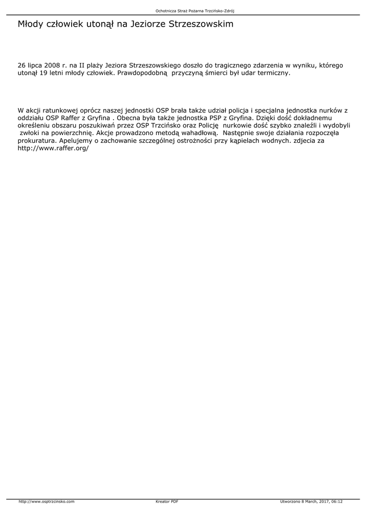 Ochotnicza Straż Pożarna Trzcińsko-Zdrój Młody człowiek utonął na Jeziorze Strzeszowskim 26 lipca 2008 r. na II plaży Jeziora Strzeszowskiego doszło do tragicznego zdarzenia w wyniku, którego utonął 19 letni młody człowiek. Prawdopodobną przyczyną śmierci był udar termiczny. W akcji ratunkowej oprócz naszej jednostki OSP brała także udział policja i specjalna jednostka nurków z oddziału OSP Raffer z Gryfina . Obecna była także jednostka PSP z Gryfina. Dzięki dość dokładnemu określeniu obszaru poszukiwań przez OSP Trzcińsko oraz Policję nurkowie dość szybko znaleźli i wydobyli zwłoki na powierzchnię. Akcje prowadzono metodą wahadłową. Następnie swoje działania rozpoczęła prokuratura. Apelujemy o zachowanie szczególnej ostrożności przy kąpielach wodnych. zdjecia za http://www.raffer.org/ http://www.osptrzcinsko.com Kreator PDF Utworzono 8 March, 2017, 06:12