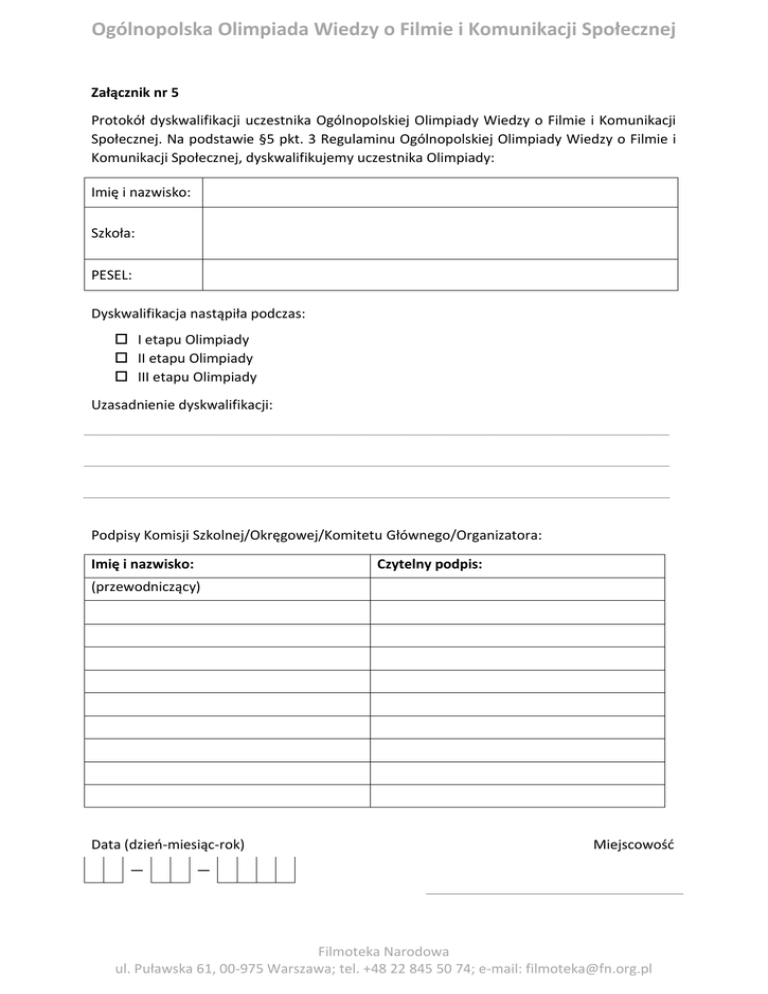 Ogólnopolska Olimpiada Wiedzy o Filmie i Komunikacji Społecznej Załącznik nr 5 Protokół dyskwalifikacji uczestnika Ogólnopolskiej Olimpiady Wiedzy o Filmie i Komunikacji Społecznej. Na podstawie §5 pkt. 3 Regulaminu Ogólnopolskiej Olimpiady Wiedzy o Filmie i Komunikacji Społecznej, dyskwalifikujemy uczestnika Olimpiady: Imię i nazwisko: Szkoła: PESEL: Dyskwalifikacja nastąpiła podczas: I etapu Olimpiady II etapu Olimpiady III etapu Olimpiady Uzasadnienie dyskwalifikacji: Podpisy Komisji Szkolnej/Okręgowej/Komitetu Głównego/Organizatora: Imię i nazwisko: Czytelny podpis: (przewodniczący) Data (dzień-miesiąc-rok) — Miejscowość — Filmoteka Narodowa ul. Puławska 61, 00-975 Warszawa; tel. +48 22 845 50 74; e-mail: [email protected] Ogólnopolska Olimpiada Wiedzy o Filmie i Komunikacji Społecznej Filmoteka Narodowa ul. Puławska 61, 00-975 Warszawa; tel. +48 22 845 50 74; e-mail: [email protected]