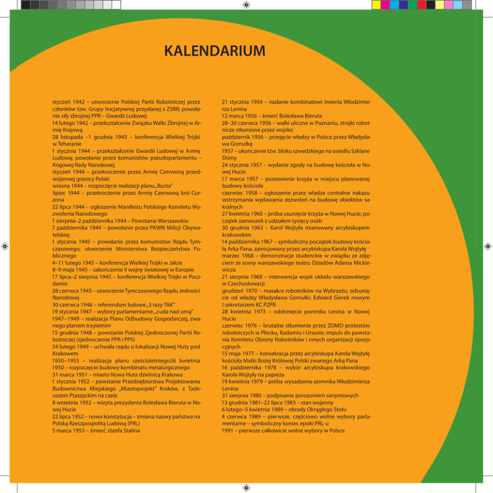 KALENDARIUM styczeń 1942 – utworzenie Polskiej Partii Robotniczej przez członków tzw. Grupy Inicjatywnej przysłanej z ZSRR; powołanie siły zbrojnej PPR – Gwardii Ludowej 14 lutego 1942 – przekształcenie Związku Walki Zbrojnej w Armię Krajową 28 listopada –1 grudnia 1943 – konferencja Wielkiej Trójki w Teheranie 1 stycznia 1944 – przekształcenie Gwardii Ludowej w Armię Ludową; powołanie przez komunistów pseudoparlamentu – Krajowej Rady Narodowej styczeń 1944 – przekroczenie przez Armię Czerwoną przedwojennej granicy Polski wiosna 1944 – rozpoczęcie realizacji planu „Burza” lipiec 1944 – przekroczenie przez Armię Czerwoną linii Curzona 22 lipca 1944 – ogłoszenie Manifestu Polskiego Komitetu Wyzwolenia Narodowego 1 sierpnia–2 października 1944 – Powstanie Warszawskie 7 października 1944 – powołanie przez PKWN Milicji Obywatelskiej 1 stycznia 1945 – powołanie przez komunistów Rządu Tymczasowego; utworzenie Ministerstwa Bezpieczeństwa Publicznego 4–11 lutego 1945 – konferencja Wielkiej Trójki w Jałcie 8–9 maja 1945 – zakończenie II wojny światowej w Europie 17 lipca–2 sierpnia 1945 – konferencja Wielkiej Trójki w Poczdamie 28 czerwca 1945 – utworzenie Tymczasowego Rządu Jedności Narodowej 30 czerwca 1946 – referendum ludowe „3 razy TAK” 19 stycznia 1947 – wybory parlamentarne, „cuda nad urną” 1947−1949 – realizacja Planu Odbudowy Gospodarczej, zwanego planem trzyletnim 15 grudnia 1948 – powstanie Polskiej Zjednoczonej Partii Robotniczej (zjednoczenie PPR i PPS) 24 lutego 1949 – uchwała rządu o lokalizacji Nowej Huty pod Krakowem 1950−1955 – realizacja planu sześcioletniego26 kwietnia 1950 – rozpoczęcie budowy kombinatu metalurgicznego 31 marca 1951 – miasto Nowa Huta dzielnicą Krakowa 1 stycznia 1952 – powstanie Przedsiębiorstwa Projektowania Budownictwa Miejskiego „Miastoprojekt” Kraków, z Tadeuszem Ptaszyckim na czele 8 września 1952 – wizyta prezydenta Bolesława Bieruta w Nowej Hucie 22 lipca 1952 – nowa konstytucja – zmiana nazwy państwa na Polską Rzeczpospolitą Ludową (PRL) 5 marca 1953 – śmierć Józefa Stalina 21 stycznia 1954 – nadanie kombinatowi imienia Włodzimierza Lenina 12 marca 1956 – śmierć Bolesława Bieruta 28–30 czerwca 1956 – walki uliczne w Poznaniu, strajki robotnicze stłumione przez wojsko październik 1956 – przejęcie władzy w Polsce przez Władysława Gomułkę 1957 – ukończenie tzw. bloku szwedzkiego na osiedlu Szklane Domy 24 stycznia 1957 – wydanie zgody na budowę kościoła w Nowej Hucie 17 marca 1957 – postawienie krzyża w miejscu planowanej budowy kościoła czerwiec 1958 – ogłoszenie przez władze centralne nakazu wstrzymania wydawania zezwoleń na budowę obiektów sakralnych 27 kwietnia 1960 – próba usunięcie krzyża w Nowej Hucie; początek zamieszek z udziałem tysięcy osób 30 grudnia 1963 – Karol Wojtyła mianowany arcybiskupem krakowskim 14 października 1967 – symboliczny początek budowy kościoła Arka Pana, zainicjowany przez arcybiskupa Karola Wojtyłę marzec 1968 – demonstracje studenckie w związku ze zdjęciem ze sceny warszawskiego teatru Dziadów Adama Mickiewicza 21 sierpnia 1968 – interwencja wojsk układu warszawskiego w Czechosłowacji grudzień 1970 – masakra robotników na Wybrzeżu; odsunięcie od władzy Władysława Gomułki; Edward Gierek nowym I sekretarzem KC PZPR 28 kwietnia 1973 – odsłonięcie pomnika Lenina w Nowej Hucie czerwiec 1976 – brutalne stłumienie przez ZOMO protestów robotniczych w Płocku, Radomiu i Ursusie; impuls do powstania Komitetu Obrony Robotników i innych organizacji opozycyjnych 15 maja 1977 – konsekracja przez arcybiskupa Karola Wojtyłę kościoła Matki Bożej Królowej Polski zwanego Arką Pana 16 października 1978 – wybór arcybiskupa krakowskiego Karola Wojtyły na papieża 19 kwietnia 1979 – próba wysadzenia pomnika Włodzimierza Lenina 31 sierpnia 1980 – podpisanie porozumień sierpniowych 13 grudnia 1981–22 lipca 1983 – stan wojenny 6 lutego–5 kwietnia 1989 – obrady Okrągłego Stołu 4 czerwca 1989 – pierwsze, częściowo wolne wybory parlamentarne – symboliczny koniec epoki PRL-u 1991 – pierwsze całkowicie wolne wybory w Polsce