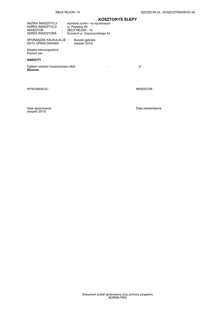 ZBiLK REJON- 15 SZCZECIN UL. GOSZCZYŃSKIEGO 4A KOSZTORYS ŚLEPY NAZWA INWESTYCJI ADRES INWESTYCJI INWESTOR ADRES INWESTORA : : : : wymiana rynien i rur spustowych ul. Pogodna 49 ZBiLK REJON - 15 Szczecin ul. Goszczynskiego 4a SPORZĄDZIŁ KALKULACJE : DATA OPRACOWANIA : Buczek gabriela sierpień 2013r Stawka roboczogodziny : Poziom cen : NARZUTY Ogółem wartość kosztorysowa robót Słownie: : zł WYKONAWCA : INWESTOR : Data opracowania sierpień 2013r Data zatwierdzenia Dokument został opracowany przy pomocy programu NORMA PRO OGÓLNA CHARAKTERYSTYKA OBIEKTU -2- Norma PRO Wersja 4.18a Licencja: 13834 dla ZBiLK Mariacka Pogodna 49 rynny ś Lp. Podstawa 1 KNR 4-01 0504-03 2 KNR 4-01 0533-02 PRZEDMIAR Opis i wyliczenia j.m. PrzełoŜenie pokrycia z układanej pojedynczo na zaprawie dachówki ceramicz- m2 nej karpiówki przel.p okr. 64 m2 przel.p okr. Wymiana pokrycia murów ogniowych, pasów pod-i nadrynnowych, wyskoków i m2 pasów elewacji, gzymsów i krawędzi balkonowych z blachy ocynkowanej 64 m2 3 KNR-W 2-02 Obróbki przy szerokości w rozwinięciu ponad 25 cm - z blachy z cynku 0515-02 9 m2 4 KNR-W 4-01 Wymiana rynien z blachy na rynny półokrągłe o średnicy 150 mm z tworzyw 0544-04 sztucznych z zastosowaniem łączników z zaciskami 129 m 5 KNR-W 2-02 Rynny dachowe półokrągłe o śr. 15 cm - z blachy z cynku 0520-04 18 m 6 KNR-W 2-02 Rury spustowe okrągłe o śr. 12 cm - z blachy z cynku 0527-03 4.5 m 7 KNR-W 4-01 Wymiana zuŜytych rur spustowych z blachy na rury okrągłe z tworzyw sztucz0536-02 nych o średnicy 110 mm - odcinki pionowe 48.5 m 8 KNR-W 4-01 Wymiana zuŜytych rur spustowych z blachy na rury okrągłe z tworzyw sztucz0536-04 nych o średnicy 110 mm - odsadzki 4 szt. m2 m m m m szt. 9 KNR-W 4-01 Wywiezienie gruzu spryzmowanego samochodami skrzyniowymi na odległość m3 0109-09 do 1 km 7 m3 10 KNR-W 4-01 Wywiezienie gruzu spryzmowanego samochodami skrzyniowymi na kaŜdy na- m3 0109-10 stępny 1 km do 21km 147 m3 -3- Norma PRO Wersja 4.18a Licencja: 13834 dla ZBiLK Mariacka Poszcz Razem 64.000 RAZEM 64.000 64.000 RAZEM 64.000 9.000 RAZEM 9.000 129.000 RAZEM 129.000 18.000 RAZEM 18.000 4.500 RAZEM 4.500 48.500 RAZEM 48.500 4.000 RAZEM 4.000 7.000 RAZEM 7.000 147.000 RAZEM 147.000 Pogodna 49 rynny ś Lp. Podstawa Opis jm Norma Nakłady Cena R M S 1 KNR 4-01 PrzełoŜenie pokrycia z układanej pojedynczo na zaprawie dachówki ceramicznej karpiówki 0504-03 obmiar = 64.000m2 przel.pokr. R:robocizna r-g 0.880000 56.3200 M:dachówka ceramiczna szt. 27.500000 1760.0000 M:Wapno hydratyzowane workowane, gat. I t 0.002000 0.1280 M:Piasek natur.do zapr.odm.I,uziar.do 2,0mm m3 0.003000 0.1920 M:Drut stal.okrągły miękki fi 1,0-1,8mm kg 0.030000 1.9200 M:materiały pomocnicze % 2.000000 S:śuraw okienny do 0,50t m-g 0.120000 7.6800 S:Mieszarka do zapraw 3.0m3/h m-g 0.010000 0.6400 2 KNR 4-01 Wymiana pokrycia murów ogniowych, pasów pod-i nadrynnowych, wyskoków i pasów elewacji, gzymsów i krawędzi 0533-02 balkonowych z blachy ocynkowanej obmiar = 64.000m2 R:robocizna r-g 2.300000 147.2000 M:blacha stalowa ocynkowana płaska gr.0.50-0.55 mm kg 5.010000 320.6400 M:spoiwo cynowo-ołowiowe (pręty) kg 0.028000 1.7920 M:gwoździe budowlane okrągłe ocynkowane kg 0.060000 3.8400 M:kwas solny techniczny kg 0.013000 0.8320 M:drut stalowy okrągły miękki (Na) ocynkowany 0.5-0.55 mm kg 0.012000 0.7680 M:materiały pomocnicze % 2.000000 3 KNR-W 2- Obróbki przy szerokości w rozwinięciu ponad 25 cm - z blachy z cynku 02 0515-02 obmiar = 9.000m2 R:robocizna r-g 1.570000 14.1300 M:blacha cynkowo-tytanowa gr 0,55 kg 4.880000 43.9200 M:spoiwo cynowo-ołowiowe LC-60' kg 0.056000 0.5040 M:kołki rozporowe plastikowe szt. 6.700000 60.3000 M:materiały pomocnicze % 1.500000 S:środek transportowy' m-g 0.006800 0.0612 4 KNR-W 4- Wymiana rynien z blachy na rynny półokrągłe o średnicy 150 mm z tworzyw sztucznych z zastosowaniem łączników 01 0544-04 z zaciskami obmiar = 129.000m R:robocizna r-g 0.670000 86.4300 M:rynny z tworzyw sztucznych m 0.990000 127.7100 M:łączniki z zaciskami szt. 0.330000 42.5700 M:uszczelki gumowe szt. 0.660000 85.1400 M:uchwyty do rynien szt. 1.000000 129.0000 M:kształtki róŜne (zaślepki,wylot itp.) szt. 0.330000 42.5700 M:gwoździe budowlane okrągłe ocynkowane kg 0.010000 1.2900 M:materiały pomocnicze % 2.000000 5 KNR-W 2- Rynny dachowe półokrągłe o śr. 15 cm - z blachy z cynku 02 0520-04 obmiar = 18.000m R:robocizna r-g 0.651000 11.7180 M:blacha cynkowo-tytanowa gr 0,55mm kg 1.930000 34.7400 M:spoiwo cynowo-ołowiowe LC-60 kg 0.039000 0.7020 M:uchwyty do rynien dachowych ocynkowane kpl. 2.000000 36.0000 M:materiały pomocnicze % 1.500000 S:środek transportowy m-g 0.003500 0.0630 S:wyciąg m-g 0.001900 0.0342 6 KNR-W 2- Rury spustowe okrągłe o śr. 12 cm - z blachy z cynku 02 0527-03 obmiar = 4.500m R:robocizna r-g 0.835000 3.7575 M:blacha cynkowo-tytanowa gr 0,55mm kg 1.970000 8.8650 M:spoiwo cynowo-ołowiowe LC-60 kg 0.040000 0.1800 M:materiały pomocnicze % 1.500000 S:środek transportowy m-g 0.002700 0.0122 7 KNR-W 4- Wymiana zuŜytych rur spustowych z blachy na rury okrągłe z tworzyw sztucznych o średnicy 110 mm - odcinki pio01 0536-02 nowe obmiar = 48.500m R:robocizna' r-g 0.700000 33.9500 M:rury spustowe z tworzyw sztucznych m 1.000000 48.5000 M:łączniki szt. 0.250000 12.1250 M:kolana szt. 0.250000 12.1250 M:obejmy 0.250000 12.1250 M:materiały pomocnicze % 2.000000 8 KNR-W 4- Wymiana zuŜytych rur spustowych z blachy na rury okrągłe z tworzyw sztucznych o średnicy 110 mm - odsadzki 01 0536-04 obmiar = 4.000szt. M:rury spustowe z tworzyw sztucznych m 1.000000 4.0000 M:łączniki szt. 2.000000 8.0000 M:kolana szt. 2.000000 8.0000 M:materiały pomocnicze % 2.000000 9 KNR-W 4- Wywiezienie gruzu spryzmowanego samochodami skrzyniowymi na odległość do 1 km 01 0109-09 obmiar = 7.000m3 R:robocizna'' r-g 1.390000 9.7300 M:kontener 1.000000 7.0000 S:samochód skrzyniowy do 5 t m-g 0.720000 5.0400 10 KNR-W 4- Wywiezienie gru