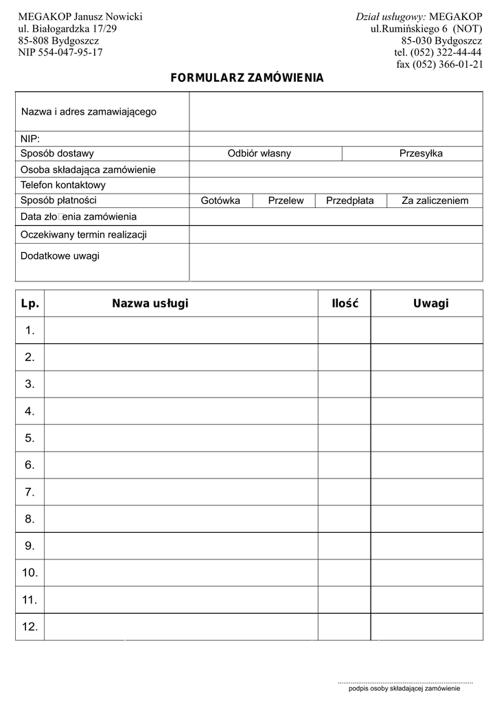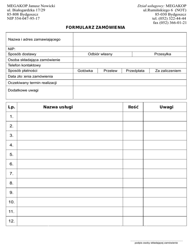 MEGAKOP Janusz Nowicki ul. Białogardzka 17/29 85-808 Bydgoszcz NIP 554-047-95-17 Dział usługowy: MEGAKOP ul.Rumińskiego 6 (NOT) 85-030 Bydgoszcz tel. (052) 322-44-44 fax (052) 366-01-21 FORMULARZ ZAMÓWIENIA Nazwa i adres zamawiającego NIP: Sposób dostawy Odbiór własny Przesyłka Osoba składająca zamówienie Telefon kontaktowy Sposób płatności Gotówka Przelew Przedpłata Za zaliczeniem Data złożenia zamówienia Oczekiwany termin realizacji Dodatkowe uwagi Lp. Nazwa usługi Ilość Uwagi 1. 2. 3. 4. 5. 6. 7. 8. 9. 10. 11. 12. ......................................................................... podpis osoby składającej zamówienie
