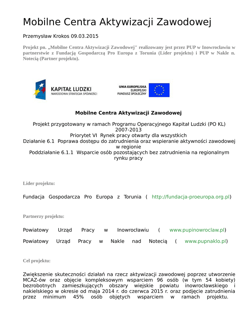 Mobilne Centra Aktywizacji Zawodowej Przemysław Krokos 09.03.2015 Projekt pn. „Mobilne Centra Aktywizacji Zawodowej" realizowany jest przez PUP w Inowrocławiu w partnerstwie z Fundacją Gospodarczą Pro Europa z Torunia (Lider projektu) i PUP w Nakle n. Notecią (Partner projektu). Mobilne Centra Aktywizacji Zawodowej Projekt przygotowany w ramach Programu Operacyjnego Kapitał Ludzki (PO KL) 2007-2013 Priorytet VI Rynek pracy otwarty dla wszystkich Działanie 6.1 Poprawa dostępu do zatrudnienia oraz wspieranie aktywności zawodowej w regionie Poddziałanie 6.1.1 Wsparcie osób pozostających bez zatrudnienia na regionalnym rynku pracy Lider projektu: Fundacja Gospodarcza Pro Europa z Torunia ( http://fundacja-proeuropa.org.pl) Partnerzy projektu: Powiatowy Powiatowy Urząd Urząd Pracy Pracy w w Inowrocławiu Nakle nad ( Notecią www.pupinowroclaw.pl) ( www.pupnaklo.pl) Cel projektu: Zwiększenie skuteczności działań na rzecz aktywizacji zawodowej poprzez utworzenie MCAZ-ów oraz objęcie kompleksowym wsparciem 96 osób (w tym 54 kobiety) bezrobotnych zamieszkujących obszary wiejskie powiatu inowrocławskiego i nakielskiego w okresie od maja 2014 r. do czerwca 2015 r. oraz podjęcie zatrudnienia przez minimum 45% osób objętych wsparciem w ramach projektu. Okres realizacji projektu: 01.05.2014 - 30.06.2015 Do kogo adresowany jest projekt: Projekt skierowany jest wyłącznie do osób posiadających status osoby bezrobotnej i zamieszkujących obszary wiejskie. W projekcie uczestniczyć będą mogli mieszkańcy wybranych gmin z powiatu inowrocławskiego i nakielskiego. Z powiatu inowrocławskiego do uczestnictwa w projekcie uprawnionych będzie 48 osób (w tym 27 kobiet) zamieszkujących w następujących gminach: Janikowo, Kruszwica i Inowrocław. Ponadto w projekcie będą mogły wziąć udział osoby, które w ciągu ostatnich 12 miesięcy nie korzystały ze wsparcia w postaci usług i instrumentów aktywizacyjnych oferowanych przez PUP (szkolenia, warsztaty, kursy, staże, zatrudnienie subsydiowane, roboty publiczne i prace interwencyjne). Podkreślić należy, że w procesie rekrutacji uczestników projektu analizowane będą poniżej przytoczone czynniki, zgodnie z którymi przyznawane będą punkty, mające wpływ na decyzję o przyjęciu do projektu: • • • • • • pobieranie zasiłku z OPS, korzystanie z innych źródeł pomocy finansowej, pozostawanie bez pracy powyżej 1 roku, wiek poniżej 25 lat, poziom wykształcenia, brak kwalifikacji zawodowych. W projekcie weźmie udział co najmniej 18 osób długotrwale bezrobotnych. Planowane działania i wsparcie: Specyfika projektu zakłada dotarcie z wybranymi formami wsparcia oferowanymi przez PUP możliwie najbliżej do miejsca zamieszkania uczestników projektu. W związku z tym w projekcie zaplanowano m.in. następujące zadania i formy wsparcia: • Zbudowanie partnerstw lokalnych i utworzenie Rad Społecznych, • Utworzenie Lokalnych Centrów w ramach Mobilnych Centrów Aktywizacji Zawodowej. W powiecie inowrocławskim utworzone zostaną 4 Lokalne Centra (gmina Janikowo – miejscowość: Broniewice, gmina Kruszwica – miejscowość: Polanowice, gmina Inowrocław – miejscowości: Łojewo i Orłowo), • Sesje z psychologiem, • Poradnictwo zawodowe – utworzenie Indywidualnych Planów Działania i • • • • • • Grupowych Planów Działania, Warsztaty Aktywnego Poszukiwania Pracy, Animacja Lokalna, Kurs obsługi komputera, Szkolenia zawodowe dostosowane do potrzeb szkoleniowych uczestników projektów, wynikające z ich predyspozycji oraz potrzeb lokalnego rynku pracy (stypendium szkoleniowe), Staże zawodowe (6 miesięcy, stypendium stażowe 1680 zł brutto), Pośrednictwo pracy. Uczestnikom projektu przysługiwać będą stypendia szkoleniowe i stażowe, zwrot kosztów dojazdu, zwrot kosztów opieki nad dziećmi i osobami zależnymi. Uczestnicy otrzymają również pełen pakiet szkoleniowy (materiały i podręczniki), poczęstunek (kawa, herbata, ciastka) podczas szkoleń i ciepły obiad podczas kursu zawodowego. Jak zostać uczestnikiem projektu? Osoby zainteresowane uczestnictwem w projekcie zapraszamy do osobistego kontaktu w siedzibie PUP w Inowrocławiu ( pok. 319) lub do kontaktu telefonicznego pod następującymi numerami telefonu: 52 359 24 42 lub 52 359 24 49. Nabór formularzy zgłoszeniowych potrwa do 30 czerwca 2014 r. Wypełnione dokumenty należy pozostawić w Kancelarii PUP w Inowrocławiu (p. 204, II piętro). Dokumenty można również przesłać pocztą - decyduje data wpływu do siedziby urzędu. Dokumentacja projektu, w tym formularz zgłoszeniowy dostępna jest tutaj. W RAMACH PROJEKTU UTWORZONE ZOSTANĄ LOKALNE CENTRA: Lokalne Centrum w Orłowie - opiekun Maria Stępniowska Lokalne Centrum w Łojewie - opiekun Maria Stępniowska Lokalne Centrum w Lokalne Centrum w Broniewicach Polanowicach - opiekun opiekun Marzena Gorzkowska Paulina Szymańska BIURO PROJEKTU: Fundacja Gospodarcza ul. Warszawska 4/7, tel.: 533 42 45 48 http://fundacja-proeuropa.org.pl lub Pro 87-100 56 Europa Toruń, 650 59 09 Projekt współfinansowany ze środków Unii Europejskiej w ramach Europejskiego Funduszu Społecznego