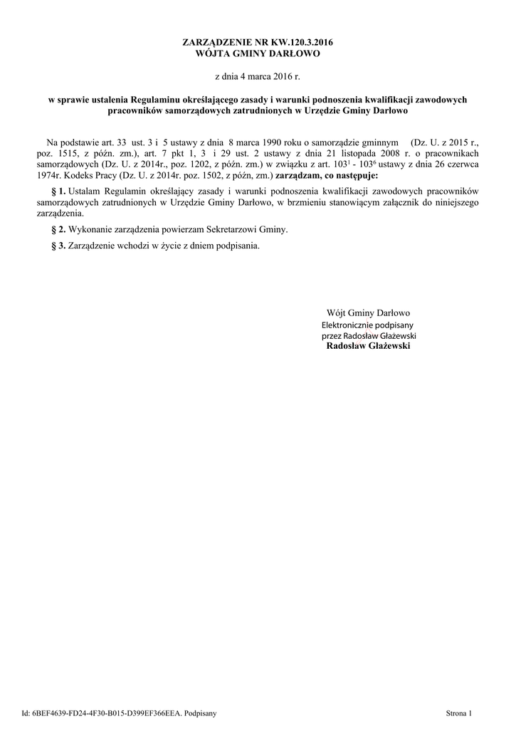 ZARZĄDZENIE NR KW.120.3.2016 WÓJTA GMINY DARŁOWO z dnia 4 marca 2016 r. w sprawie ustalenia Regulaminu określającego zasady i warunki podnoszenia kwalifikacji zawodowych pracowników samorządowych zatrudnionych w Urzędzie Gminy Darłowo Na podstawie art. 33 ust. 3 i 5 ustawy z dnia 8 marca 1990 roku o samorządzie gminnym (Dz. U. z 2015 r., poz. 1515, z późn. zm.), art. 7 pkt 1, 3 i 29 ust. 2 ustawy z dnia 21 listopada 2008 r. o pracownikach samorządowych (Dz. U. z 2014r., poz. 1202, z późn. zm.) w związku z art. 1031 - 1036 ustawy z dnia 26 czerwca 1974r. Kodeks Pracy (Dz. U. z 2014r. poz. 1502, z późn, zm.) zarządzam, co następuje: § 1. Ustalam Regulamin określający zasady i warunki podnoszenia kwalifikacji zawodowych pracowników samorządowych zatrudnionych w Urzędzie Gminy Darłowo, w brzmieniu stanowiącym załącznik do niniejszego zarządzenia. § 2. Wykonanie zarządzenia powierzam Sekretarzowi Gminy. § 3. Zarządzenie wchodzi w życie z dniem podpisania. Wójt Gminy Darłowo Elektronicznie podpisany przez Radosław Głażewski Radosław Głażewski Id: 6BEF4639-FD24-4F30-B015-D399EF366EEA. Podpisany Strona 1
