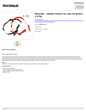 Fireshop.pl ul. Traugutta 9A 49-200 Grodków tel: 888 444 998 fax: 77 415 37 11 Wieszak - opaska taśma na rzep do gaśnic 1-6 kg link do produktu: http://fireshop.pl/wieszaki-uchwyty-do-gasnic/Wieszak-tasma-opaska-do-gasnic.html?product_re write=Wieszak-tasma-opaska-do-gasnic Cena: 3,50 zł netto 3,50 zł za szt. Nr referencyjny: 041078 Stan: Nowy Pełny opis produktu Taśma -opaska mocująca gaśnicę Przeznaczona do mocowania gaśnicy do wieszaka. Pasuje do każdej gaśnicy i każdego wieszaka. wystarczy wsunąć opaskę pod wieszak pomiędzy otworami montażowymi, podczas jego przykręcania do ściany. Opaska zostanie dociśnięta wieszakiem do ściany. Zapinanie opaski na rzep w sposóp zapewniający bardzo mocne trzymanie gaśnicy i jednocześnie szybkie intuicyjne odpięcie. Jednym ruchem ręki odpinamy opaskę poprzez pociąnięcie wystającego końca taśmy. Opska gaśnicy posiada regulację naciągu taśmy odpowiednio do średnicy zbiornika gaśnicy. Zastosowano taśmę odporną na warunki atmosferyczne (nierozciągliwa). Opcja: - możliwość zamówienia wieszaka w komplecie z opaską (przy zammówieniu prosze podac typ gaśnicy) Dane techniczne: - kolor: czerwony lub czarny - opaska z solidnej taśmy polipropylenowej - regulacja zapięcia do gaśnic dowolnej średnicy - zapinka na rzep 8-03-2017 1/1
