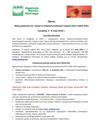 Oferta Misja gospodarcza i udział w międzynarodowych targach SIAL CHINA 2016 Szanghaj, 3 - 8 maja 2016 r. Targi SIAL China 2016 SIAL China w Szanghaju to jedna z największych imprez targowo-wystawienniczych prezentujących żywność i napoje w Azji. Targi te oferują przedsiębiorcom, zarówno chińskim, jak i międzynarodowym, możliwość zwiększenia swojej obecności i rozpoznawalności firmy na rynku chińskim oraz azjatyckim. Najbliższa, 17 edycja targów SIAL China 2016, odbędzie się w dniach 5-7 maja 2016 r. w Szanghaju. Organizatorzy przewidują w 2016 roku obecność ok. 2 900 wystawców i 66 000 zwiedzających z całego świata. W 11 halach wystawienniczych prezentowane będą produkty z 21 kategorii. Szczegółowe informacje na temat targów znajdują się na stronie internetowej: www.sialchina.com Działania promocyjne podczas SIAL CHINA 2016 Agencja Rynku Rolnego w trakcie misji gospodarczej towarzyszącej SIAL CHINA 2016 organizuje : stoisko narodowe o powierzchni 248 m2 w Pawilonie W4 z możliwością indywidualnego udziału firm, rozmowy biznesowe B2B z chińskimi kontrahentami, „store-check” - wizyty w co najmniej dwóch punktach handlowych , spotkanie informacyjno-szkoleniowe dotyczące uwarunkowań prowadzenia biznesu w Chinach. Tegoroczne targi mają szczególny charakter, ponieważ Polska jest krajem partnerskim SIAL China 2016. Dzięki specjalnemu pakietowi „POLAND – Guest Country of Honor”, Polska ekspozycja będzie znacząco wyróżniać się na tle innych wystawców, między innymi dzięki: dwugodzinny pokaz kulinarny „ La Cuisine by SIAL – Culinary Demonstration”; zwiększona widoczność Polski na terenie targów (reklamy i bannery przed wejściem na targi oraz na terenie hali); reklama w katalogu targowym; reklama na oficjalnej stronie targów www. sialchina.com możliwość zaprojektowania na to wydarzenie specjalnych materiałów promocyjnoreklamowych (torby, smycze, płyty CD); odwiedzeniem polskiego pawilonu przez gości VIP; możliwość udziału w konkursie „Best Buy Competition” i wiele innych; Wystąpienie targowe Indywidualne wystąpienie firmy w ramach stoiska narodowego jest możliwe pod warunkiem zakupu co najmniej 9 m2 powierzchni wystawienniczej wraz z zabudową. Stoisko wyposażone będzie w ladę informacyjną, hoker, stojak na ulotki, witrynę i stolik z krzesłami i podręczny magazynek. Istnieje możliwość wynajmu większej powierzchni wystawienniczej oraz zamówienia dodatkowego wyposażenia (lada chłodnicza, witryna itd.) – koszt według wyceny indywidualnej. W ramach oferty ARR, Przedsiębiorca bezpłatnie korzysta z: 1) ogólnej części stoiska ARR z podręcznym magazynkiem oraz serwisu kawowego dla przedsiębiorców i ich kontrahentów, 2) spedycji na targi do 15 kg materiałów informacyjnych i promocyjnych oraz próbek produktów nie wymagających specjalnych warunków przewozu zorganizowanej przez ARR (wysyłane będą tylko produkty, które mogą pomyślnie przejść odprawę celną; transport powrotny nie jest przewidziany), 3) udziału w spotkaniach B2B z chińskimi firmami zainteresowanymi nawiązaniem współpracy handlowej, 4) wizyty w miejscowych sieciach handlowych - „store-check”, 5) spotkania informacyjno-szkoleniowego na temat rynku chińskiego, 6) reklamy w prasie lokalnej (zaproszenie, w formie ogłoszenia, do zapoznania się z ofertą handlową poszczególnych branż reprezentowanych na stoisku narodowym), 7) możliwości obsługi tłumaczeniowej w jęz. chińskim podczas misji (stoisko informacyjnopromocyjne, wspólne spotkania B2B), 8) transportu lokalnego na miejscu dla uczestników, którzy zdecydują się na hotel i połączenie lotnicze wskazane przez ARR, 9) pomocy w rezerwacji: hotelu o standardzie minimum trzygwiazdkowym oraz biletu lotniczego, wskazanego przez ARR. Szacunkowe koszty udziału w targach wynajem indywidualnej powierzchni wystawienniczej wraz z zabudową w ramach stoiska narodowego (dostęp do mediów - elektryczność, zapewnienie wejściówek, zapewnienie czystości stoiska, zaprojektowanie i wykonanie zabudowy zharmonizowanej ze stoiskiem wspólnym, wykonanie demontażu stoiska, wyposażenie, dekoracja materiałami promocyjnymi Przedsiębiorcy, ubezpieczenie stoiska) wraz obowiązkową opłatą rejestracyjną i wpisem do katalogu: Łączne szacunkowe koszty wynajmu i zabudowy stoiska: 9 m2 – 27 000,00 PLN netto (33 210,00 PLN brutto) Podane koszty mogą różnić się +/- 10% Kalkulacja kosztów została sporządzona dla kursu 1 EUR = 4,50 PLN Dodatkowe usługi: zwiększenie powierzchni stoiska: koszt wynajmu powierzchni wystawienniczej wraz z zabudową: ok. 2 626,00 PLN netto (3 229,98 PLN brutto) za 1m2 ; 2 zamówienie dodatkowych elementów wyposażenia stoiska do wyłącznego użytku Przedsiębiorcy (np. dodatkowa witryna, telewizor), według wyceny indywidualnej; zamówienie dodatkowego transportu i spedycji ponad 15 kg materiałów promocyjnych i informacyjnych oraz próbek produktów - według wyceny indywidualnej, a rozliczenie kosztów zamówienia nastąpi bezpośrednio z firmą spedycyjną, z którą współpracuje ARR. Szacunkowe koszty podróży i pobytu dla 1 osoby: koszt biletu lotniczego: wylot z Warszawy: 03.05.2016 – powrót: 08.05.2016 - ok. 3 700 PLN/os, (cena biletu może się różnić w zależności od linii lotniczej i terminu rezerwacji oraz wykupu biletu), Koszt wizy wjazdowej: 280 PLN od osoby, koszt noclegu wraz ze śniadaniem: do 170 EURO, tj. ok. 3 825 PLN za 5 noclegów. Ubezpieczenie na czas podróży – ok. 10 zł/dzień x 6 dni, tj. ok. 60 PLN. UWAGA: Agencja Rynku Rolnego nie pośredniczy w załatwianiu wiz oraz ubezpieczenia Orientacyjne łączne koszty podróży i zakwaterowania ok. 7 865 PLN Zasady naboru: Nabór ma charakter ciągły od dnia ogłoszenia do dnia 15 marca 2016 r. Przedsiębiorcy zainteresowani udziałem w wydarzeniu organizowanym przez ARR muszą w powyższym terminie przesłać do ARR skan prawidło
