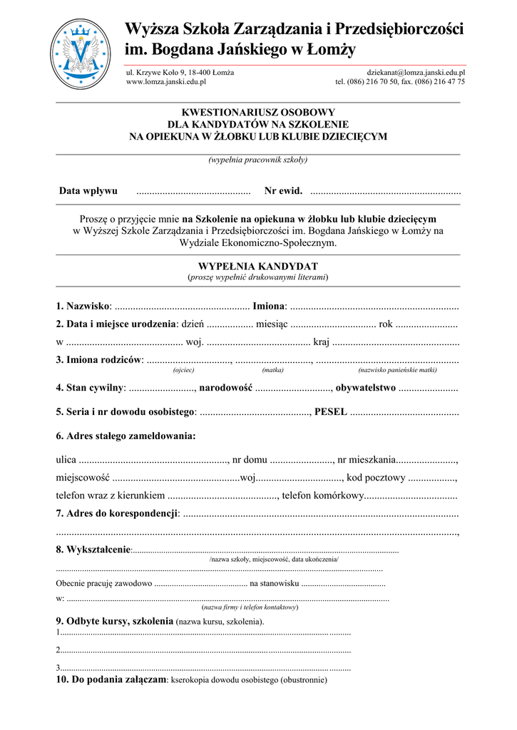 Wyższa Szkoła Zarządzania i Przedsiębiorczości im. Bogdana Jańskiego w Łomży ul. Krzywe Koło 9, 18-400 Łomża www.lomza.janski.edu.pl [email protected] tel. (086) 216 70 50, fax. (086) 216 47 75 KWESTIONARIUSZ OSOBOWY DLA KANDYDATÓW NA SZKOLENIE NA OPIEKUNA W ŻŁOBKU LUB KLUBIE DZIECIĘCYM (wypełnia pracownik szkoły) Data wpływu ............................................ Nr ewid. .......................................................... Proszę o przyjęcie mnie na Szkolenie na opiekuna w żłobku lub klubie dziecięcym w Wyższej Szkole Zarządzania i Przedsiębiorczości im. Bogdana Jańskiego w Łomży na Wydziale Ekonomiczno-Społecznym. WYPEŁNIA KANDYDAT (proszę wypełnić drukowanymi literami) 1. Nazwisko: .................................................... Imiona: ................................................................. 2. Data i miejsce urodzenia: dzień .................. miesiąc ................................. rok ........................ w ............................................. woj. ........................................ kraj ................................................. 3. Imiona rodziców: ................................, ............................., ....................................................... (ojciec) (matka) (nazwisko panieńskie matki) 4. Stan cywilny: ........................., narodowość ............................., obywatelstwo ....................... 5. Seria i nr dowodu osobistego: .........................................., PESEL .......................................... 6. Adres stałego zameldowania: ulica ........................................................., nr domu ........................, nr mieszkania......................., miejscowość .................................................woj................................., kod pocztowy .................., telefon wraz z kierunkiem .........................................., telefon komórkowy.................................... 7. Adres do korespondencji: .......................................................................................................... .........................................................................................................................................................., 8. Wykształcenie:........................................................................................................................... /nazwa szkoły, miejscowość, data ukończenia/ ....................................................................................................................................................... Obecnie pracuję zawodowo ........................................... na stanowisku ....................................... w: ..................................................................................................................................................... (nazwa firmy i telefon kontaktowy) 9. Odbyte kursy, szkolenia (nazwa kursu, szkolenia). 1............................................................................................................................ .......... 2...................................................................................................................................... 3............................................................................................................................ .......... 10. Do podania załączam: kserokopia dowodu osobistego (obustronnie) Oświadczam, że dane zawarte w zgłoszeniu są zgodne z prawdą. Płatności za uczestnictwo w kursie należy dokonać przelewem na rachunek bankowy: Bank Pekao S.A. 93 1020 1332 0000 1102 0618 6102 z dopiskiem Szkolenie na opiekuna w żłobku w kwocie: Wpisowe 75 zł Płatność jednorazowa wynosi 1450 zł lub płatność w ratach: I rata 750 zł II rata 700 zł Faktury wystawiane będą na podstawie przesłanych kart zgłoszeniowych i wysyłane pocztą. Oświadczamy, że jesteśmy płatnikami podatku VAT i upoważniamy Wyższą Szkołę Zarządzania i Przedsiębiorczości im. Bogdana Jańskiego w Łomży do wystawienia faktury VAT bez naszego podpisu. Proszę o wystawienie faktury za kurs: Imię nazwisko / Nazwa firmy.......................................................................................................... ......................................................................................................................................................... Adres ....................................................................................................................... ........................ NIP ................................................................................................ Wyrażam zgodę na wystawienie faktury bez podpisu. Wyrażam zgodę na przetwarzanie przez Wyższą Szkołę Zarządzania i Przedsiębiorczości im. Bogdana Jańskiego w Łomży moich danych osobowych zawartych w karcie zgłoszenia (zgodnie z ustawą z dnia 29.08.1997r. o ochronie danych osobowych, Dz. U. nr 133, pozycja 883). Łomża, dnia ............................................. ........ ................................................. (czytelny podpis kandydata) ADNOTACJA UCZELNI Przyjęto/ nie przyjęto na Szkolenie na opiekuna w żłobku lub klubie dziecięcym Data ............................................................ ........... ..................................... (podpis Dziekana) Wydano zaświadczenie o ukończeniu Szkolenia na opiekuna w żłobku lub klubie dziecięcym Nr ............................ dnia ........................................... .................... ........................ (podpis Dziekana) * niewłaściwe skreślić WYPEŁNIA ZAKŁAD PRACY Kieruję Pana/Panią ........................................................................................................ Na w/w kurs i wyrażam zgodę/nie wyrażam zgody* na oddelegowanie na czas trwania kursu oraz wyrażam zgodę/nie wyrażam zgody* na partycy