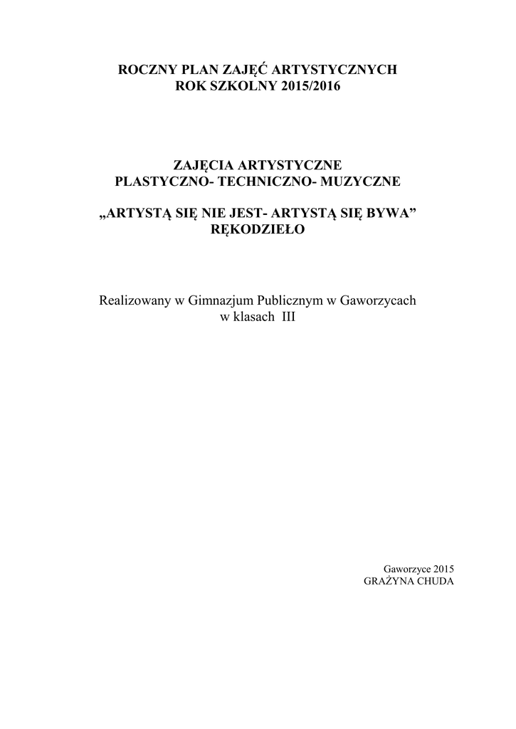 ROCZNY PLAN ZAJĘĆ ARTYSTYCZNYCH ROK SZKOLNY 2015/2016 ZAJĘCIA ARTYSTYCZNE PLASTYCZNO- TECHNICZNO- MUZYCZNE „ARTYSTĄ SIĘ NIE JEST- ARTYSTĄ SIĘ BYWA” RĘKODZIEŁO Realizowany w Gimnazjum Publicznym w Gaworzycach w klasach III Gaworzyce 2015 GRAŻYNA CHUDA WSTĘP Uczniowie posiadają już spory zasób wiedzy na tematy artystyczne. Potrafią dyskutować, komunikować się, dokonywać wyborów i współpracować w grupie. Potrafią gromadzić potrzebne materiały do tworzenia kompozycji plastyczno-muzycznych. Są otwarci na różne propozycje i pomysły płynące ze strony nauczycieli oraz innych uczniów. Pobudzenie wyobraźni twórczej przez zaangażowanie w działaniach plastycznomuzycznych wpływa pozytywnie na sferę emocjonalną i intelektualna ucznia. CHARAKTERYSTYKA ZAJĘĆ ORAZ SPOSOBU ICH REALIZACJI METODY PRACY: Podczas zajęć artystycznych należy zmierzać do wykorzystywania potencjału twórczego uczni, opierając się na założeniach innowacyjnych metod, stymulujących aktywność twórczą np. trening twórczego myślenia, metoda projektu, prace ręczne. Metody pracy będą dostosowane do treści zajęć i będą sprzyjały rozwijaniu umiejętności pracy w grupie, wyrażaniu własnego zdania, a także na kształtowaniu postawy otwartości na poglądy innych osób. Metody te umożliwiają prawidłowe rozwijanie twórczej strefy poznawczej i emocjonalnej osobowości. Zaplanowane działania obejmują różne rodzaje określonych zadań plastycznych, technicznych i muzycznych, w trakcie których uczeń wykorzystuje posiadaną wiedzę z zakresu plastyki, techniki, muzyki, a także innych przedmiotów, jak również własne doświadczenie z życia codziennego. Podczas zajęć uczniowie będą wykonywać dodatkowo zadania na rzecz szkoły, środowiska poprzez uczestnictwo w konkursach plastycznych, muzycznych, wystawach, ekspozycjach, w przygotowaniach przedstawień teatralnych i w przygotowaniach uroczystości szkolnych. CELE I ZAŁOŻENIA: - wychowanie przez sztukę, - rozwijanie wśród dzieci i młodzieży wrażliwości estetycznej na sztukę (plastyka, muzyka, teatr); - poznanie warsztatu oraz teorii z zakresu wyżej wymieniony7ch dziedzin sztuki, a także wiedzy na temat dziennikarstwa i fotografii; - pobudzanie aktywności twórczej oraz dziecięcej wyobraźni; - inspiracja do aktywności artystycznej i kulturalnej; - łączenie pasji z radością tworzenia; - promocja oraz konfrontacja twórczości artystycznej wychowanków poprzez uczestnictwo w licznych konkursach, wystawach i ekspozycjach. TEMATYKA ZAJĘĆ ARTYSTYCZNYCH: Tematyka jest oparta na programowych założeniach z przedmiotu- zajęć artystycznych w gimnazjum. Związana jest z zagadnieniami plastyczno- techniczno- muzycznymi, aby uatrakcyjnić zajęcia i dać możliwość swobodnej ale konkretnej i planowanej twórczości artystycznej. Tematy będą nawiązywały do otaczającej nas przyrody, stając się wielką inspiracją do twórczości artystycznej uczniów. TERMIN REALIZACJI: Realizacja od września 2014r. do czerwca 2015r. Spotkania odbywać się będą 1 godzinę w tygodniu. RAMOWY ROZKŁAD ZAJĘĆ: WRZESIEŃ: 1. Lekcja organizacyjna. Zapoznanie do zajęć artystycznych, zapoznanie z programem zajęć i przedmiotowym systemem oceniania. 2. Koszyczek z mydła. 3. Dekoracja jesienna- kwiaty z liści klonu. PAŹDZIERNIK: 1. Papierowa wiklina. 2. Koszyczek ŁÓDKA z papierowej wikliny. LISTOPAD: 1. Kubek z butelki PET. 2. Kwiaty z patyczków higienicznych. GRUDZIEŃ: 1. Anioły z kory brzozy. 2. Drzewko szczęścia z szyszek. STYCZEŃ: 1. Dla babci i dziadka- Bukiet z cukierków. 2. Obrazek – patyczki do lodów. LUTY: 1. Decoupage krok po kroku- zapoznanie z techniką. 2. Podkładka pod filiżankę- decoupage. MARZEC: 1. Koszyk pełen pisanek- papierowa wiklina. 2. Palma wielkanocna- papieroplastyka. KWIECIEŃ: 1. Róża- statuetka z plastikowej butelki. 2. Pudełko na drobiazgi- decoupage. MAJ: 1. Poloneza czas zacząć- kroki i figury poloneza. 2. Walc wiedeński- kroki i figury walca. CZERWIEC: 1. Doskonalenie poznanych tańców. 2. Księga pamiątkowa- „Ale to już było…” METODY EWALUACJI: Metody ewaluacji zajęć są różnorodne, tak samo, jak różnorodne są sposoby ich prowadzenia. Może wystąpić ocena wytworów plastycznych, muzycznych, technicznych przez opiekuna i odbiorców sztuki. Przygotowane wytwory stworzą ciekawą wystawę podsumowującą dorobek twórczy uczniów za rok szkolny 2014/2015. Dopuszczana jest ocena przebiegu zajęć, atmosfery na zajęciach, samoocena- ankieta. Ewaluacja bierze pod uwagę stopień zadowolenia uczniów z wytworów własnych i innych, uczestniczenie w plenerach, konkursach, wycieczce. OCZEKIWANE OSIĄGNIĘCIA UCZNIÓW: UCZEŃ: 1. Stosuje różne narzędzia i techniki do pracy twórczej. 2. Sprawnie radzi sobie z różnymi formami pracy. 3. Współpracuje w grupie. 4. Przygotowuje ekspozycję przestrzenną. 5. Dzieli się wiedzą i doświadczeniami. 6. Wyraża swoje pragnienia, fantazje, umiejętności w sposób twórczy. 7. Chętnie przedstawia wszystkim swoje zainteresowania artystyczne. 8. Rozumie rolę sztuki w życiu szkoły i środowiska lokalnego. 9. Wykorzystuje wyobraźnię i przekazuje swoje uczucia w twórczości. 10. Aktywnie uczestniczy w życiu szkoły i środowiska lokalnego. 11. Bierze udział w wystawach, konkursach i wycieczkach.
