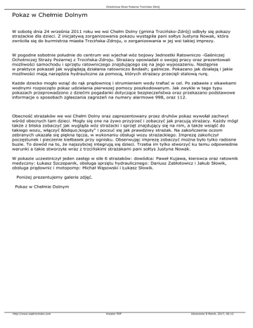Ochotnicza Straż Pożarna Trzcińsko-Zdrój Pokaz w Chełmie Dolnym W sobotę dnia 24 września 2011 roku we wsi Chełm Dolny (gmina Trzcińsko-Zdrój) odbyły się pokazy strażackie dla dzieci. Z inicjatywą zorganizowania pokazu wystąpiła pani sołtys Justyna Nowak, która zwróciła się do burmistrza miasta Trzcińska-Zdroju, o zorganizowania w jej wsi takiej imprezy. W pogodne sobotnie południe do centrum wsi wjechał wóz bojowy Jednostki Ratowniczo -Gaśniczej Ochotniczej Straży Pożarnej z Trzcińska-Zdroju. Strażacy opowiadali o swojej pracy oraz prezentowali możliwości samochodu i sprzętu ratowniczego znajdującego się na jego wyposażeniu. Następnie w praktyce pokazali jak wyglądają działania ratowniczo – gaśnicze. Pokazano jak działają i jakie możliwości mają narzędzia hydrauliczne za pomocą, których strażacy przecięli stalową rurę. Każde dziecko mogło wziąć do rąk prądownicę i strumieniem wody trafiać w cel. Po zabawie z sikawkami wodnymi rozpoczęto pokaz udzielania pierwszej pomocy poszkodowanym. Jak zwykle w tego typu pokazach przeprowadzono z dziećmi pogadanki dotyczące bezpieczeństwa oraz przekazano podstawowe informacje o sposobach zgłaszania zagrożeń na numery alarmowe 998, oraz 112. Obecność strażaków we wsi Chełm Dolny oraz zaprezentowany przez druhów pokaz wywołał zachwyt wśród obecnych tam dzieci. Mogły się one na żywo przyjrzeć i zobaczyć jak pracują strażacy. Każdy mógł także z bliska zobaczyć jak wygląda wóz strażacki i sprzęt znajdujący się na nim, a także wsiąść do takiego wozu, włączyć „koguty" i poczuć się jak prawdziwy strażak. Na zakończenie oczom zebranych ukazała się piękna tęcza, w wykonaniu obsługi wozu strażackiego. Imprezę zakończył poczęstunek i pieczenie kiełbasek przy ognisku. Obserwując imprezę zobaczyć można było tylko radosne buzie. To dowód na to, że najszybciej integrują się dzieci. Trzeba im tylko stworzyć ku temu odpowiednie warunki a takie stworzyła wraz z trzcińskimi strażakami pani sołtys Justyna Nowak. W pokazie uczestniczył jeden zastęp w sile 6 strażaków: dowódca: Paweł Kujawa, kierowca oraz ratownik medyczny: Łukasz Szczepanik, obsługa sprzętu hydraulicznego: Dariusz Zabłotowicz i Jakub Słowik, obsługa prądownic i motopomp: Michał Wąsowski i Łukasz Słowik. Poniżej prezentujemy galerie zdjęć. Pokaz w Chełmie Dolnym http://www.osptrzcinsko.com Kreator PDF Utworzono 8 March, 2017, 06:12