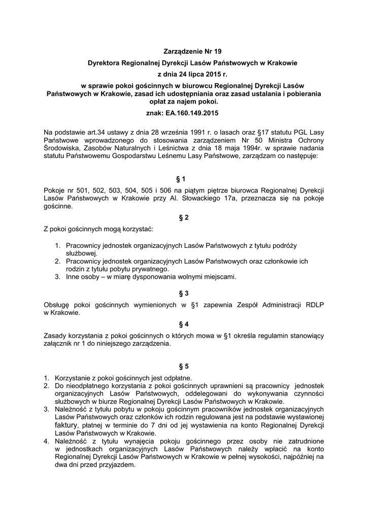 Zarządzenie Nr 19 Dyrektora Regionalnej Dyrekcji Lasów Państwowych w Krakowie z dnia 24 lipca 2015 r. w sprawie pokoi gościnnych w biurowcu Regionalnej Dyrekcji Lasów Państwowych w Krakowie, zasad ich udostępniania oraz zasad ustalania i pobierania opłat za najem pokoi. znak: EA.160.149.2015 Na podstawie art.34 ustawy z dnia 28 września 1991 r. o lasach oraz §17 statutu PGL Lasy Państwowe wprowadzonego do stosowania zarządzeniem Nr 50 Ministra Ochrony Środowiska, Zasobów Naturalnych i Leśnictwa z dnia 18 maja 1994r. w sprawie nadania statutu Państwowemu Gospodarstwu Leśnemu Lasy Państwowe, zarządzam co następuje: §1 Pokoje nr 501, 502, 503, 504, 505 i 506 na piątym piętrze biurowca Regionalnej Dyrekcji Lasów Państwowych w Krakowie przy Al. Słowackiego 17a, przeznacza się na pokoje gościnne. §2 Z pokoi gościnnych mogą korzystać: 1. Pracownicy jednostek organizacyjnych Lasów Państwowych z tytułu podróży służbowej. 2. Pracownicy jednostek organizacyjnych Lasów Państwowych oraz członkowie ich rodzin z tytułu pobytu prywatnego. 3. Inne osoby – w miarę dysponowania wolnymi miejscami. §3 Obsługę pokoi gościnnych wymienionych w §1 zapewnia Zespół Administracji RDLP w Krakowie. §4 Zasady korzystania z pokoi gościnnych o których mowa w §1 określa regulamin stanowiący załącznik nr 1 do niniejszego zarządzenia. §5 1. Korzystanie z pokoi gościnnych jest odpłatne. 2. Do nieodpłatnego korzystania z pokoi gościnnych uprawnieni są pracownicy jednostek organizacyjnych Lasów Państwowych, oddelegowani do wykonywania czynności służbowych w biurze Regionalnej Dyrekcji Lasów Państwowych w Krakowie. 3. Należność z tytułu pobytu w pokoju gościnnym pracowników jednostek organizacyjnych Lasów Państwowych oraz członków ich rodzin regulowana jest na podstawie wystawionej faktury, płatnej w terminie do 7 dni od jej wystawienia na konto Regionalnej Dyrekcji Lasów Państwowych w Krakowie. 4. Należność z tytułu wynajęcia pokoju gościnnego przez osoby nie zatrudnione w jednostkach organizacyjnych Lasów Państwowych należy wpłacić na konto Regionalnej Dyrekcji Lasów Państwowych w Krakowie w pełnej wysokości, najpóźniej na dwa dni przed przyjazdem. 5. Cennik opłat za korzystanie z pokoi gościnnych ustala Dyrektor RDLP w Krakowie w trybie stosownej decyzji. §6 Traci moc Zarządzenie Nr 32/2014 Dyrektora Regionalnej Dyrekcji Lasów Państwowych w Krakowie z dnia 24 listopada 2014 r. §7 Zarządzenie wchodzi w życie z dniem podpisania. D Y R E K T O R Regionalnej Dyrekcji Lasów Państwowych w Krakowie [-] mgr inż. Stanisław Sennik