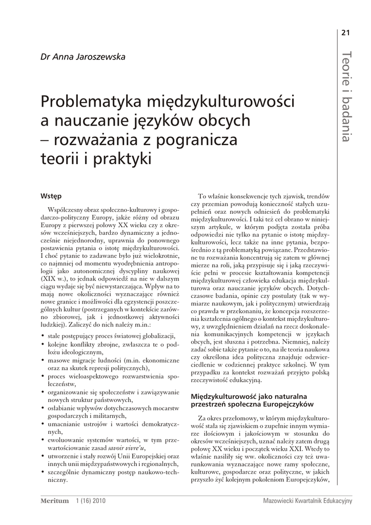 21 Problematyka miêdzykulturowoœci a nauczanie jêzyków obcych... Problematyka miêdzykulturowoœci a nauczanie jêzyków obcych – rozwa¿ania z pogranicza teorii i praktyki Wstêp Współczesny obraz społeczno-kulturowy i gospodarczo-polityczny Europy, jakże różny od obrazu Europy z pierwszej połowy XX wieku czy z okresów wcześniejszych, bardzo dynamiczny a jednocześnie niejednorodny, uprawnia do ponownego postawienia pytania o istotę międzykulturowości. I choć pytanie to zadawane było już wielokrotnie, co najmniej od momentu wyodrębnienia antropologii jako autonomicznej dyscypliny naukowej (XIX w.), to jednak odpowiedź na nie w dalszym ciągu wydaje się być niewystarczająca. Wpływ na to mają nowe okoliczności wyznaczające również nowe granice i możliwości dla egzystencji poszczególnych kultur (postrzeganych w kontekście zarówno zbiorowej, jak i jednostkowej aktywności ludzkiej). Zaliczyć do nich należy m.in.: • stale postępujący proces światowej globalizacji, • kolejne konflikty zbrojne, zwłaszcza te o podłożu ideologicznym, • masowe migracje ludności (m.in. ekonomiczne oraz na skutek represji politycznych), • proces wieloaspektowego rozwarstwienia społeczeństw, • organizowanie się społeczeństw i zawiązywanie nowych struktur państwowych, • osłabianie wpływów dotychczasowych mocarstw gospodarczych i militarnych, • umacnianie ustrojów i wartości demokratycznych, • ewoluowanie systemów wartości, w tym przewartościowanie zasad savoir vivre’u, • utworzenie i stały rozwój Unii Europejskiej oraz innych unii międzypaństwowych i regionalnych, • szczególnie dynamiczny postęp naukowo-techniczny. Meritum 1 (16) 2010 Teorie i badania Dr Anna Jaroszewska To właśnie konsekwencje tych zjawisk, trendów czy przemian powodują konieczność stałych uzupełnień oraz nowych odniesień do problematyki międzykulturowości. I taki też cel obrano w niniejszym artykule, w którym podjęta została próba odpowiedzi nie tylko na pytanie o istotę międzykulturowości, lecz także na inne pytania, bezpośrednio z tą problematyką powiązane. Przedstawione tu rozważania koncentrują się zatem w głównej mierze na roli, jaką przypisuje się i jaką rzeczywiście pełni w procesie kształtowania kompetencji międzykulturowej człowieka edukacja międzykulturowa oraz nauczanie języków obcych. Dotychczasowe badania, opinie czy postulaty (tak w wymiarze naukowym, jak i politycznym) utwierdzają co prawda w przekonaniu, że koncepcja rozszerzenia kształcenia ogólnego o kontekst międzykulturowy, z uwzględnieniem działań na rzecz doskonalenia komunikacyjnych kompetencji w językach obcych, jest słuszna i potrzebna. Niemniej, należy zadać sobie także pytanie o to, na ile teoria naukowa czy określona idea polityczna znajduje odzwierciedlenie w codziennej praktyce szkolnej. W tym przypadku za kontekst rozważań przyjęto polską rzeczywistość edukacyjną. Miêdzykulturowoœæ jako naturalna przestrzeñ spo³eczna Europejczyków Za okres przełomowy, w którym międzykulturowość stała się zjawiskiem o zupełnie innym wymiarze ilościowym i jakościowym w stosunku do okresów wcześniejszych, uznać należy zatem drugą połowę XX wieku i początek wieku XXI. Wtedy to właśnie nasiliły się ww. okoliczności czy też uwarunkowania wyznaczające nowe ramy społeczne, kulturowe, gospodarcze oraz polityczne, w jakich przyszło żyć kolejnym pokoleniom Europejczyków, Mazowiecki Kwartalnik Edukacyjny 22 Dr Anna Jaroszewska Teorie i badania w tym Polakom. Pod wpływem tych różnych przecież czynników istotnym przeobrażeniom uległy również relacje międzyludzkie. Zmiany te z jednej strony dotyczyły komunikacji wewnętrznej, a więc takiej, która przebiega w ramach jednej grupy społecznej np.: w rodzinie, w klasie szkolnej, w grupie pracowniczej, ale też pomiędzy osobami tej samej narodowości czy grupy etnicznej o wspólnych bądź bardzo zbliżonych cechach dystynktywnych. Z drugiej strony zmiana owych relacji uwidoczniła się również na etapie komunikacji stricte transgranicznej lub transkulturowej, a więc przebiegającej pomiędzy wyraźnie różnymi grupami społecznymi, reprezentującymi często nie tylko odmienne kultury czy religie, lecz także nacje, zaś przede wszystkim różny język. Intensywny przyrost wiedzy na temat życia człowieka jako indywidualności, jednak z natury predestynowanego do życia w grupie społecznej, czy już sam fakt umocnienia się podstawowych wartości etycznych realizowanych na gruncie współczesnych systemów demokratycznych w dużym stopniu ułatwił rozróżnienie tych kategorii społeczno-kulturowych (wielo- i międzykulturowości). Przede wszystkim możliwe stało się bliższe poznanie tej drugiej, co najmniej dwuwymiarowej przestrzeni życia, jaką jest naznaczona zmianami współczesności międzykulturowość – rozpatrywana tu jako wewnątrzgrupowy oraz międzygrupowy dialog. Upraszczając, można przyjąć, że międzykulturowość jest zjawiskiem odmiennym od wielokulturowości, choć niewątpliwie z pluralizmu się wywodzącym. Podstawowym warunkiem zaistnienia międzykulturowości jest wielostronna interakcja społeczna, opierająca się na podmiotowej aktywności wynikającej z ludzkich potrzeb tak typowo egzystencjalnych (pierwszego rzędu), jak i poznawczych (włącznie z potrzebą samorealizacji). Natomiast wielokulturowość cechuje raczej zasada jednostronnych wpływów kultury dominującej na kulturę o mniejszym zasięgu oddziaływania lub też zasada reakcji ograniczonej, często jednostronnej, okazjonalnej, a nawet wymuszonej. O ile istotą międzykulturowości jest więc dialog i współpraca, a przede wszystkim chęć wzajemnego poznania, zrozumie- nia i ubogacania przedstawicieli różnych kultur, to wielokulturowość wyraża bardziej stan „bycia obok siebie”. W rozważaniach na temat możliwych relacji między kulturami w