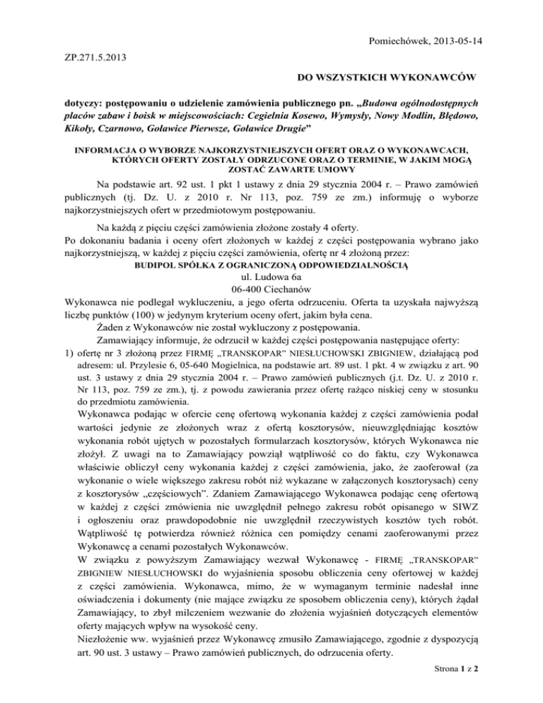 Pomiechówek, 2013-05-14 ZP.271.5.2013 DO WSZYSTKICH WYKONAWCÓW dotyczy: postępowaniu o udzielenie zamówienia publicznego pn. „Budowa ogólnodostępnych placów zabaw i boisk w miejscowościach: Cegielnia Kosewo, Wymysły, Nowy Modlin, Błędowo, Kikoły, Czarnowo, Goławice Pierwsze, Goławice Drugie” INFORMACJA O WYBORZE NAJKORZYSTNIEJSZYCH OFERT ORAZ O WYKONAWCACH, KTÓRYCH OFERTY ZOSTAŁY ODRZUCONE ORAZ O TERMINIE, W JAKIM MOGĄ ZOSTAĆ ZAWARTE UMOWY Na podstawie art. 92 ust. 1 pkt 1 ustawy z dnia 29 stycznia 2004 r. – Prawo zamówień publicznych (tj. Dz. U. z 2010 r. Nr 113, poz. 759 ze zm.) informuję o wyborze najkorzystniejszych ofert w przedmiotowym postępowaniu. Na każdą z pięciu części zamówienia złożone zostały 4 oferty. Po dokonaniu badania i oceny ofert złożonych w każdej z części postępowania wybrano jako najkorzystniejszą, w każdej z pięciu części zamówienia, ofertę nr 4 złożoną przez: BUDIPOL SPÓŁKA Z OGRANICZONĄ ODPOWIEDZIALNOŚCIĄ ul. Ludowa 6a 06-400 Ciechanów Wykonawca nie podlegał wykluczeniu, a jego oferta odrzuceniu. Oferta ta uzyskała najwyższą liczbę punktów (100) w jedynym kryterium oceny ofert, jakim była cena. Żaden z Wykonawców nie został wykluczony z postępowania. Zamawiający informuje, że odrzucił w każdej części postępowania następujące oferty: 1) ofertę nr 3 złożoną przez FIRMĘ „TRANSKOPAR” NIESŁUCHOWSKI ZBIGNIEW, działającą pod adresem: ul. Przylesie 6, 05-640 Mogielnica, na podstawie art. 89 ust. 1 pkt. 4 w związku z art. 90 ust. 3 ustawy z dnia 29 stycznia 2004 r. – Prawo zamówień publicznych (j.t. Dz. U. z 2010 r. Nr 113, poz. 759 ze zm.), tj. z powodu zawierania przez ofertę rażąco niskiej ceny w stosunku do przedmiotu zamówienia. Wykonawca podając w ofercie cenę ofertową wykonania każdej z części zamówienia podał wartości jedynie ze złożonych wraz z ofertą kosztorysów, nieuwzględniając kosztów wykonania robót ujętych w pozostałych formularzach kosztorysów, których Wykonawca nie złożył. Z uwagi na to Zamawiający powziął wątpliwość co do faktu, czy Wykonawca właściwie obliczył ceny wykonania każdej z części zamówienia, jako, że zaoferował (za wykonanie o wiele większego zakresu robót niż wykazane w załączonych kosztorysach) ceny z kosztorysów „częściowych”. Zdaniem Zamawiającego Wykonawca podając cenę ofertową w każdej z części zmówienia nie uwzględnił pełnego zakresu robót opisanego w SIWZ i ogłoszeniu oraz prawdopodobnie nie uwzględnił rzeczywistych kosztów tych robót. Wątpliwość tę potwierdza również różnica cen pomiędzy cenami zaoferowanymi przez Wykonawcę a cenami pozostałych Wykonawców. W związku z powyższym Zamawiający wezwał Wykonawcę - FIRMĘ „TRANSKOPAR” ZBIGNIEW NIESŁUCHOWSKI do wyjaśnienia sposobu obliczenia ceny ofertowej w każdej z części zamówienia. Wykonawca, mimo, że w wymaganym terminie nadesłał inne oświadczenia i dokumenty (nie mające związku ze sposobem obliczenia ceny), których żądał Zamawiający, to zbył milczeniem wezwanie do złożenia wyjaśnień dotyczących elementów oferty mających wpływ na wysokość ceny. Niezłożenie ww. wyjaśnień przez Wykonawcę zmusiło Zamawiającego, zgodnie z dyspozycją art. 90 ust. 3 ustawy – Prawo zamówień publicznych, do odrzucenia oferty. Strona 1 z 2 Z uwagi na powyższe należało odrzucić ofertę FIRMY „TRANSKOPAR” NIESŁUCHOWSKI ZBIGNIEW, działającą pod adresem: ul. Przylesie 6, 05-640 Mogielnica złożoną na część I, II, III, IV i V zamówienia. 2) ofertę nr 1 złożoną przez SATERNUS DISTRIBUTION SPÓŁKA Z OGRANICZONĄ ODPOWIEDZIALNOŚCIĄ SPÓŁKA KOMANDYTOWA, działającą pod adresem: ul. Nowa 32, 41500 Chorzów, na podstawie art. 89 ust. 1 pkt. 2 ustawy z dnia 29 stycznia 2004 r. – Prawo zamówień publicznych (j.t. Dz. U. z 2010 r. Nr 113, poz. 759 ze zm.) tj. ponieważ treść oferty nie odpowiadała treści specyfikacji istotnych warunków zamówienia, tj. nie posiadała karty technicznej oferowanej nawierzchni, potwierdzonej przez jej producenta, oraz nie zawierała autoryzacji producenta trawy syntetycznej, wystawionej dla Wykonawcy na realizowaną inwestycję wraz z potwierdzeniem gwarancji udzielonej przez producenta na tę nawierzchnię. Oferta firmy SATERNUS DISTRIBUTION SPÓŁKA Z OGRANICZONĄ ODPOWIEDZIALNOŚCIĄ SPÓŁKA KOMANDYTOWA została odrzucona w każdej z pięciu części postępowania z uwagi na to co poniżej. Opierając się na dokumentach złożonych wraz z ofertą oraz w odpowiedzi na dwukrotne wezwanie Wykonawcy do złożenia wyjaśnień i prawidłowych dokumentów Zamawiający stwierdził, że: - w ateście higienicznym oferowanej trawy oraz w jej karcie technicznej wykazani zostali dwaj różni producenci trawy, tj. Pietro Radici Tappetificio S.P.A, Via Cav. Pietro Radici 19, 24020 CAZZANO S. ANDREA (GB) ITALY oraz Radici Pietro Industries & Brands S.p.A, 24020 Cazzano S. Andrea (GB), Via Cav. Radici 19, Włochy; - w karcie technicznej trawy jako producent widnieje Pietro Radici Tappetificio S.P.A, Via Cav. Pietro Radici 19, 24020 CAZZANO S. ANDREA (GB) ITALY; - firma Sit-in Poland Sp. z o. o. z siedzibą w Rudzie Śląskiej może reprezentować jedynie Radici Pietro Industries & Brands S.p.A, 24020 Cazzano S. Andrea (GB), Via Cav. Radici 19, Włochy, a nie Pietro Radici Tappetificio S.P.A, Via Cav. Pietro Radici 19, 24020 CAZZANO S. ANDREA (GB) ITALY, który został wskazany w karcie technicznej trawy jako jej producent i w związku z tym, że firma Sit-in Poland Sp. z o. o. nie posiada upoważnienia do występowania w imieniu Pietro Radici Tappetificio S.P.A, to nie może potwierdzać za nią dokumentów. Z uwagi na to, że Wykonawca nie dostarczył wymaganych w SIWZ dokumentów na dowód, że oferowane roboty budowlane odpowiadają określonym wymaganiom, Zamawiający odrzucił ofertę nr 1 złożoną na część I, II, III, IV i V zamówi