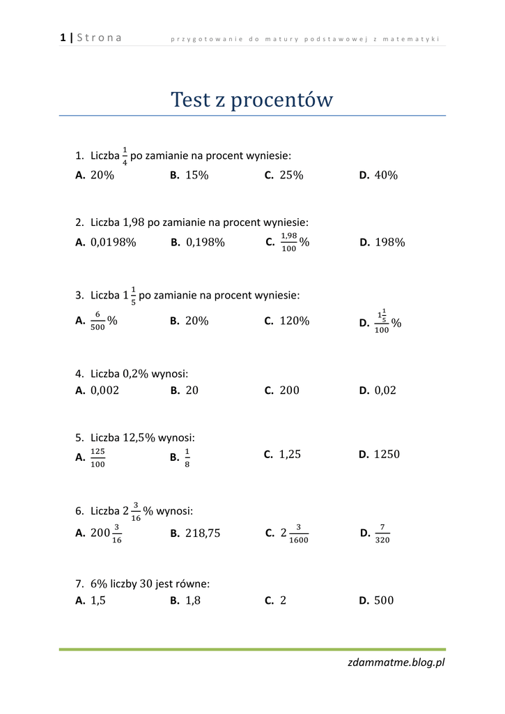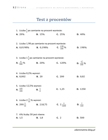 1|Strona przygotowanie do matury podstawowej z matematyki Test z procentów 1. Liczba po zamianie na procent wyniesie: A. B. 2. Liczba A. A. 5. Liczba 6. Liczba A. 7. A. wynosi: B. C. D. C. D. C. D. C. D. C. D. wynosi: B. liczby D. wynosi: B. A. C. po zamianie na procent wyniesie: B. 4. Liczba A. D. po zamianie na procent wyniesie: B. 3. Liczba C. jest równe: B. zdammatme.blog.pl 2|Strona 8. A. przygotowanie do matury podstawowej z matematyki liczby jest równe: B. 9. Wskaż liczbę, której A. B. liczby 12. Jeżeli A. D. jest równe : C. jest równe , zatem: B. liczby D. jest równe : C. 10. Wskaż liczbę, której A. B. 11. A. C. jest równe B. D. C. D. , to: D. C. 13. Liczba A. to liczby . Wynika stąd, że: B. C. 14. Liczba A. stanowi B. liczby . Zatem: C. D. 15. Liczba A. stanowi B. liczby . Wówczas: C. D. 16. Wyznacz, jakim procentem liczby A. 64% B. jest liczba C. D. : D. zdammatme.blog.pl 3|Strona przygotowanie do matury podstawowej z matematyki 17. Wyznacz, jakim procentem liczby A. B. jest liczba : C. D. 18. Liczba A. C. D. 19. Liczba o 20% mniejsza od 150 wynosi: A. B. C. D. 20. Liczba o 13% większa od 130 wynosi: A. B. C. D. 21. Jeżeli liczba 78 jest o 50% większa od liczby , to: A. B. C. D. 22. Liczba A. D. to liczby B. jest o B. , zatem: większa od liczby . Zatem: C. 23. Suma liczby i 15% tej liczby jest równa 230. Równaniem opisującym tę zależność jest: A. B. C. D. 24. Jedna liczba stanowi stanowi: A. pierwszej liczby C. pierwszej liczby drugiej liczby. Wynika z tego, że druga liczba B. D. pierwszej liczby pierwszej liczby zdammatme.blog.pl 4|Strona przygotowanie do matury podstawowej z matematyki 25. Gdy od 17% liczby 21 odejmiemy 21% liczby 17, to otrzymamy: A. C. D. B. 26. Rower kosztował wynosi: A. B. . Jego cenę obniżono o C. 27. W klasie jest dziewcząt i stanowią chłopcy? A. B. około 28. Na zebraniu było stanowiły kobiety? A. B. . Cena po obniżce D. chłopców. Ile procent uczniów w klasie C. mężczyzn i C. D. kobiet. Ile procent zebranych D. około 29. W pewnym mieście w Polsce mieszka ludzi, przy czym z nich stanowią kobiety. Oblicz ilu mężczyzn mieszka w tym miasteczku. A. B. C. D. 30. Pani Krysia w zeszłym miesiącu przekazała na cele charytatywne swoich dochodów netto. Oblicz, jaka była to kwota, jeśli w zeszłym miesiącu pensja netto pani Krysi wyniosła . A. B. C. D. 31. Długopis kosztował obniżce kosztował: A. B. . Następnie jego cenę obniżono o C. . Po D. zdammatme.blog.pl 5|Strona przygotowanie do matury podstawowej z matematyki 32. Zysk sprzedawcy stanowi ceny sprzedawanych towarów. Aby zarobić dokładnie , sprzedawca ten musi sprzedać towar za: A. B. C. D. 33. Oprocentowanie oszczędności wnosi w stosunku rocznym. Ile złotych trzeba wpłacić na konto, aby po roku mieć na koncie (wraz z odsetkami) ? A. B. około C. około D. 34. Oprocentowanie rocznej lokaty w pewnym banku jest równe . Chcąc mieć po roku wraz z odsetkami na koncie należy wpłacić na lokatę kwotę: A. B. C. D. 35. Paweł ma , a Gaweł o Gaweł razem? A. B. pieniędzy mniej. Ile złotych mają Paweł i C. D. 36. Marża równa kwoty pożyczonego kapitału była równa Wynika stąd, że pożyczono: A. B. C. D. 37. Cena bez podatku VAT jest równa VAT w wysokości kosztuje: A. B. C. . . Towar ten wraz z podatkiem D. 38. Julia połowę swoich oszczędności przeznaczyła na prezent dla Maćka. tego, co jej zostało, przeznaczyła na prezent dla Dominiki. Ile procent oszczędności pozostało Julii? A. B. C. D. zdammatme.blog.pl 6|Strona przygotowanie do matury podstawowej z matematyki 39. W głosowaniu na ustawą wzięło udział posłów. Za przyjęciem ustawy było biorących udział w głosowaniu parlamentarzystów. Zatem za przyjęciem ustawy głosowało: A. posłów B. posłów C. posłów D. posłów 40.W minionym roku w pewnym liceum maturzystów nie zdawało matury z biologii. Na maturze biologię zdawało osób. Wobec tego w minionym roku maturę w tej szkole zdawało: A. mniej niż sto osób B. osób C. osób D. więcej niż osób 41. Zmieszano litrów mleka o zawartości tłuszczu i litrów mleka o zawartości tłuszczu. Otrzymano mleko o zawartości tłuszczu: A. B. C. D. 42. Cenę pewnego towaru obniżono najpierw o Zatem cenę towaru obniżono o: A. B. C. , a potem o . D. 43. Cenę butów obniżono o , a po miesiącu dalszą cenę podwyższono o . W wyniku obu obniżek cena butów: C. nie zmieniła się D. wzrosła o A. wzrosła o B. zmalała o 44. Początkową cenę towaru obniżono o , a potem podwyższono o . Po tych dwóch zmianach: A. cena nie zmieniła się B. cena końcowa jest wyższa do ceny początkowej C. cena końcowa jest niższa od ceny początkowej D. cena końcowa stanowi ceny początkowej zdammatme.blog.pl 7|Strona przygotowanie do matury podstawowej z matematyki 45. Cenę towaru podwyższono najpierw o , a potem jeszcze raz o . O ile należałoby podwyższyć od razu cenę tego towaru, aby otrzymać ten sam rezultat co po przeprowadzeniu obu podwyżek? A. o B. o C. o D. o 46. Chleb kosztował najpierw , a następnie podrożał o . O ile procent trzeba teraz zmniejszyć jego cenę, aby wróciła do pierwotnej wysokości? A. o około B. o około C. o D. o 47.Klasa liczy chłopców i liczby chłopców o: A. B. dziewcząt. Liczba dziewcząt jest mniejsza od C. D. 48. Długopis kosztuje , a zeszyt . Które zdanie jest fałszywe? A. zeszyt jest tańszy od długopisu o B. długopis jest droższy od zeszytu o C. długopis jest droższy od zeszytu o D. cena zeszytu stanowi ceny długopisu 49. Kobiety żyją w Polsce średnio lat, a mężczyźni A. kobiety żyją o około dłużej od mężczyzn B. mężczyźni żyją o około krócej od kobiet C. obydwie powyższe odpowiedzi są poprawne D. żadna z powyższych odpowiedzi nie jest poprawna lat. Wobec tego: 50. W pierwszej części zbioru maturalnego zamieszczono zadań, a w drugiej zadań. Liczba zadań w drugiej części jest większa od liczby zadań w pierwszej czę
