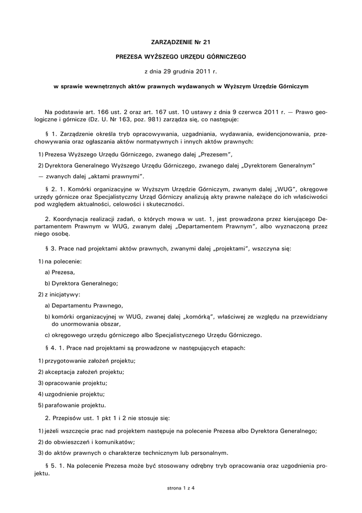 ZARZĄDZENIE Nr 21 PREZESA WYŻSZEGO URZĘDU GÓRNICZEGO z dnia 29 grudnia 2011 r. w sprawie wewnętrznych aktów prawnych wydawanych w Wyższym Urzędzie Górniczym Na podstawie art. 166 ust. 2 oraz art. 167 ust. 10 ustawy z dnia 9 czerwca 2011 r. — Prawo geologiczne i górnicze (Dz. U. Nr 163, poz. 981) zarządza się, co następuje: § 1. Zarządzenie określa tryb opracowywania, uzgadniania, wydawania, ewidencjonowania, przechowywania oraz ogłaszania aktów normatywnych i innych aktów prawnych: 1) Prezesa Wyższego Urzędu Górniczego, zwanego dalej „Prezesem”, 2) Dyrektora Generalnego Wyższego Urzędu Górniczego, zwanego dalej „Dyrektorem Generalnym” — zwanych dalej „aktami prawnymi”. § 2. 1. Komórki organizacyjne w Wyższym Urzędzie Górniczym, zwanym dalej „WUG”, okręgowe urzędy górnicze oraz Specjalistyczny Urząd Górniczy analizują akty prawne należące do ich właściwości pod względem aktualności, celowości i skuteczności. 2. Koordynacja realizacji zadań, o których mowa w ust. 1, jest prowadzona przez kierującego Departamentem Prawnym w WUG, zwanym dalej „Departamentem Prawnym”, albo wyznaczoną przez niego osobę. § 3. Prace nad projektami aktów prawnych, zwanymi dalej „projektami”, wszczyna się: 1) na polecenie: a) Prezesa, b) Dyrektora Generalnego; 2) z inicjatywy: a) Departamentu Prawnego, b) komórki organizacyjnej w WUG, zwanej dalej „komórką”, właściwej ze względu na przewidziany do unormowania obszar, c) okręgowego urzędu górniczego albo Specjalistycznego Urzędu Górniczego. § 4. 1. Prace nad projektami są prowadzone w następujących etapach: 1) przygotowanie założeń projektu; 2) akceptacja założeń projektu; 3) opracowanie projektu; 4) uzgodnienie projektu; 5) parafowanie projektu. 2. Przepisów ust. 1 pkt 1 i 2 nie stosuje się: 1) jeżeli wszczęcie prac nad projektem następuje na polecenie Prezesa albo Dyrektora Generalnego; 2) do obwieszczeń i komunikatów; 3) do aktów prawnych o charakterze technicznym lub personalnym. § 5. 1. Na polecenie Prezesa może być stosowany odrębny tryb opracowania oraz uzgodnienia projektu. strona 1 z 4 2. W przypadku, o którym mowa w ust. 1, projekty przed przedłożeniem Prezesowi albo Dyrektorowi Generalnemu do akceptacji wymagają zaparafowania przez Departament Prawny oraz akceptacji Wiceprezesów WUG. § 6. 1. Założenia projektu aktu prawnego, zwane dalej „założeniami”, zawierające propozycje rozwiązań merytorycznych z uzasadnieniem, przygotowuje komórka właściwa ze względu na przewidziany do unormowania obszar. 2. Założenia sporządza się, uwzględniając następujące elementy: 1) podstawę prawną przygotowania założeń; 2) podstawę prawną przygotowania projektu opartego na założeniach; 3) przyczyny podjęcia prac nad projektem; 4) propozycje rozwiązań merytorycznych z uzasadnieniem; 5) skutki wejścia w życie nowej regulacji prawnej. 3. Jeżeli zakres regulacji projektu będzie dotyczył kilku komórek, założenia opracowuje komórka w największym stopniu właściwa ze względu na przewidziany do unormowania obszar; komórka ta jest wówczas komórką wiodącą. 4. W przypadku sporu dotyczącego właściwości, Dyrektor Generalny wskazuje komórkę wiodącą. 5. W przypadku zarządzeń w sprawie regulaminów organizacyjnych urzędów górniczych komórką wiodącą jest Departament Prawny. 6. Prezes może powołać zespół do opracowania założeń, jeżeli zakres regulacji projektu będzie dotyczył kilku komórek, a nie jest możliwe ustalenie albo wskazanie komórki wiodącej. 7. Departament Prawny, na wniosek komórki albo zespołu, wydaje opinię dotyczącą potrzeby wydania aktu prawnego. § 7. 1. Akceptacji założeń dokonuje, na wniosek komórki albo zespołu, Prezes albo Dyrektor Generalny, w zależności od tego, który podmiot wyda akt prawny. 2. Do wniosku, o którym mowa w ust. 1, załącza się opinię, o której mowa w § 6 ust. 7. 3. Akceptacja założeń stanowi równocześnie polecenie opracowania projektu. § 8. 1. Projekt opracowuje się: 1) zgodnie z obowiązującymi zasadami techniki prawodawczej; 2) zgodnie z obowiązującymi wymaganiami technicznymi dla dokumentów elektronicznych zawierających akty prawne. 2. Kolejne wersje projektu oznacza się przez zamieszczenie na nich daty opracowania. 3. Strony projektu są: 1) parafowane przez kierującego Departamentem Prawnym albo wyznaczoną przez niego osobę; 2) numerowane w sposób odzwierciedlający całkowitą liczbę stron projektu oraz numer strony bieżącej projektu. § 9. 1. Departament Prawny, w terminie 14 dni od dnia akceptacji założeń albo wydania przez Prezesa lub Dyrektora Generalnego polecenia opracowania projektu, opracowuje projekt i kieruje go, drogą elektroniczną, do: 1) komórek; strona 2 z 4 2) okręgowych urzędów górniczych oraz Specjalistycznego Urzędu Górniczego, jeśli zakres regulacji projektu obejmuje sprawy będące we właściwości tych urzędów; 3) związków zawodowych działających w urzędach górniczych, w przypadkach wskazanych w przepisach powszechnie obowiązujących. 2. Przedstawienie stanowiska wobec projektu następuje w postaci elektronicznej, w formie wskazanej przez Departament Prawny, w terminie 14 dni od dnia jego otrzymania. § 10. 1. Departament Prawny, po zgromadzeniu stanowisk zgłoszonych wobec projektu, dokonuje ich analizy oraz przygotowuje nową wersję projektu w terminie 14 dni od dnia wyznaczonego jako termin na zajęcie stanowiska przez komórki, a następnie, łącznie z zestawieniem stanowisk, przekazuje ją do komórek w celu zaparafowania. 2. W przypadku powstania rozbieżności Departament Prawny dąży do ich usunięcia w porozumieniu z komórkami, w szczególności organizując oraz prowadząc spotkanie uzgodnieniowe, a następnie przygotowuje w terminie 14 dni od dnia tego spotkania nową wersję projektu oraz, łącznie z zestawieniem stanowisk, przekazuje ją do komó